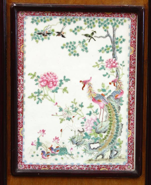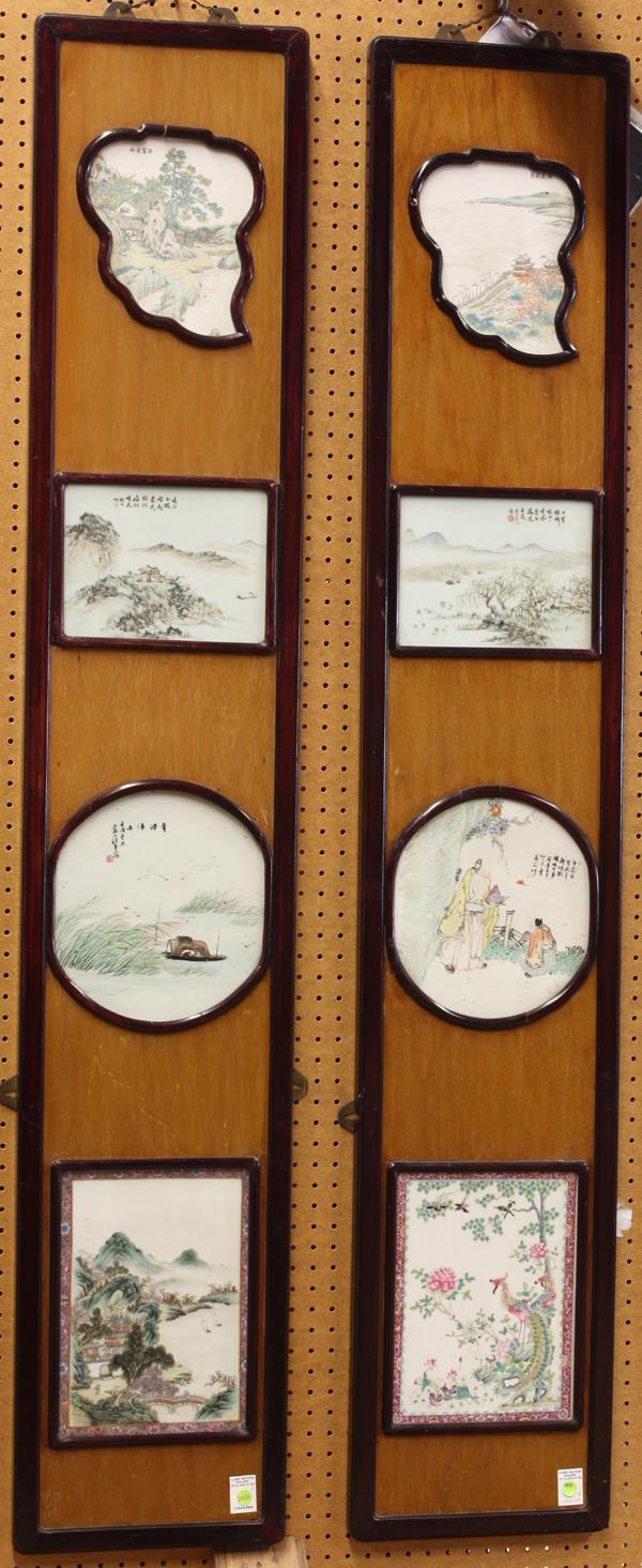 Pair of Chinese wooden panels with polychrome enameled porcelain plaques, late Qing/Republic period, the first panel with the upper plaque set within a leaf-form frame accenting a scene of stream running by a rustic villa and entitled 'bei chuan gao wo', the second plaque depicting a pavilion on a mountain peak in pale enamels along with an poetic inscription, signed 'Cheng Men' (1833-1908), the next a circular plaque with a boat amid wind blown reeds entitled '[Lu] gang ting zhou' (=boat moored in reed harbor), with the cyclical date 'renxu' winter (=1862/1922) and singed 'Wang Nian', sealed 'Wang yin', the last vividly enameled with pavilions along a river bank backed by green mountains and set within a pink ground floral band; the second wooden panel with the upper leaf-form plaque featuring a city wall along side a lake entitled 'Dongting qiu yue', the second a rectangular panel decorated with rustic dwellings shaded by willows, inscribed with a poetic colophon, signed 'Li daoren' (=Cheng Men) with a painted cartouche, the third a circular plaque featuring Shoulao holding a peach and accompanied by an attendant, with the cyclical date 'xinmao' (=1891/1951) and signed 'Pan Xiaoshan', the last brightly depicting a pair of birds including phoenix, Mandarin ducks, cranes, swallows amid peonies and trees, each overall 72''h x 13.25''; largest plaque 12''h x 9''w; Provenance: ex-collection of Mrs. Woo Chen Zon Yin, purchased at Sotheby Parke Bernet, Hong Kong, November 4, 1974, lot #335, by Reynold Tom of Oakland, now offered by his family