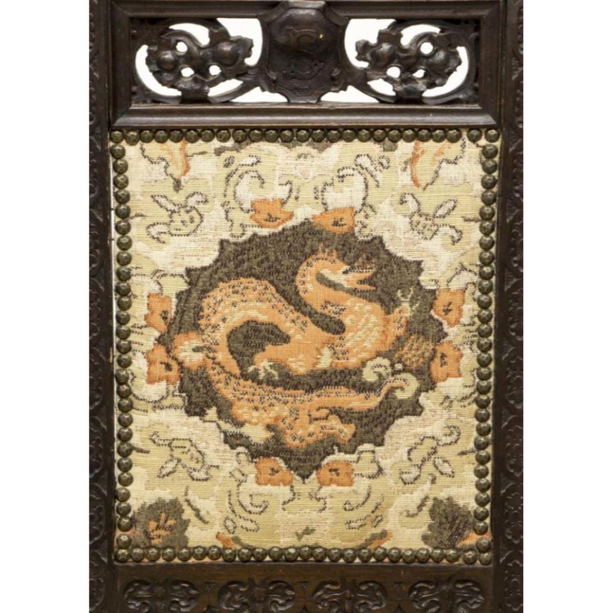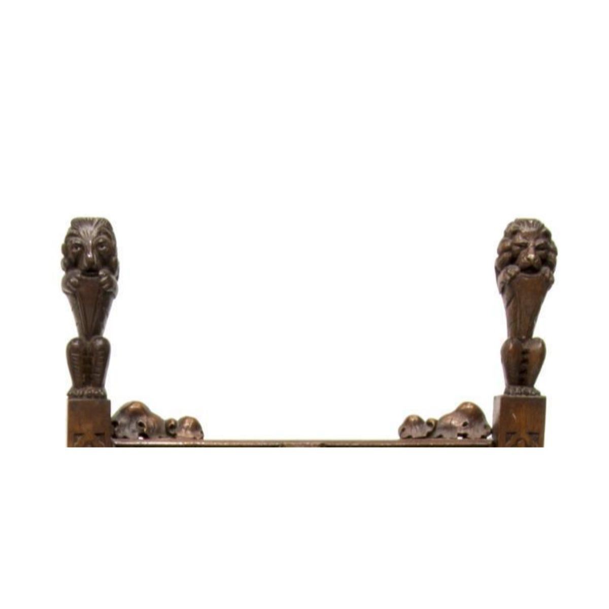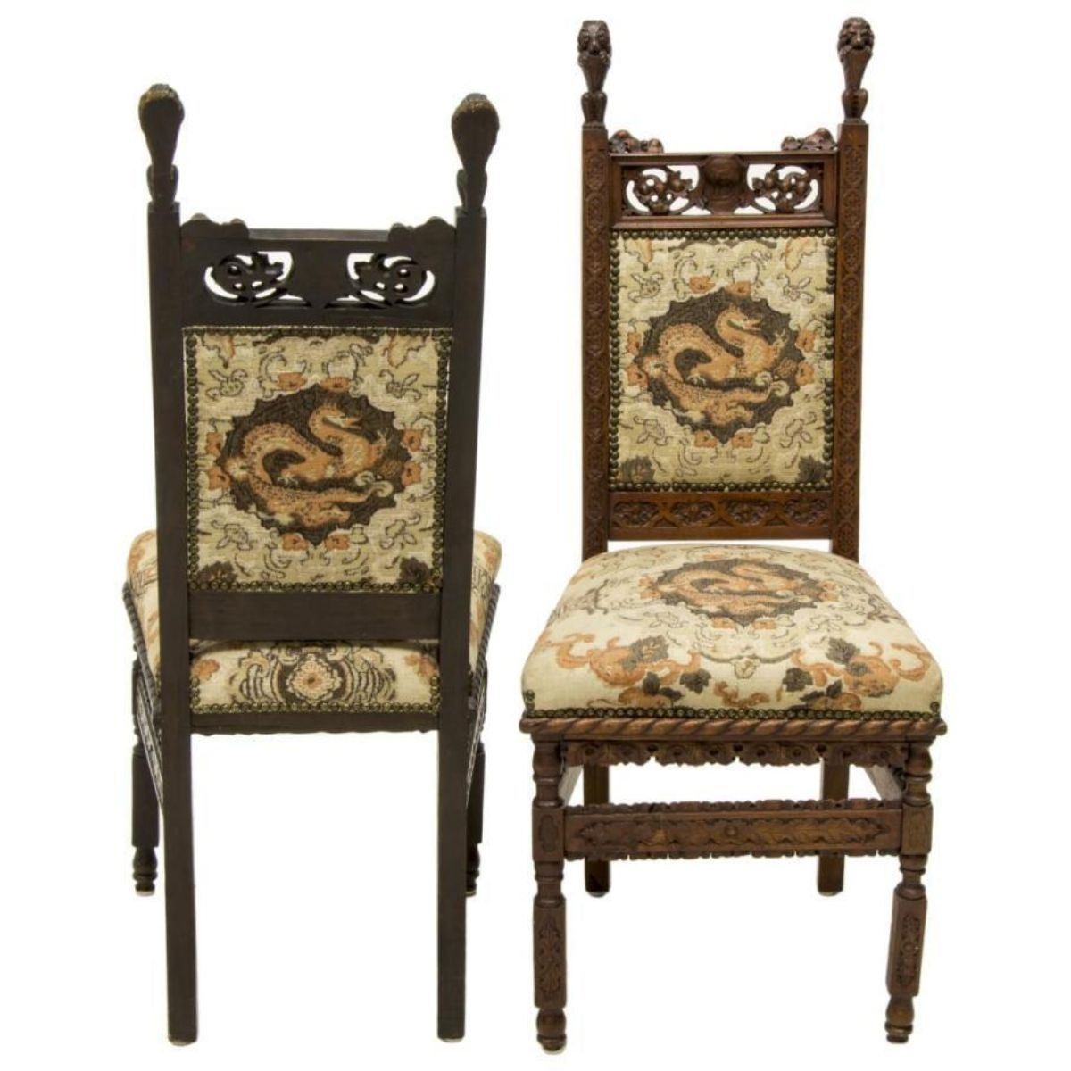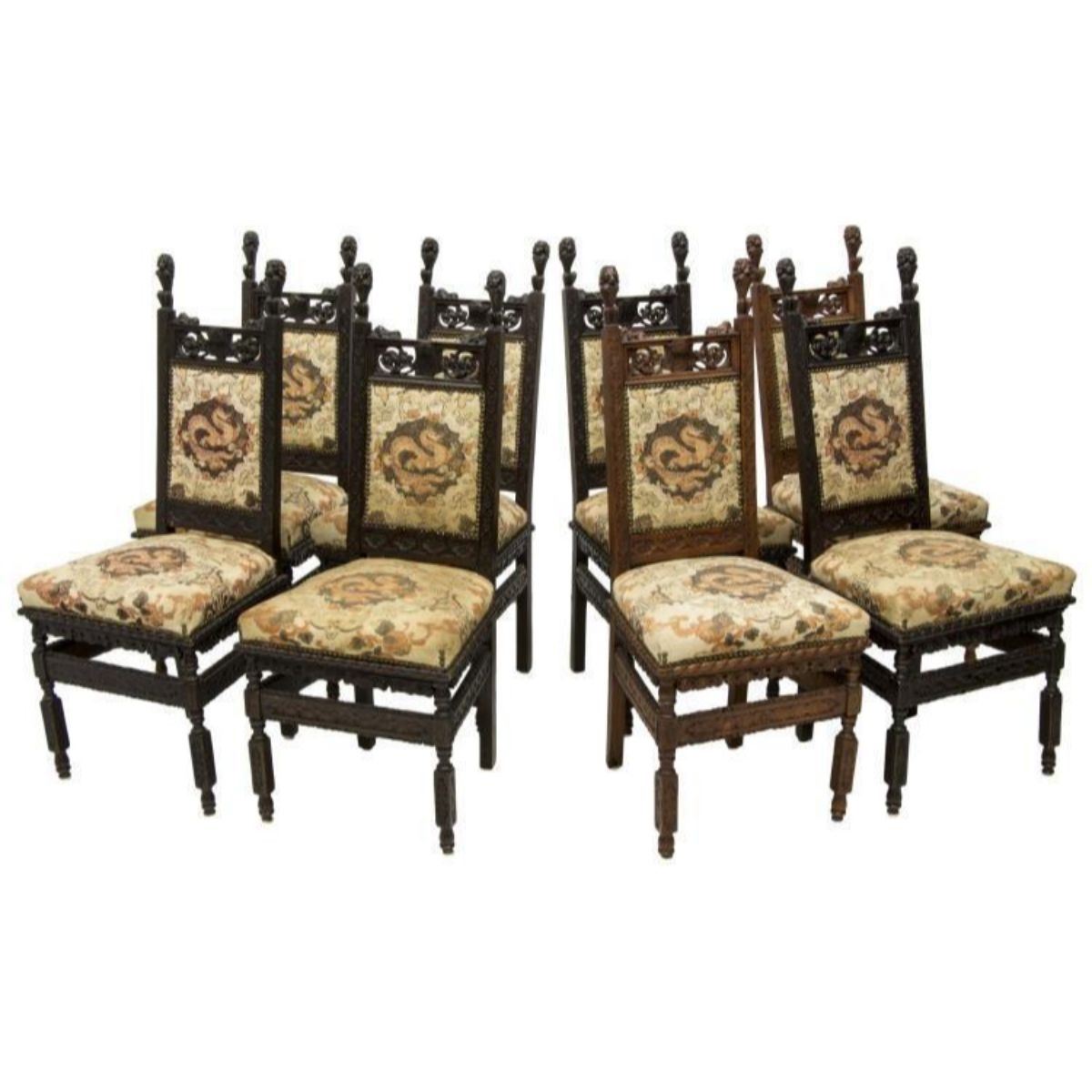 19th Century Continental Gothic Revival side chairs, group of 8, with figural finial of lion holding shield, over pierced top rail with carved foliates & central cartouche with initial, ( three ) with 'S' initial, ( five ) with 'B' initial, upholstered back & seat in faux tapestry textile held with brass tacks, over carved foliate skirt, rising on turned front legs, joined by carved box stretcher, ( two ) in a lighter finish, approx 46"H, 19.5"W, 17.5"D. ** the stain color on some chairs are lighter than others. 9237-021818-IN-832