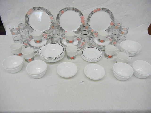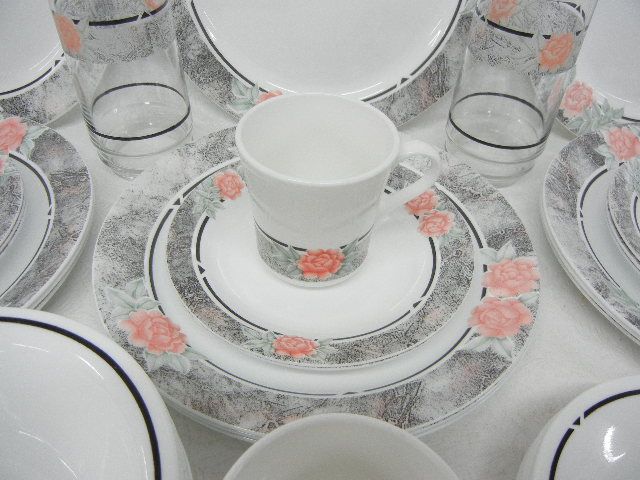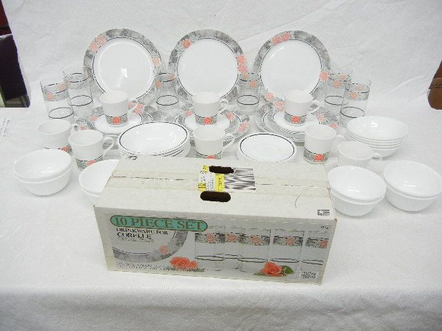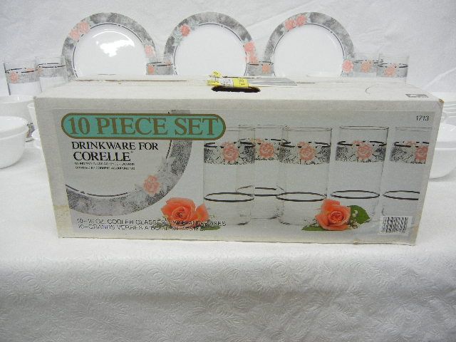 Set of Corelle Dishes 12 dinner plates, 10 salad Plates, 7 soup bowls, 8 cups & saucers, 8 dessert bowls, 16 glasses
