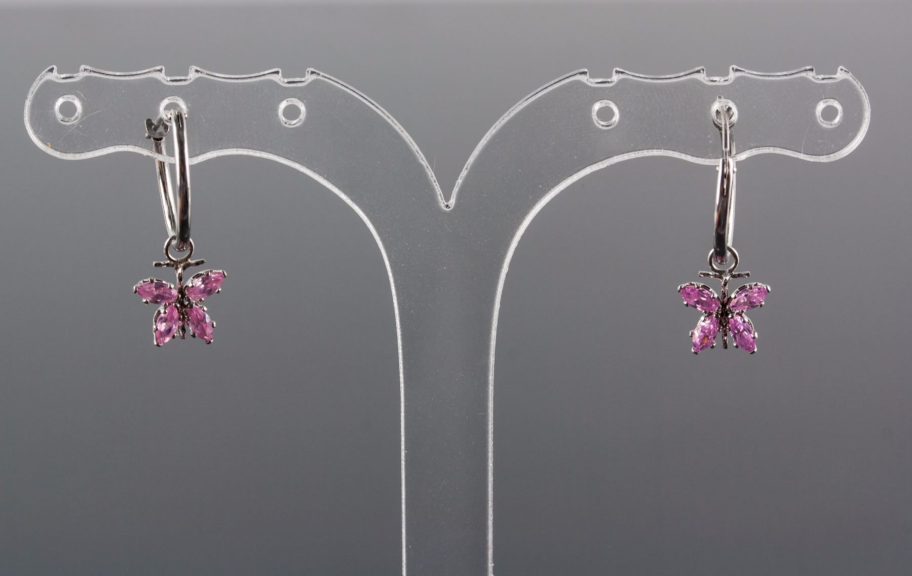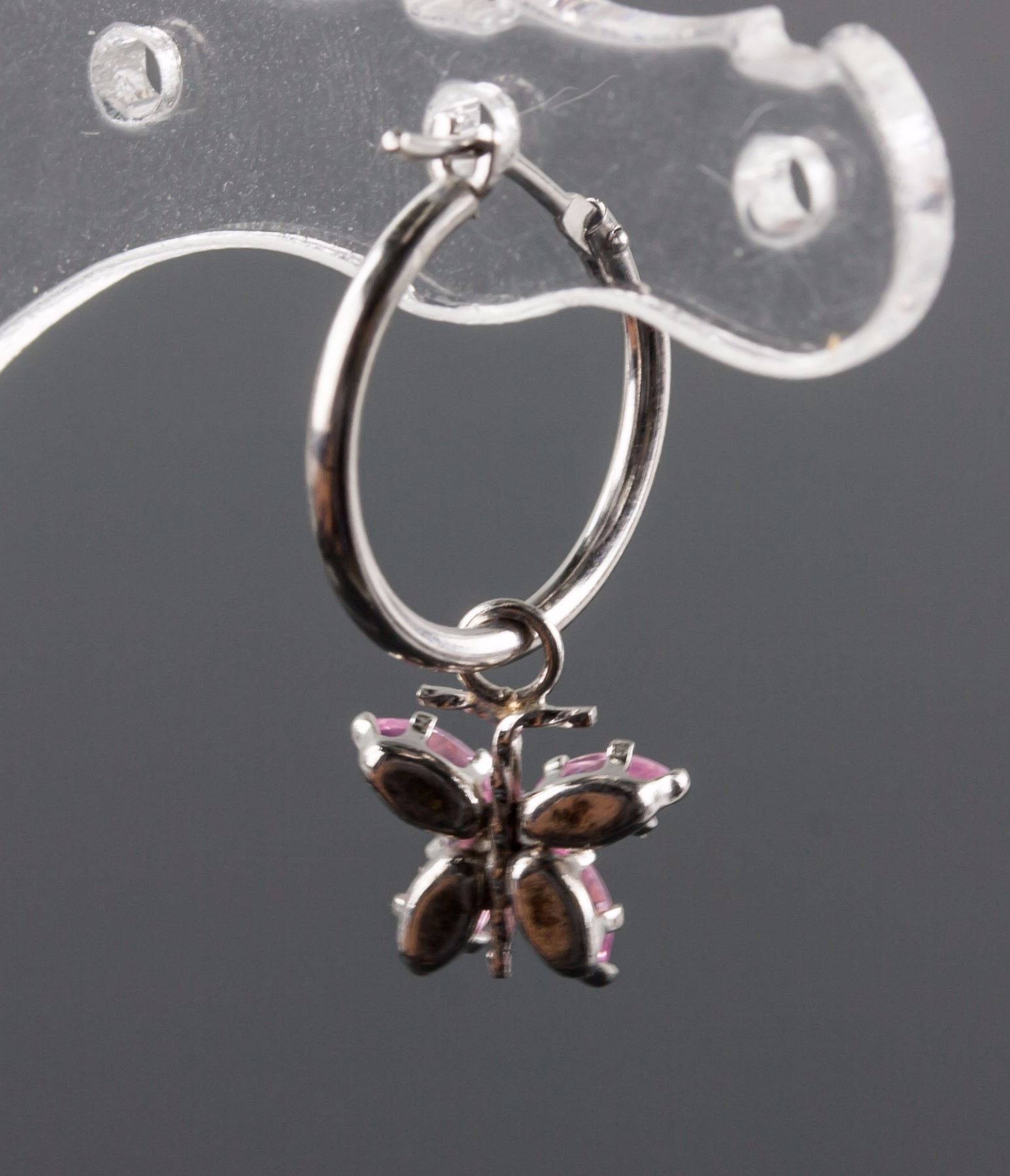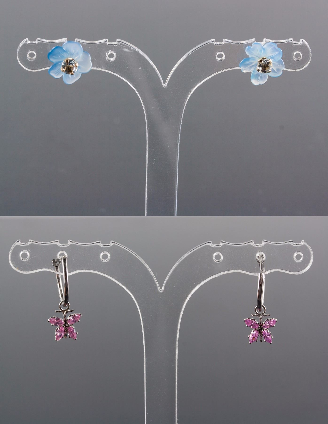 Stamped 14k white gold hopp earrings; set with pink cubic zirconia; retail value $400; Stamped 10k yellow gold earrings; set with aquamarine and chalcedony; retail value $300