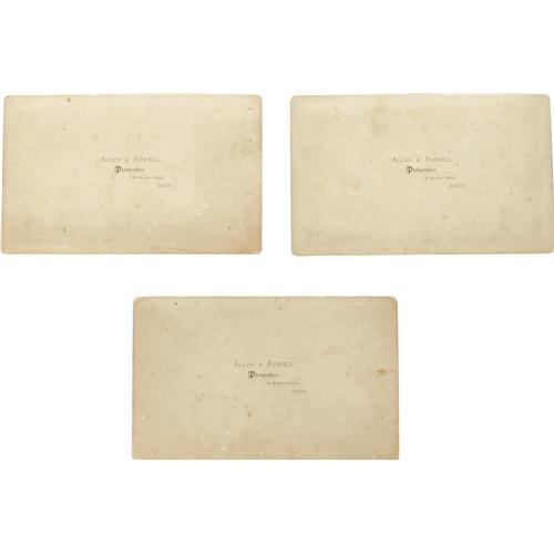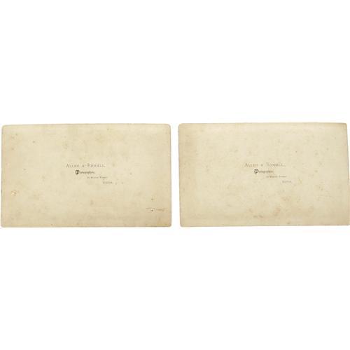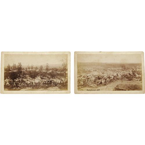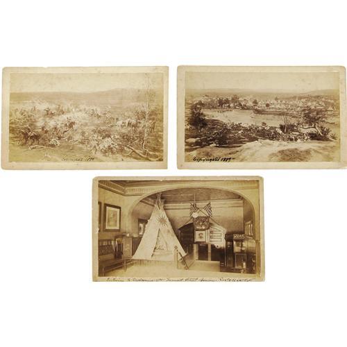 <B>Set of Custer's Last Stand Cabinet Cards</B></I> from the Boston Cyclorama, 1889. Five slightly oversize, 8.5" x 5.25", cabinet images, each with an Allen & Rowell backmark. The Cyclorama, built in 1884, originally housed the huge and terribly realistic mural of Gettysburg by Paul D. Philippoteaux. As the Civil War exhibit's popularity declined, it was replaced in 1889 by a similar painting showing the 1876 Battle of the Little Big Horn. These scarce photographs document the new mural's opening at the Cyclorama. Of these images, four are combat scenes showing thinning ranks of blue-clad cavalrymen being swept away by a Sioux tidal wave. The fifth scene is of the Cyclorama foyer, which contains portraits of Custer, a teepee, and a ticket booth. The images are aged as expected. Minor chipping and stains are present, but do not detract from the overall appeal of these items.