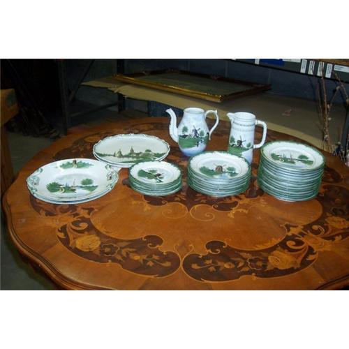 Set of 4 serving dishes, 6 small plates and 22 larger plates "Delft" c.1930 Water pitcher. Tea pot has hairline damage.
