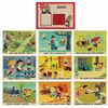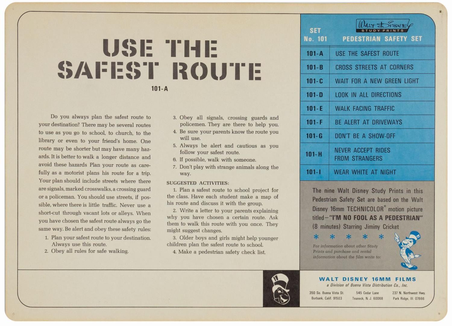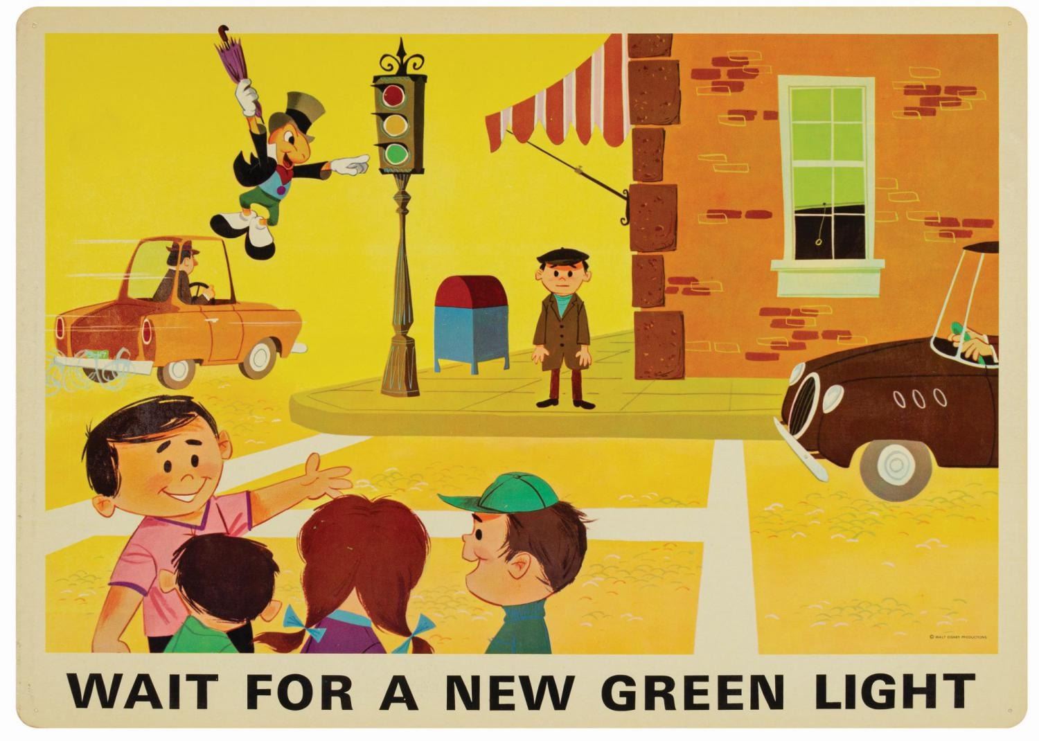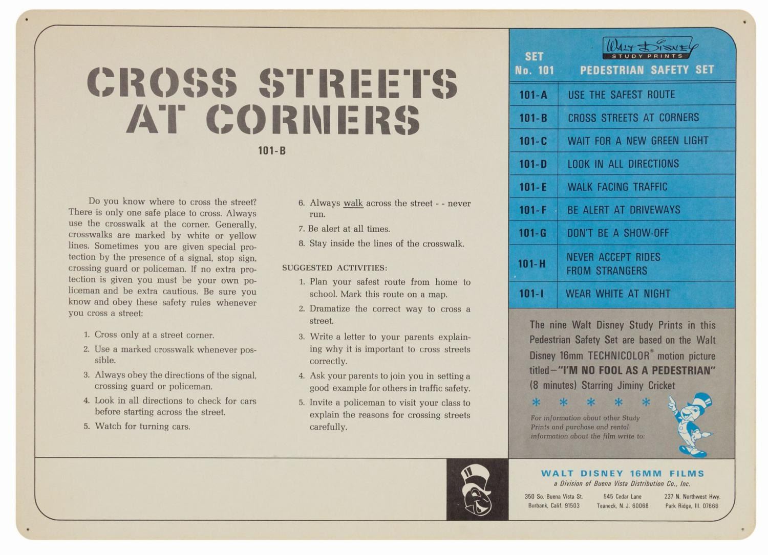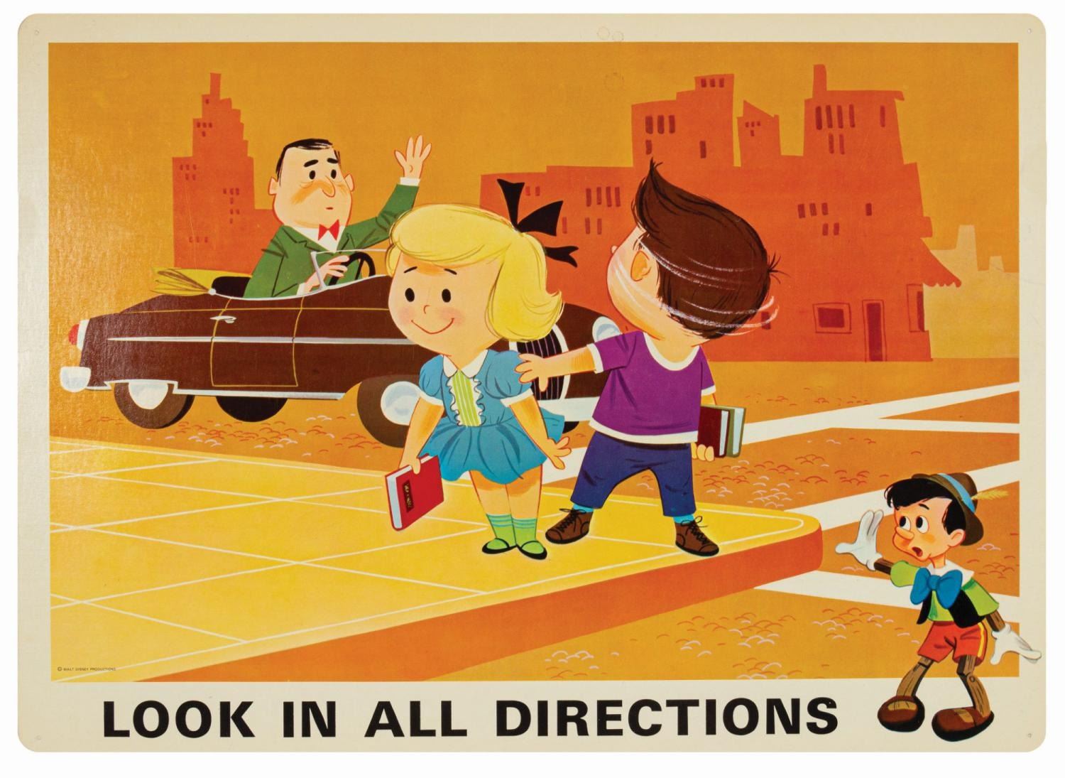 (Disney, c.1960s) A complete set of (9) Walt Disney Pedestrian Safety Rules prints in their original cardboard case. The set was designed as a companion to the Walt Disney educational film, "I'm No Fool as a Pedestrian" starring Jiminy Cricket. The case converts into a display easel, though the perforated legs have never been used and are unpunched. The cards measure 13"18" and the case is 15.5"x22". All pieces are in very good condition. The case exhibits some minor vertical stress creasing to the cover and faint browning from age.
