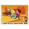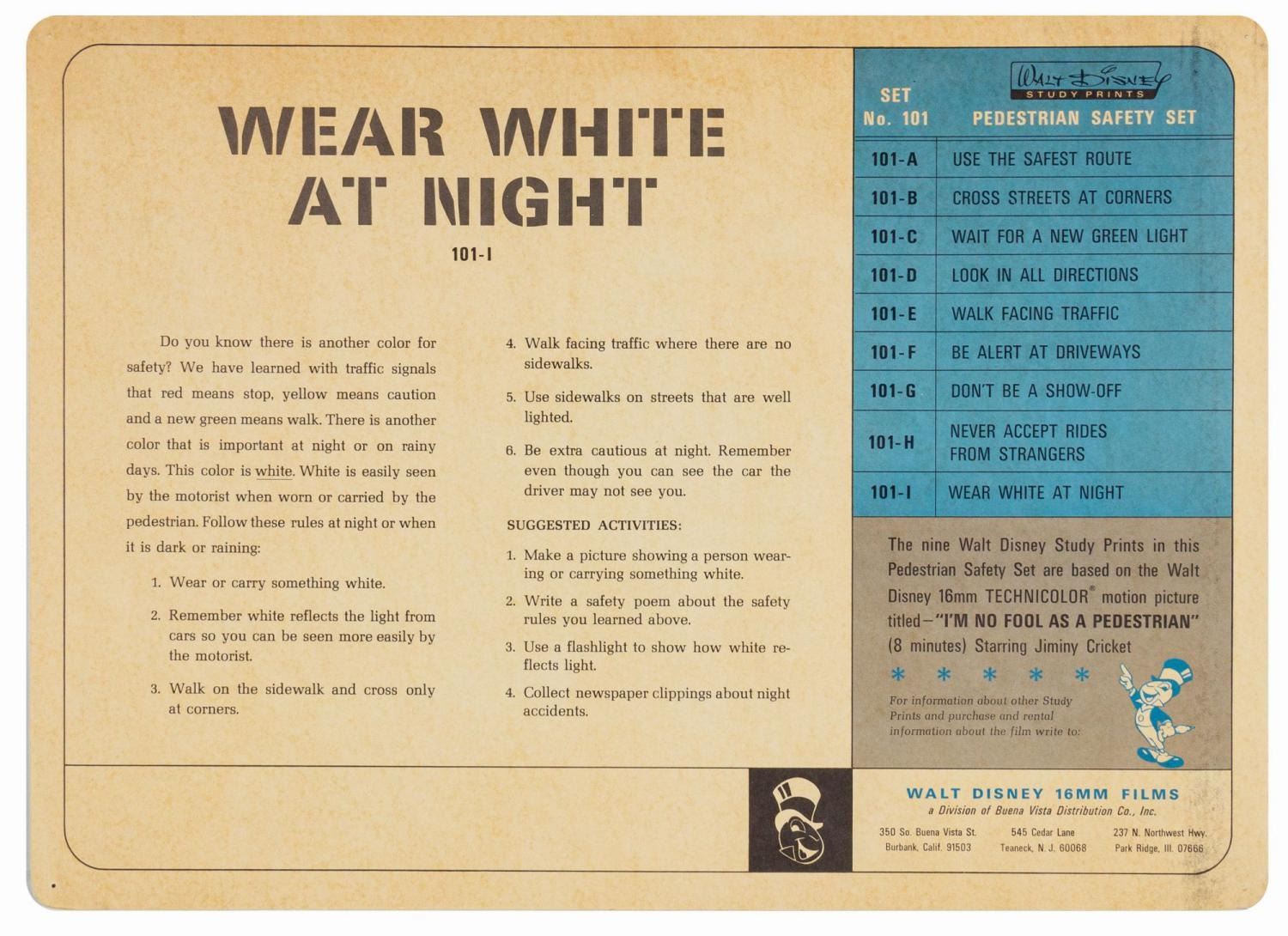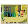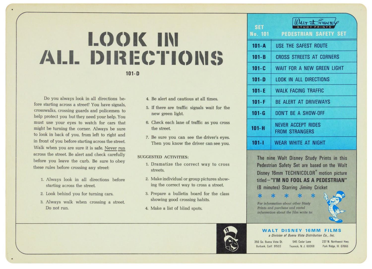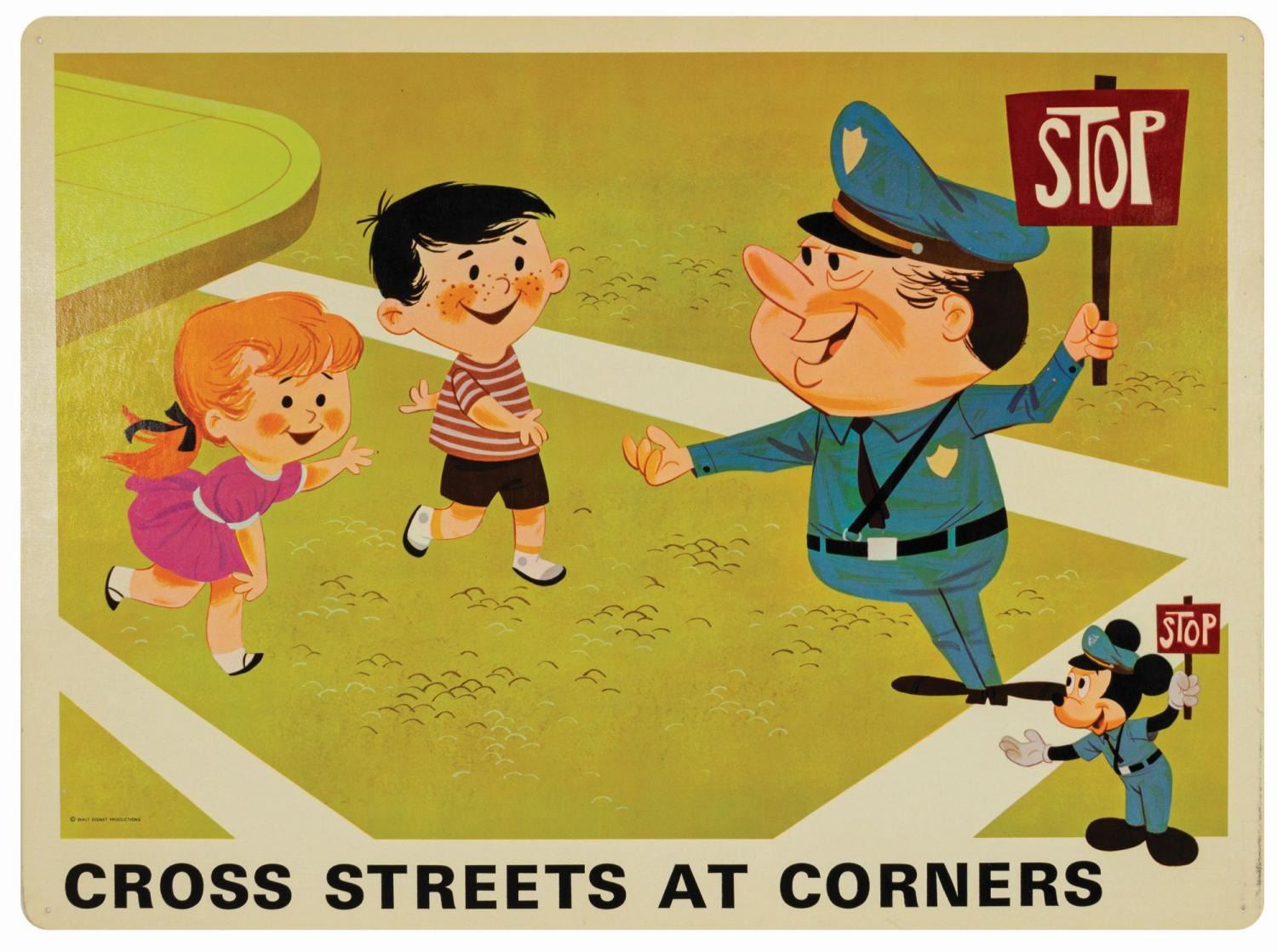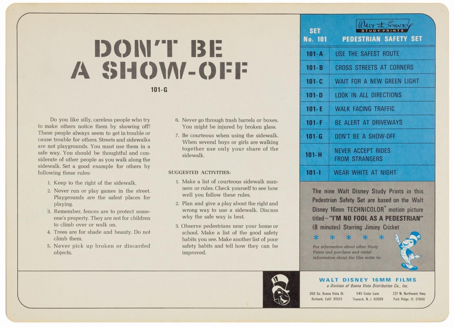 (Disney, c.1960s) A complete set of (9) Walt Disney Pedestrian Safety Rules prints in their original cardboard case. The set was designed as a companion to the Walt Disney educational film, "I'm No Fool as a Pedestrian" starring Jiminy Cricket. The case converts into a display easel, though the perforated legs have never been used and are unpunched. The cards measure 13"18" and the case is 15.5"x22". All pieces are in very good condition. The case exhibits some minor vertical stress creasing to the cover and faint browning from age.
