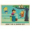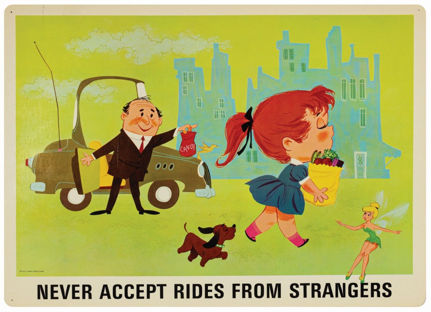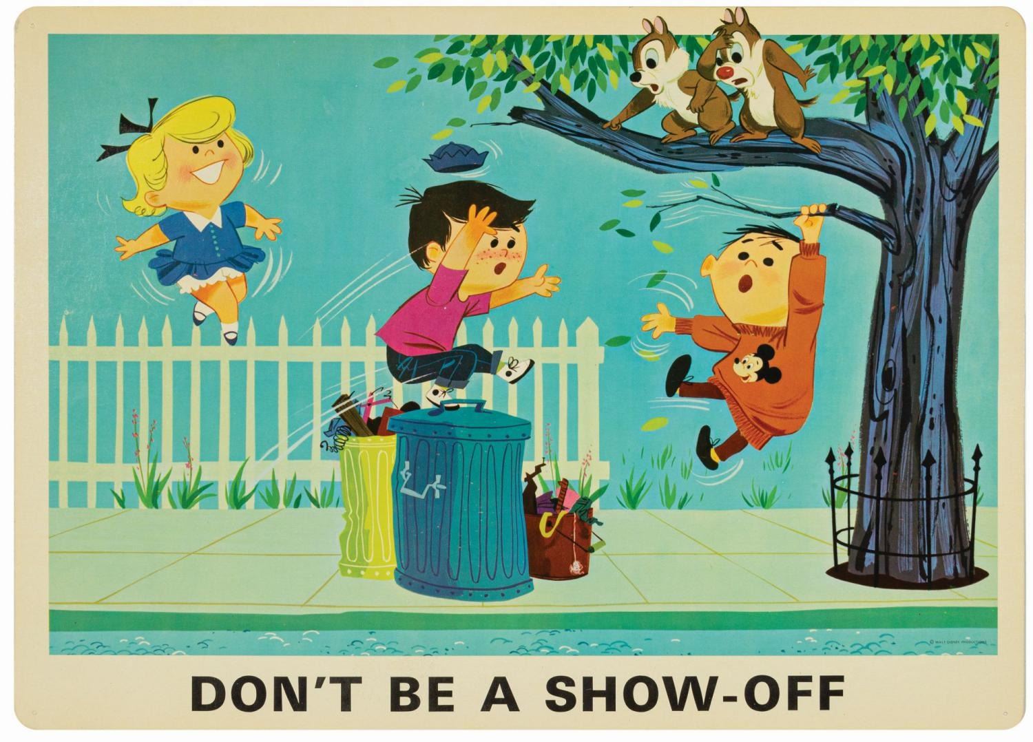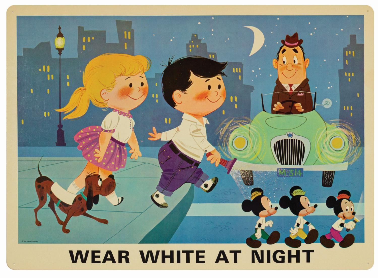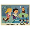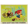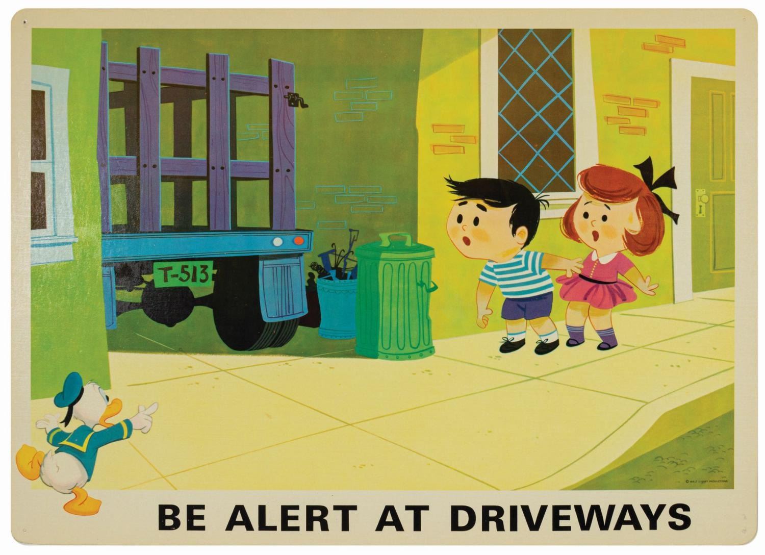 (Disney, c.1960s) A complete set of (9) Walt Disney Pedestrian Safety Rules prints in their original cardboard case. The set was designed as a companion to the Walt Disney educational film, "I'm No Fool as a Pedestrian" starring Jiminy Cricket. The case converts into a display easel, though the perforated legs have never been used and are unpunched. The cards measure 13"18" and the case is 15.5"x22". All pieces are in very good condition. The case exhibits some minor vertical stress creasing to the cover and faint browning from age.