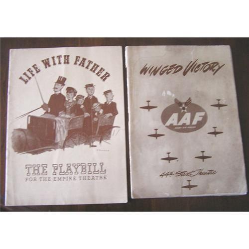Eight old Playbills from the American Theater. Including: Marylin Miller in "Sunny", 1926 at the New Amsterdam Theater; "Hot Cha" with Bert Lahr and Lupe Velez from 1935; "Ah, Wilderness" with George M. Cohan, 1934; "Life With Father" from 1941; "Stars on Ice", starring Sonja Henie" from 1943; "Winged Victory" by Moss Hart, with a cast consisting entirely of ARMY AIR FORCE personnel, 1944: "Man and Superman" with Maurice Evans, from 1948; and, "An Evenibg of Songs and Impressions" starring Maurice Chevalier, from 1948.