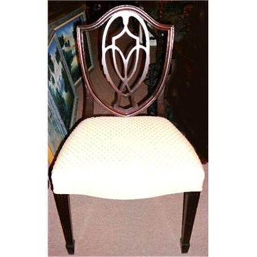 This is a wonderful set of eight shield back mahogany dining side chairs with newly upholstered seats.