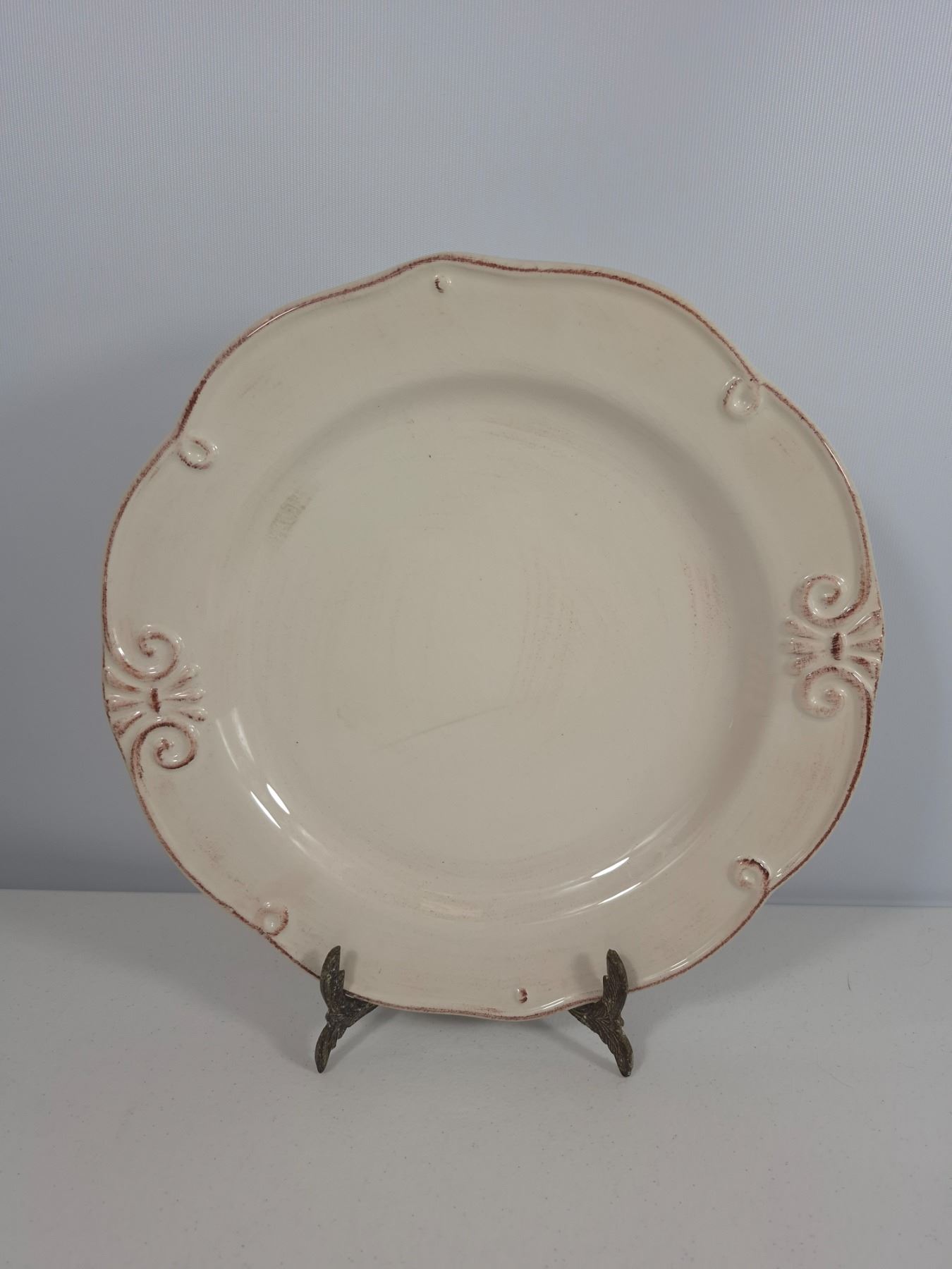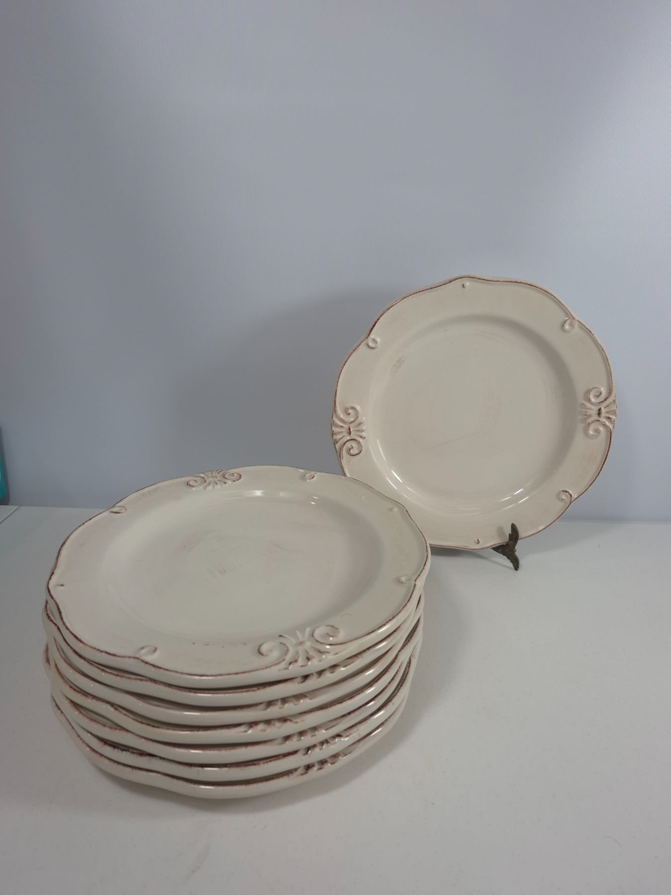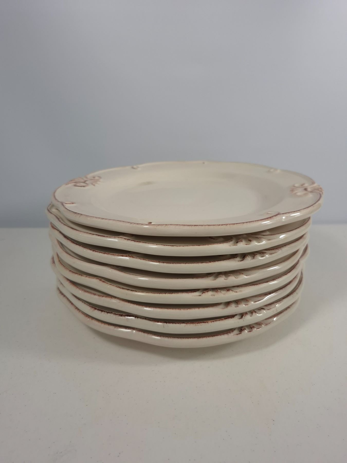 Eight matching cream ceramic dinner plates with scalloped edges and embossed scroll details. Beautiful rustic farmhouse style, all in very good condition with light utensil wear.