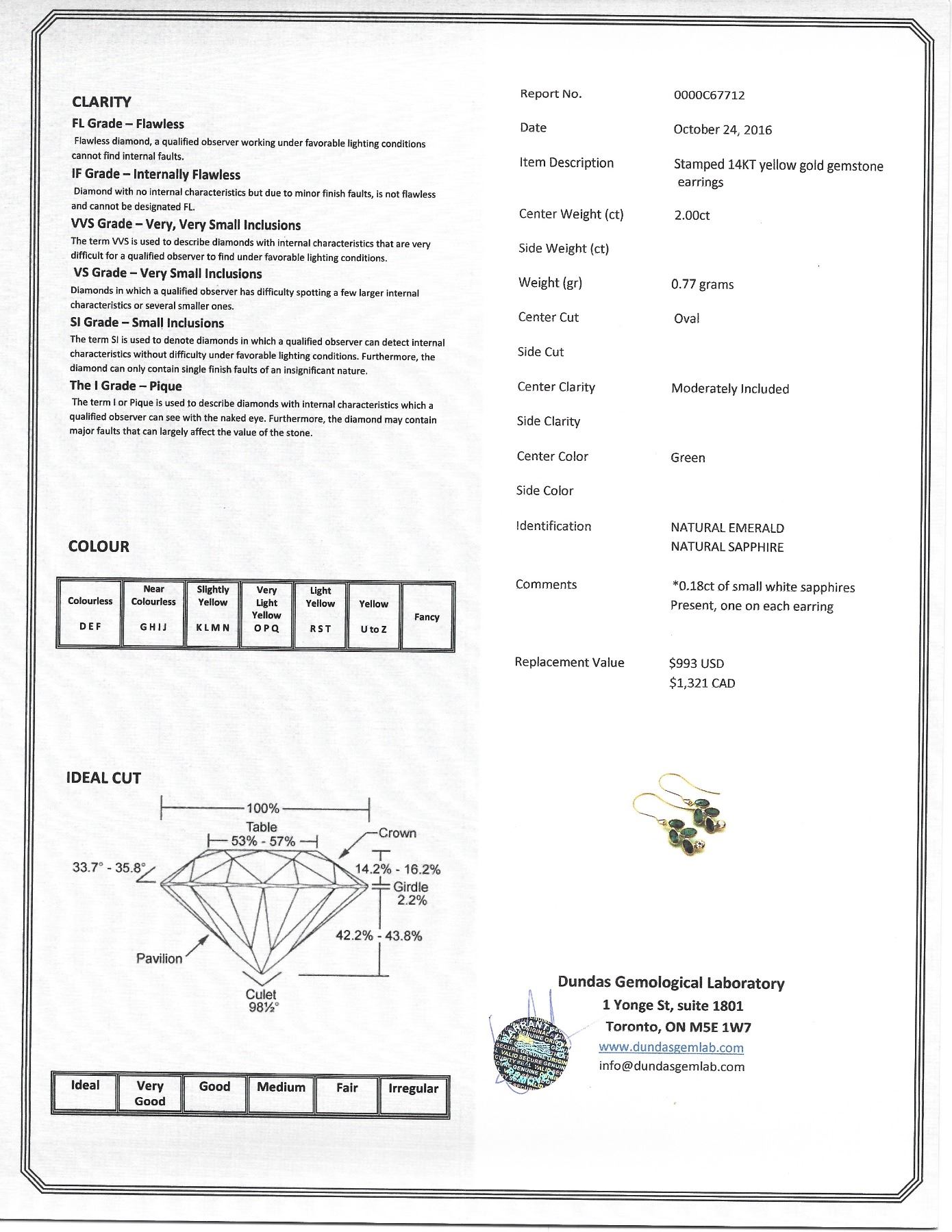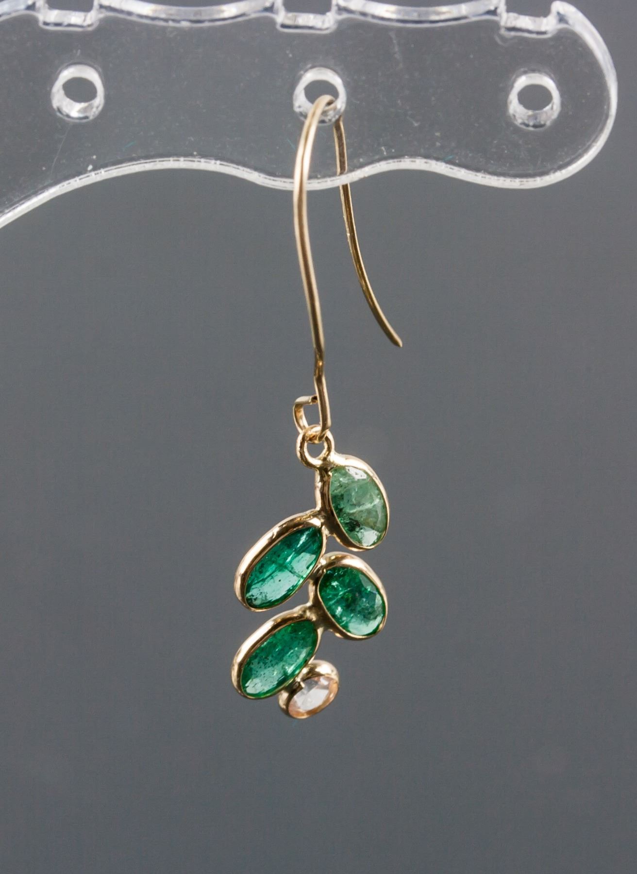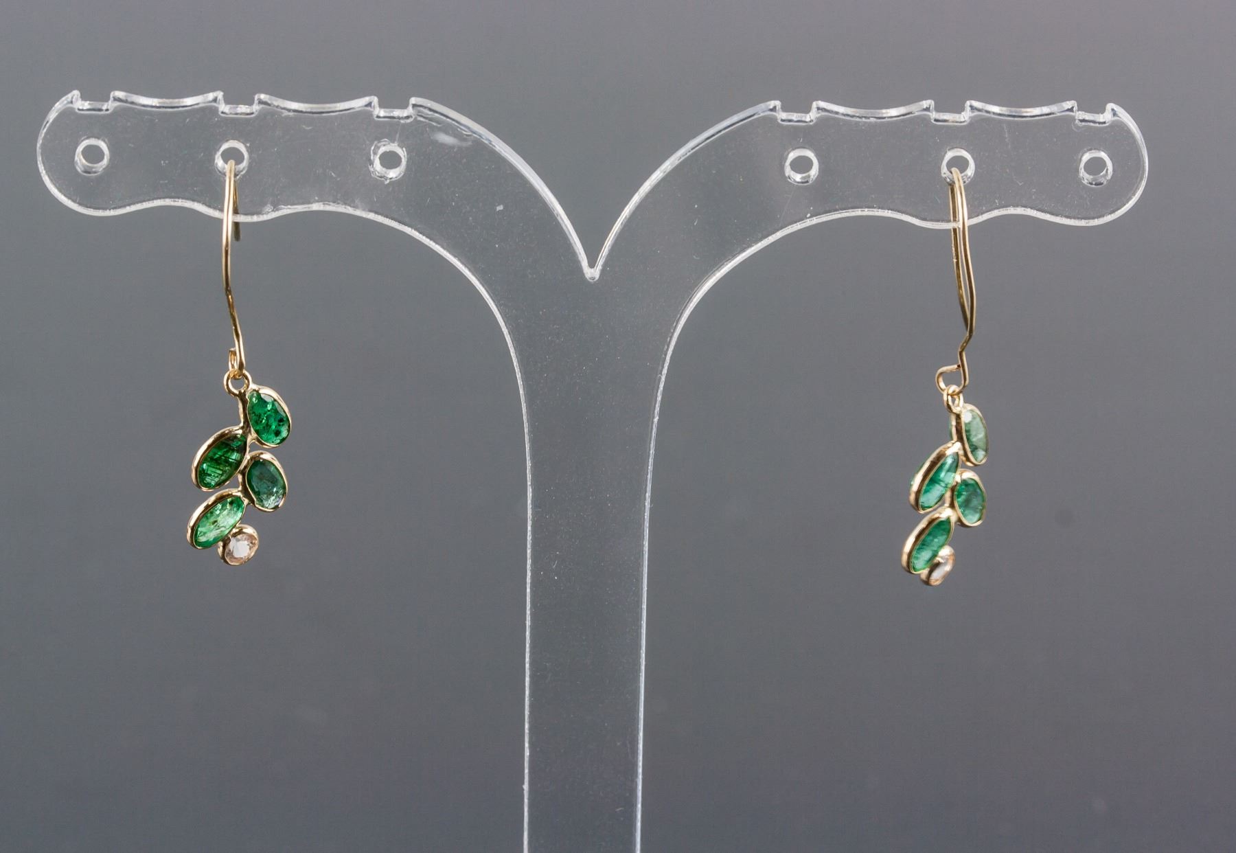 Stamped 14k yellow gold earrings; set with 2.00ct oval shaped green emerald and 0.18ct small white sapphires; certified replacement value $1321; 0.77 grams