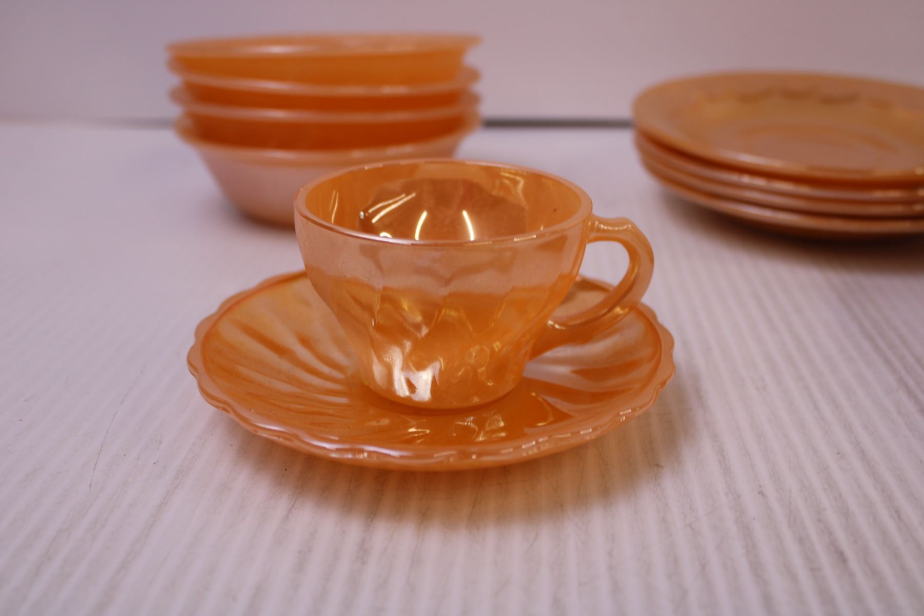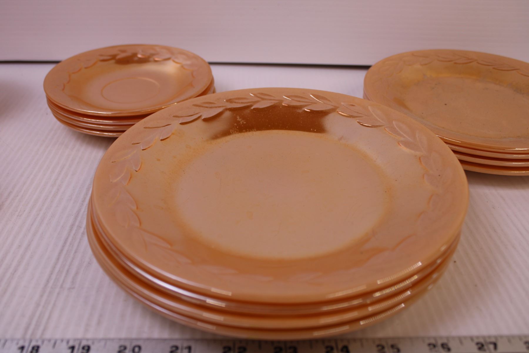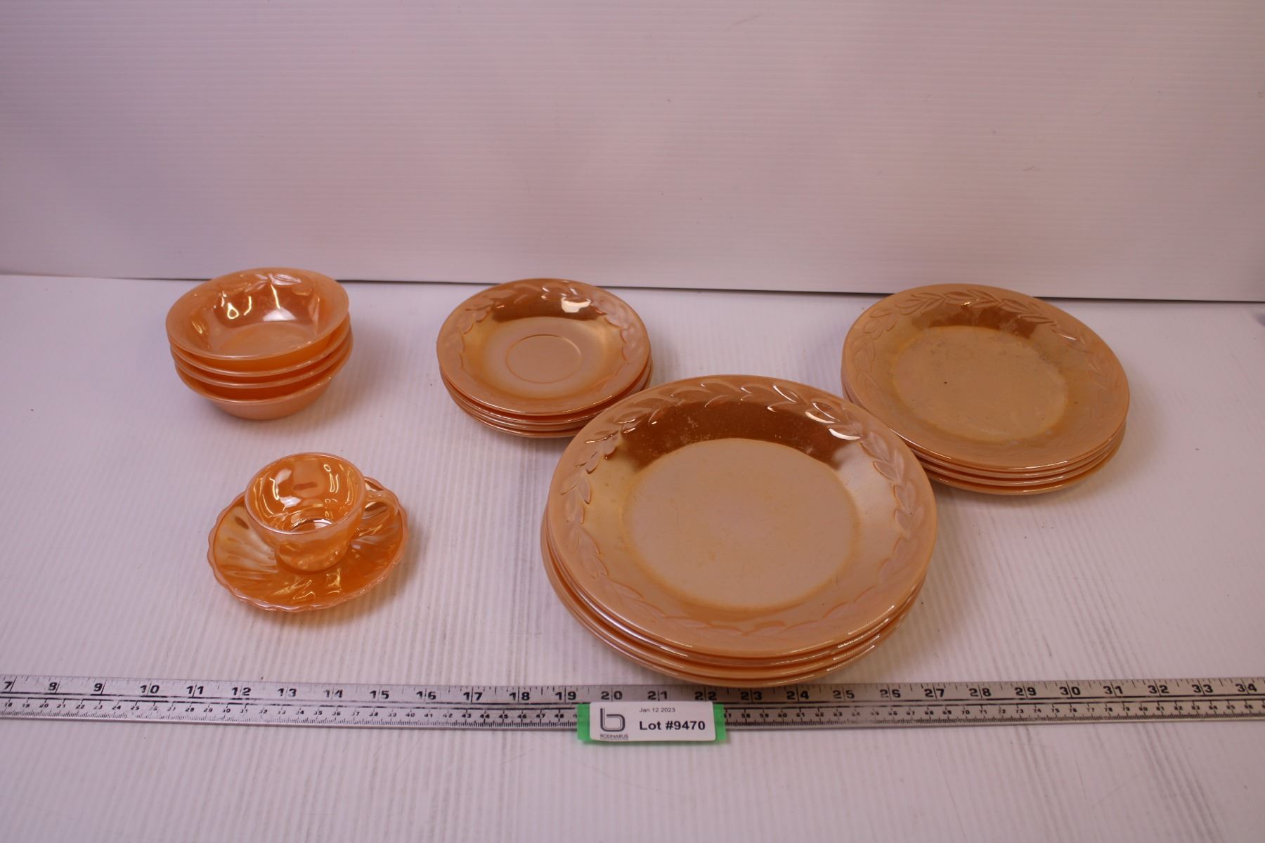 Set of Fire King -Peach Lustre Dishes (4-Dinner Plates 4-Bread Plates 4-Dessert Plates 4-Dessert Bowls and a Cup w/Saucer)