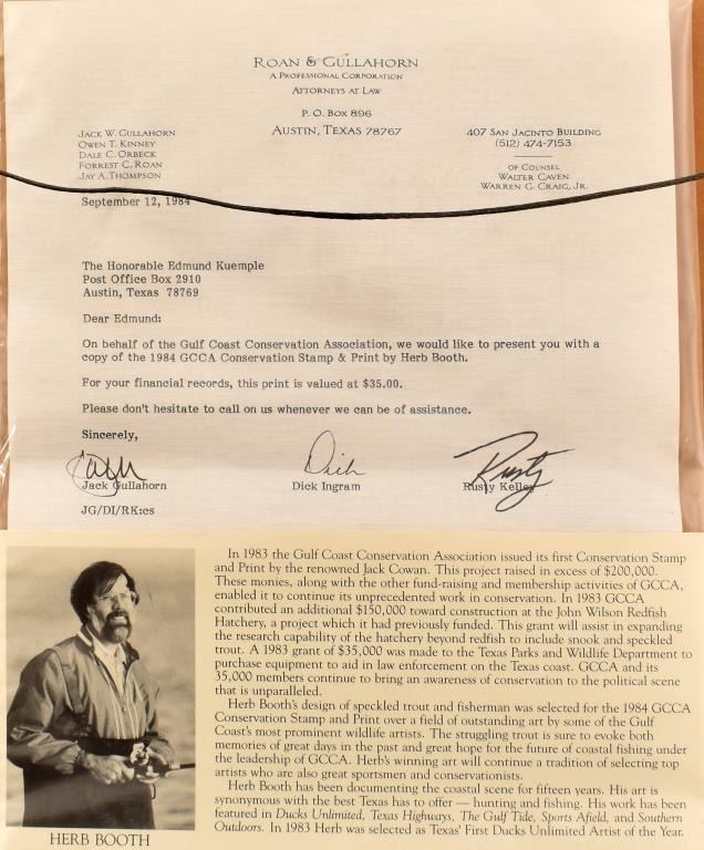 1983-86 Gulf Coast Conservation Association, These were the unnumbered Legislative Edition only given to Texas State Legislators, Senators and Governors. Obtained through Rep. Edmund Kuempel's Collection. 16" x 18" framed Artist John P. Cowan