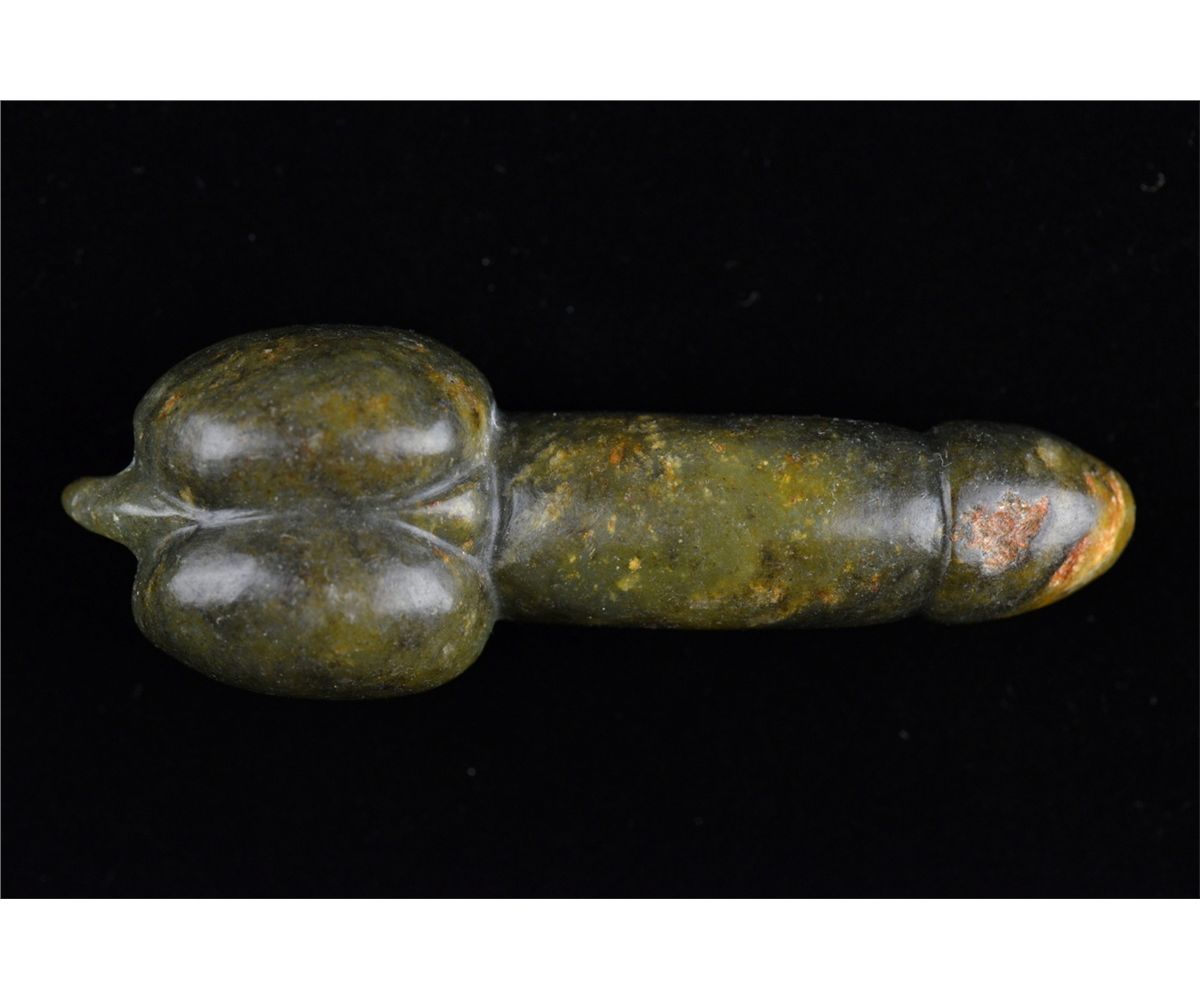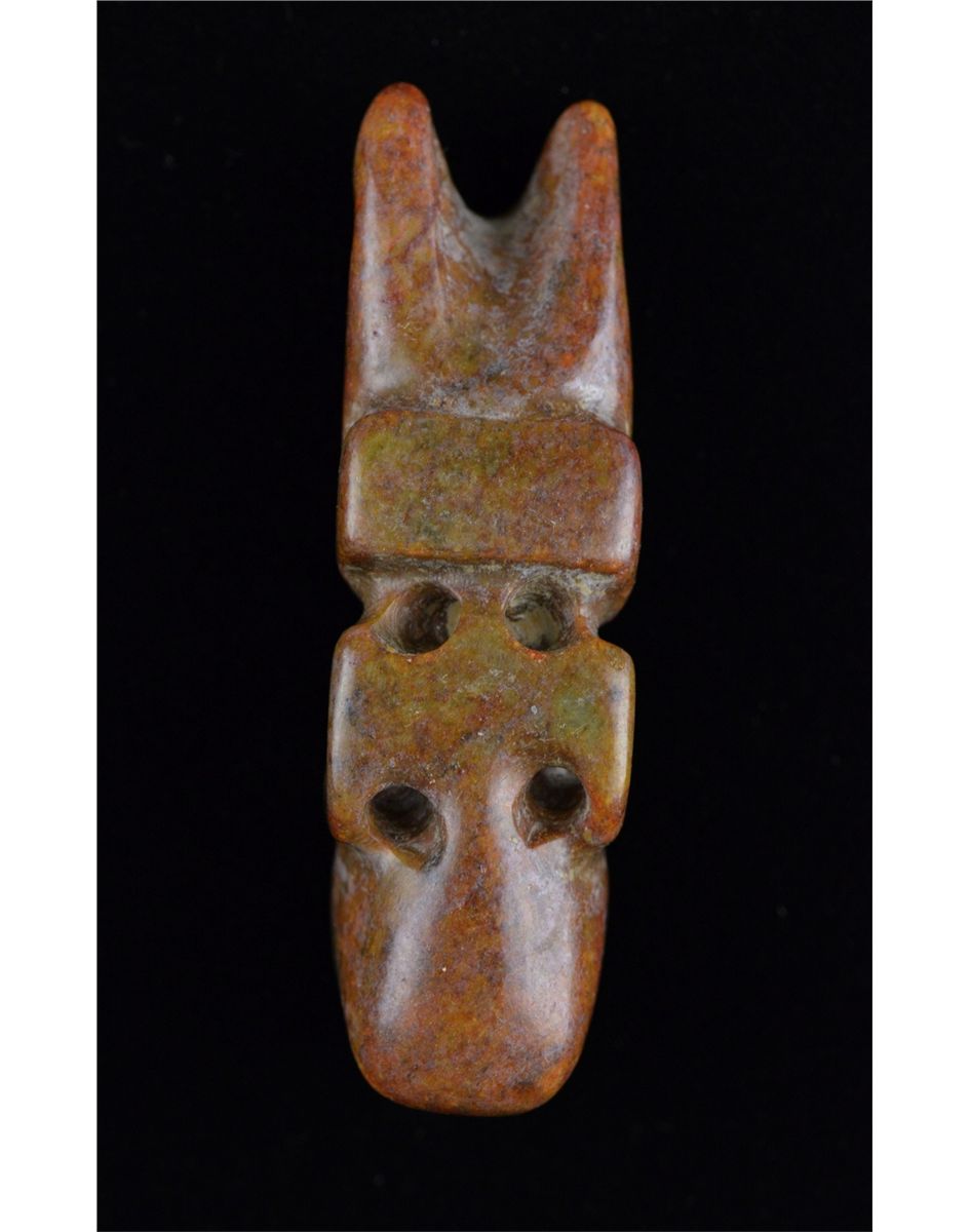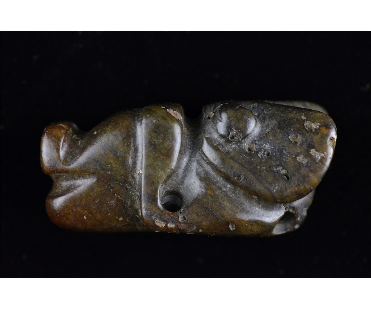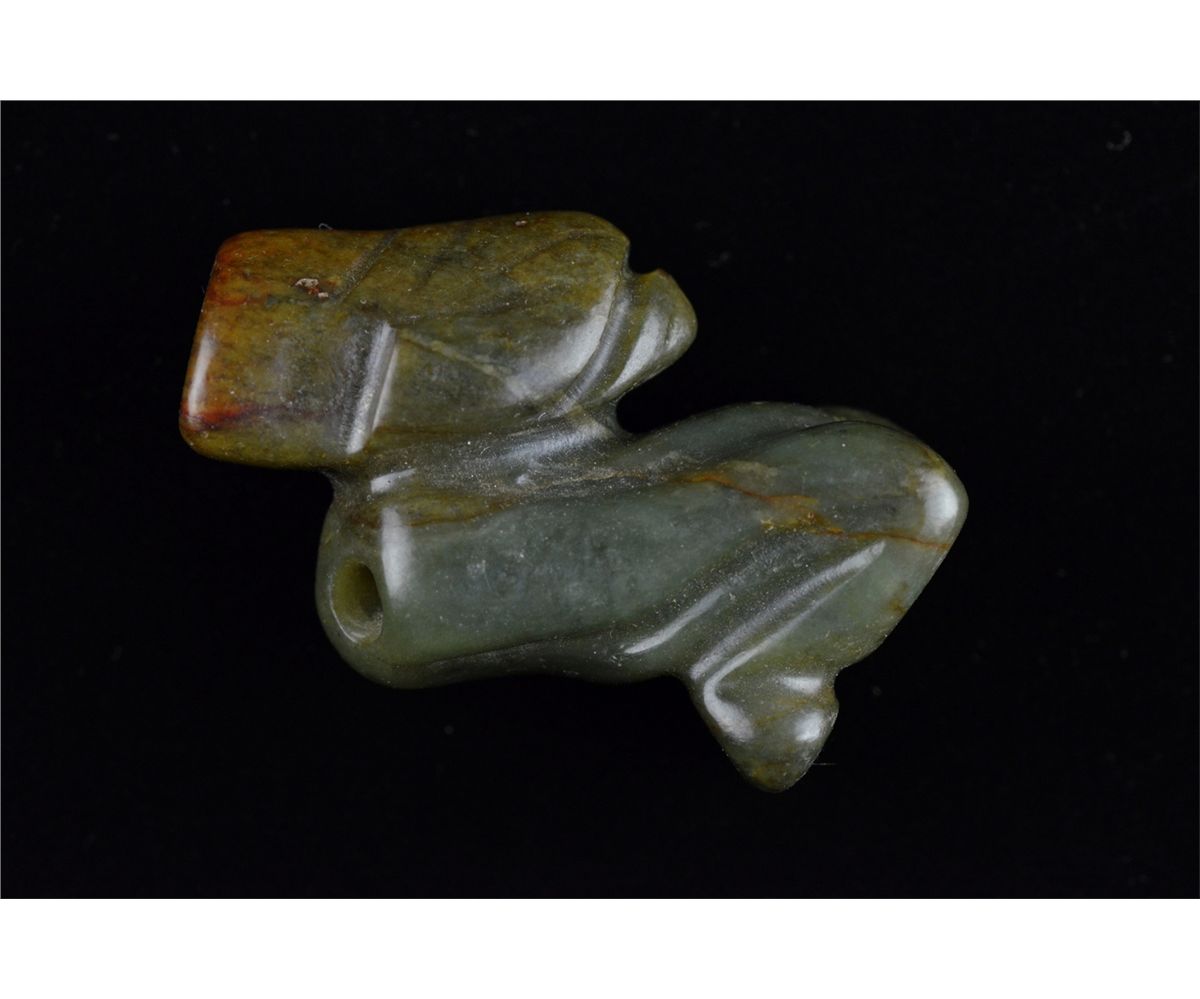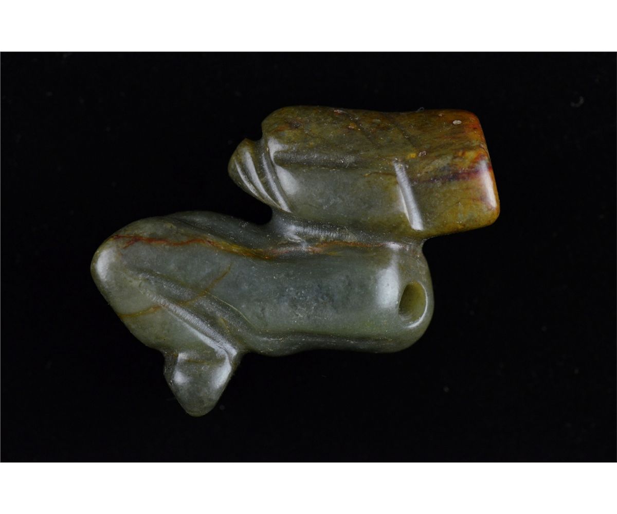 Set of five Chinese carved jade toggle pieces; pierced for suspension; L: 8 cm, 56 grams (1); L: 6.25 cm, 86 grams (2); L: 6 cm, 70 grams (3); L: 6.5 cm, 55 grams (4); L: 7 cm, 51 grams (5)
