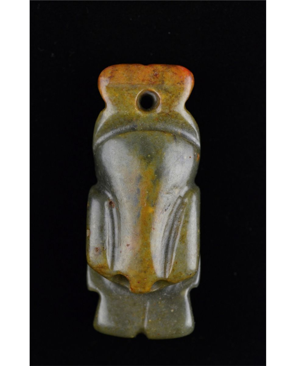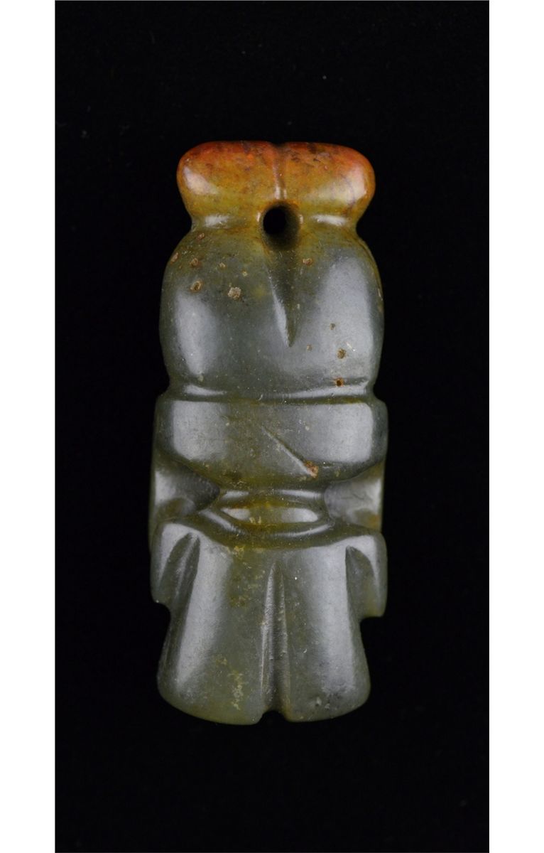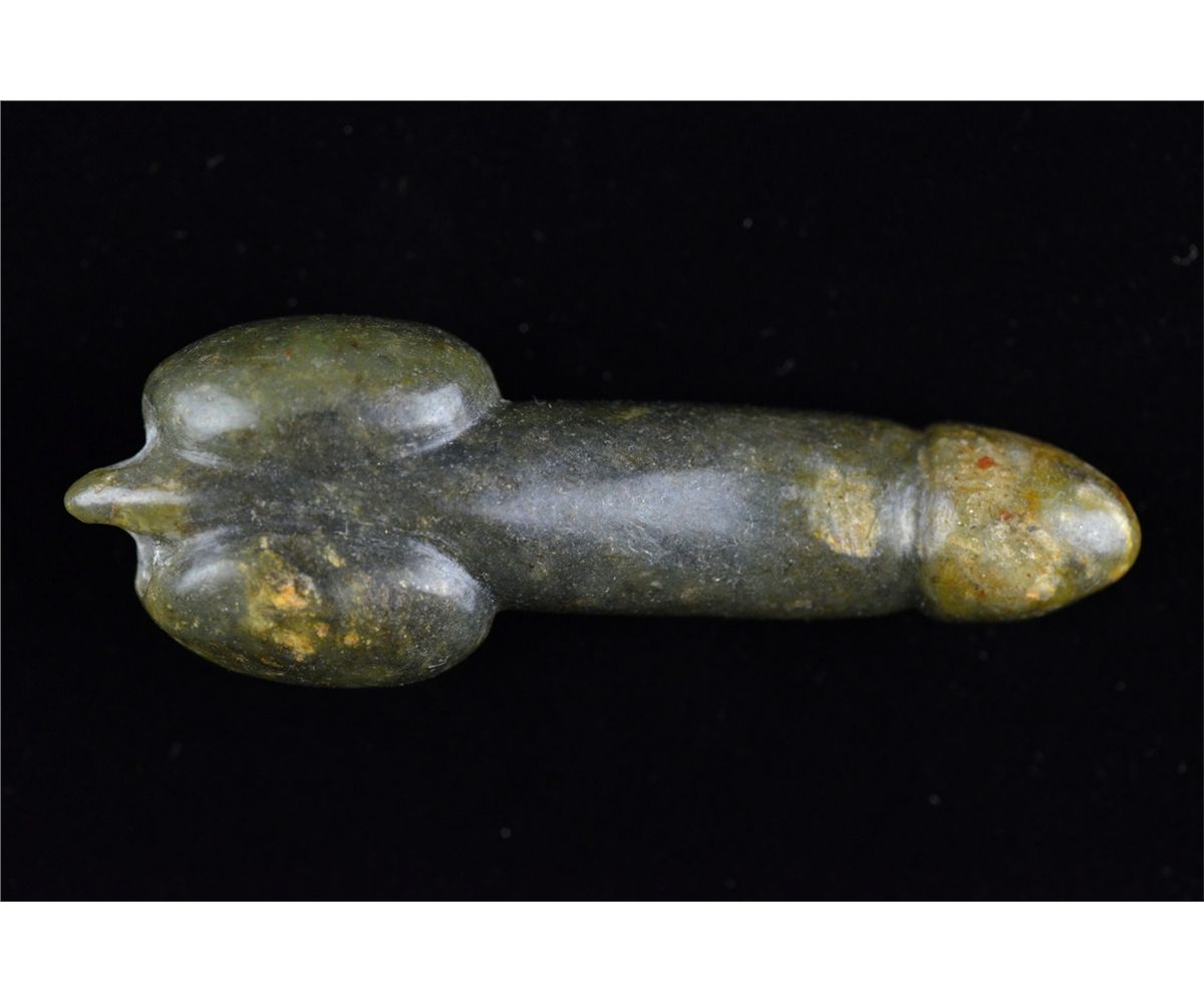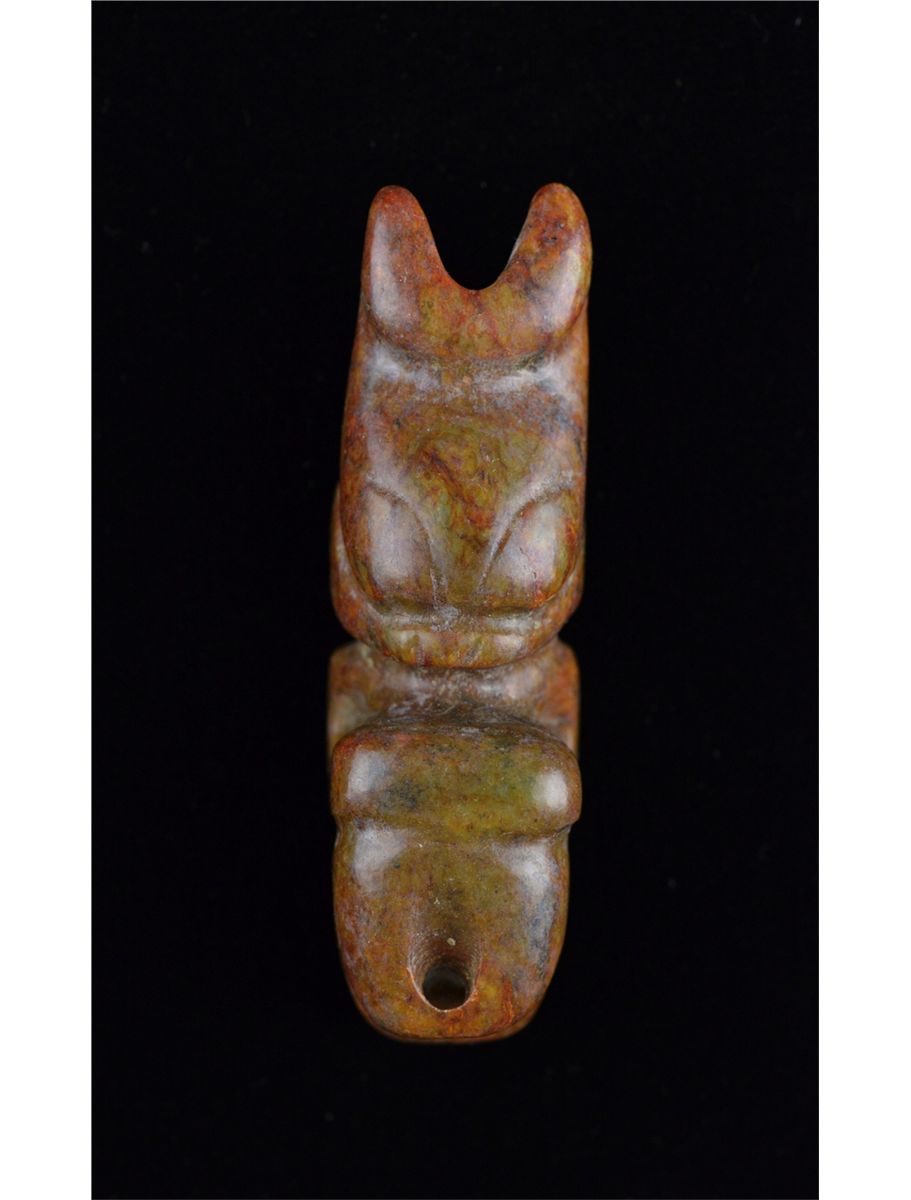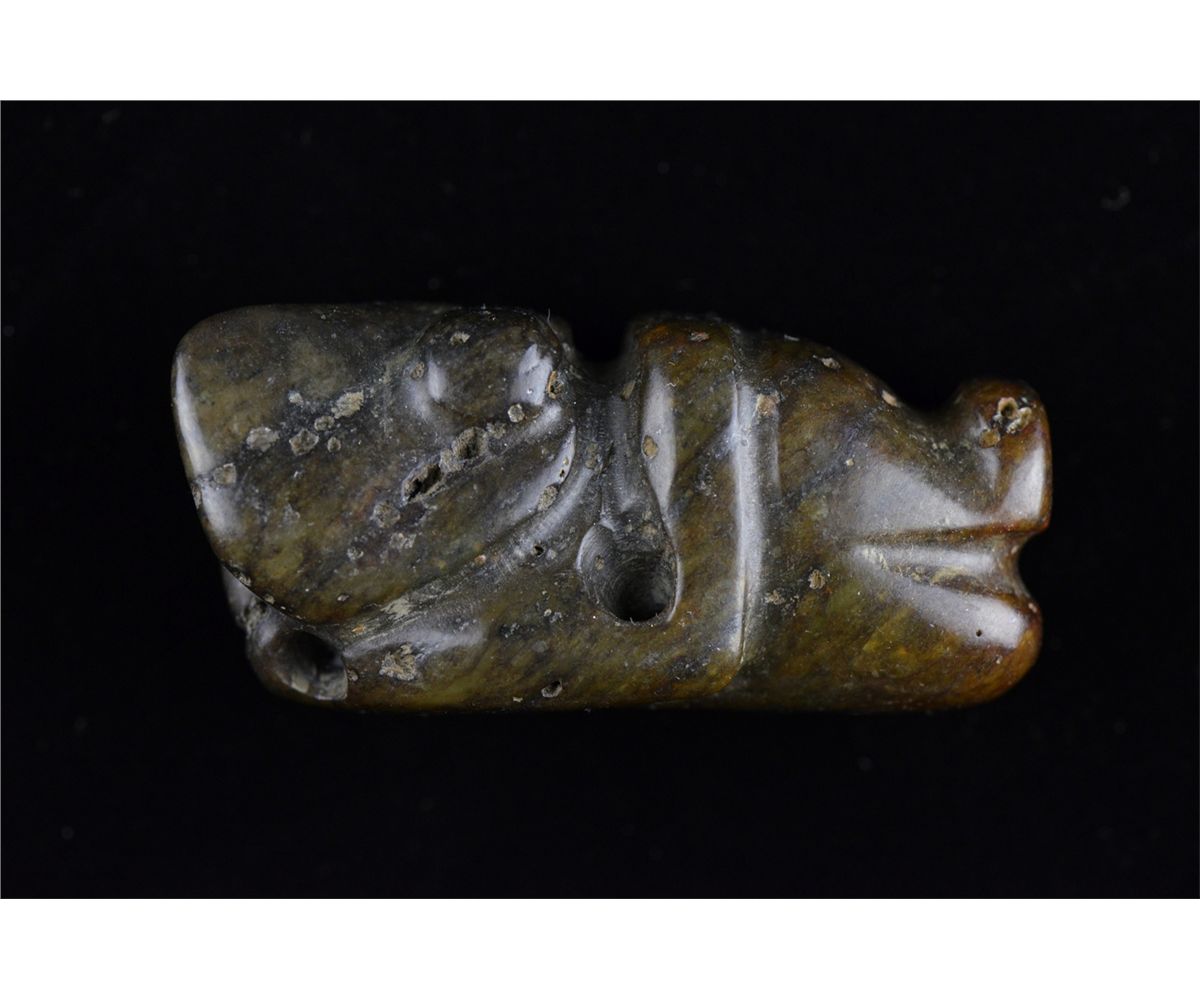 Set of five Chinese carved jade toggle pieces; pierced for suspension; L: 8 cm, 56 grams (1); L: 6.25 cm, 86 grams (2); L: 6 cm, 70 grams (3); L: 6.5 cm, 55 grams (4); L: 7 cm, 51 grams (5)