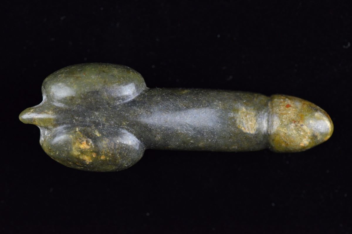 Set of five Chinese carved jade toggle pieces; pierced for suspension; L: 8 cm, 56 grams (1); L: 6.25 cm, 86 grams (2); L: 6 cm, 70 grams (3); L: 6.5 cm, 55 grams (4); L: 7 cm, 51 grams (5)