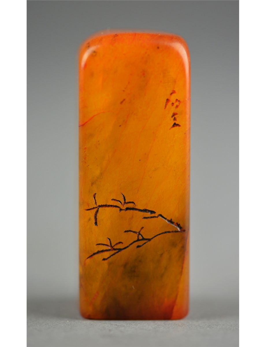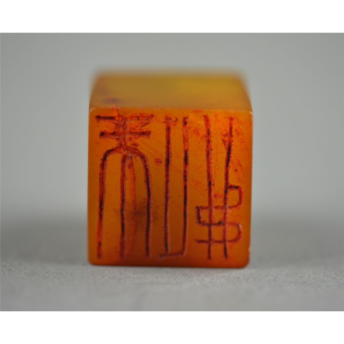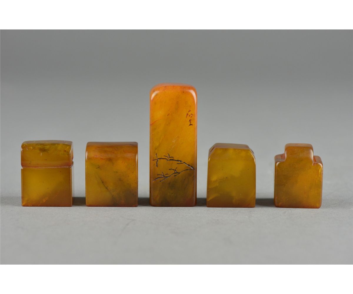 Set of five Chinese carved Tianhuang stone, of various square forms with a domed top featuring notched handles, incised mark on one side of all five seals, the stone of rich toffee tone. H: 5 cm, 52 grams (1), H: 2.5 cm, 30 grams (2), H: 2.5 cm, 27 grams (3), H: 2.75 cm, 29 grams (4), H: 2.5 cm, 25 grams (5), wood case. Provenance: Eastern Shen Collection, Toronto.