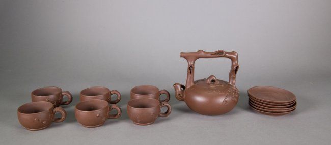 Set of five Chinese Yixing Zisha teapot with teacups and matching saucers; signed on base; L: 11.5 cm (teapot); (chip on one saucer)