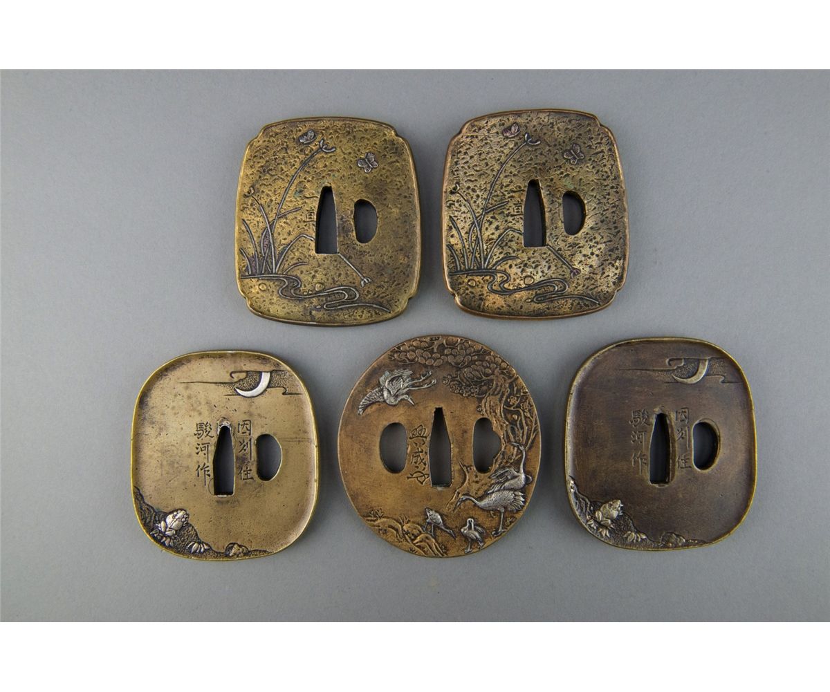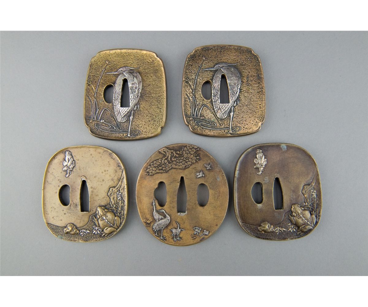 Group of five Japanese sword Tsuba guard; H: 7.5 cm W: 8 cm, total 1009 grams; Provenance: Ma Collection Toronto