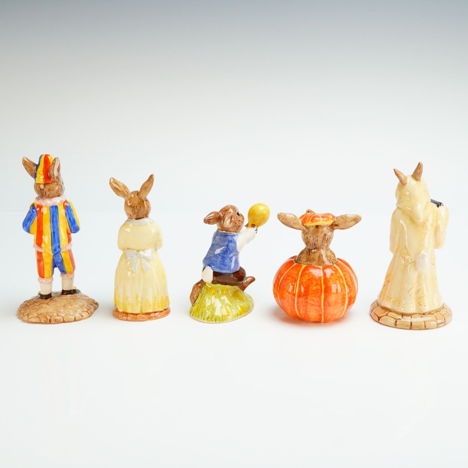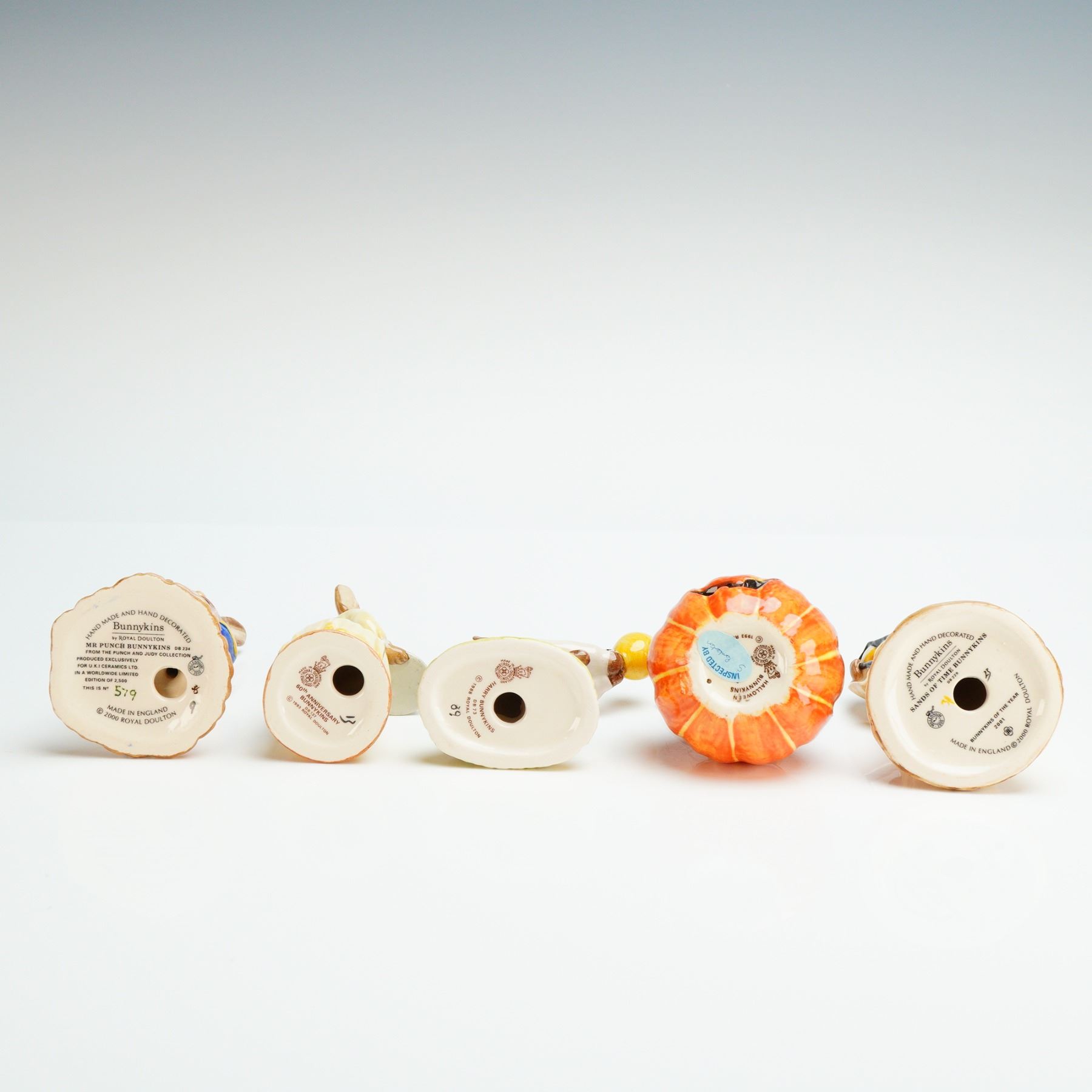 This collection consists of hand-painted and glazed ceramic items featuring anthropomorphic rabbits in various thematic costumes. The models included in this lot are DB 137, DB 132, DB 234, DB 74, and DB 229. Specific figures include Mr. Punch Bunnykins (limited edition 519 of 2500) in a multicolored jester outfit, a Halloween Bunnykins emerging from a jack-o-lantern, and a Sands of Time Bunnykins in a hooded robe holding an hourglass, 60th Anniversary and Harry Bunnykins. Each item is marked on the base with the Royal Doulton Bunnykins backstamp, including specific model numbers and production dates ranging from 1988 to 2000.