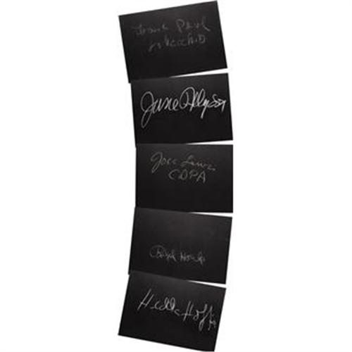 <B>Set of Five "What's My Line?" Guest Cards Signed by June Allyson and Others.</B></I> Set of five 26" x 18" black cards from the show signed in white chalk by June Allyson, Ralph Hauk, Frank Paul LaVechio, Hedda Hopper, and Joe E. Lewis. In overall Excellent condition with mild smearing. <I>Accompanied by LOA from PSA/DNA.</B></I><BR><BR><b>Shipping:</b> Flat Material, Large (<a target="_blank" href="http://www.heritageauctions.com/common/shipping.php">view shipping information</a>)