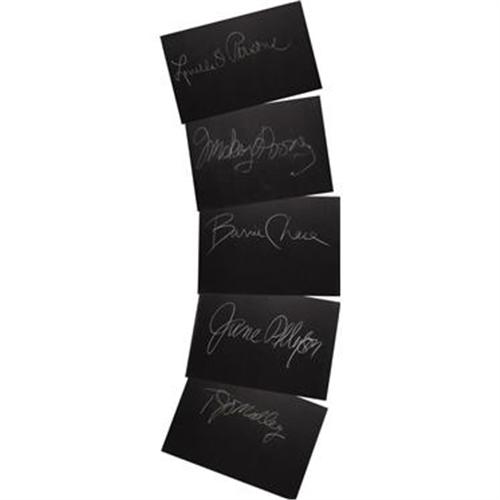 <B>Set of Five "What's My Line?" Guest Cards Signed by Mickey Rooney and Others.</B></I> Set of five 26" x 18" black cards from the show signed in white chalk by Mickey Rooney, June Allyson, Barrie Chase, T.J. O'Malley, and Louella Parsons. In overall Excellent condition with very mild smearing. <I>Accompanied by LOA from PSA/DNA.</B></I><BR><BR><b>Shipping:</b> Flat Material, Large (<a target="_blank" href="http://www.heritageauctions.com/common/shipping.php">view shipping information</a>)