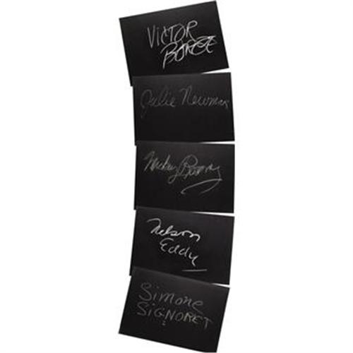 <B>Set of Five "What's My Line?" Guest Cards Signed by Julie Newmar and Others.</B></I> Set of five 26" x 18" black cards from the show signed in white chalk by Julie Newmar, Victor Borge, Simone Signoret, Mickey Rooney, and Nelson Eddy. In overall Excellent condition with mild smearing. <I>Accompanied by LOA from PSA/DNA.</B></I>