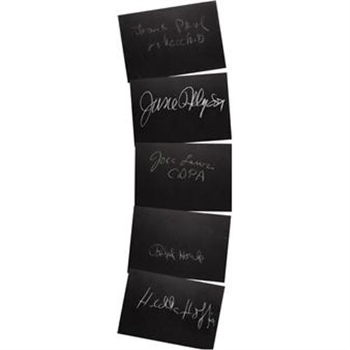 <B>Set of Five "What's My Line?" Guest Cards Signed by June Allyson and Others.</B></I> Set of five 26" x 18" black cards from the show signed in white chalk by June Allyson, Ralph Hauk, Frank Paul LaVechio, Hedda Hopper, and Joe E. Lewis. In overall Excellent condition with mild smearing. <I>Accompanied by LOA from PSA/DNA.</B></I>