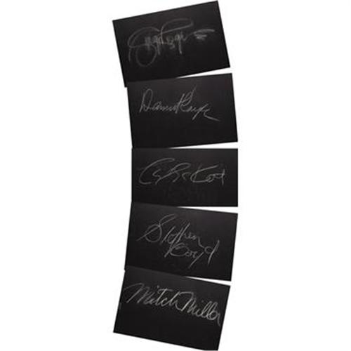 <B>Set of Five "What's My Line?" Guest Cards Signed by Danny Kaye and Others.</B></I> Set of five 26" x 18" black cards from the show signed in white chalk by Danny Kaye, Ginger Rogers, Eartha Kitt, Stephen Boyd, and Mitch Miller. In overall Excellent condition with mild smearing. <I>Accompanied by LOA from PSA/DNA.</B></I>