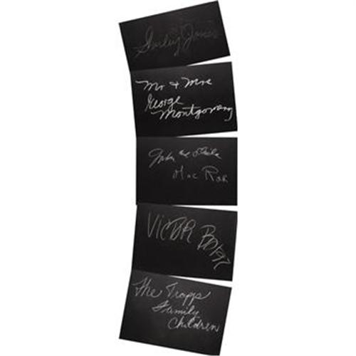 <B>Set of Five "What's My Line?" Guest Cards Signed by Victor Borge and Others.</B></I> Set of five 26" x 18" black cards from the show signed in white chalk by Victor Borge, the von Trapp children, Gordon and Sheila MacRae, Mr. and Mrs. George Montgomery, and Shirley Jones. In overall Excellent condition with very mild smearing. <I>Accompanied by LOA from PSA/DNA.</B></I>