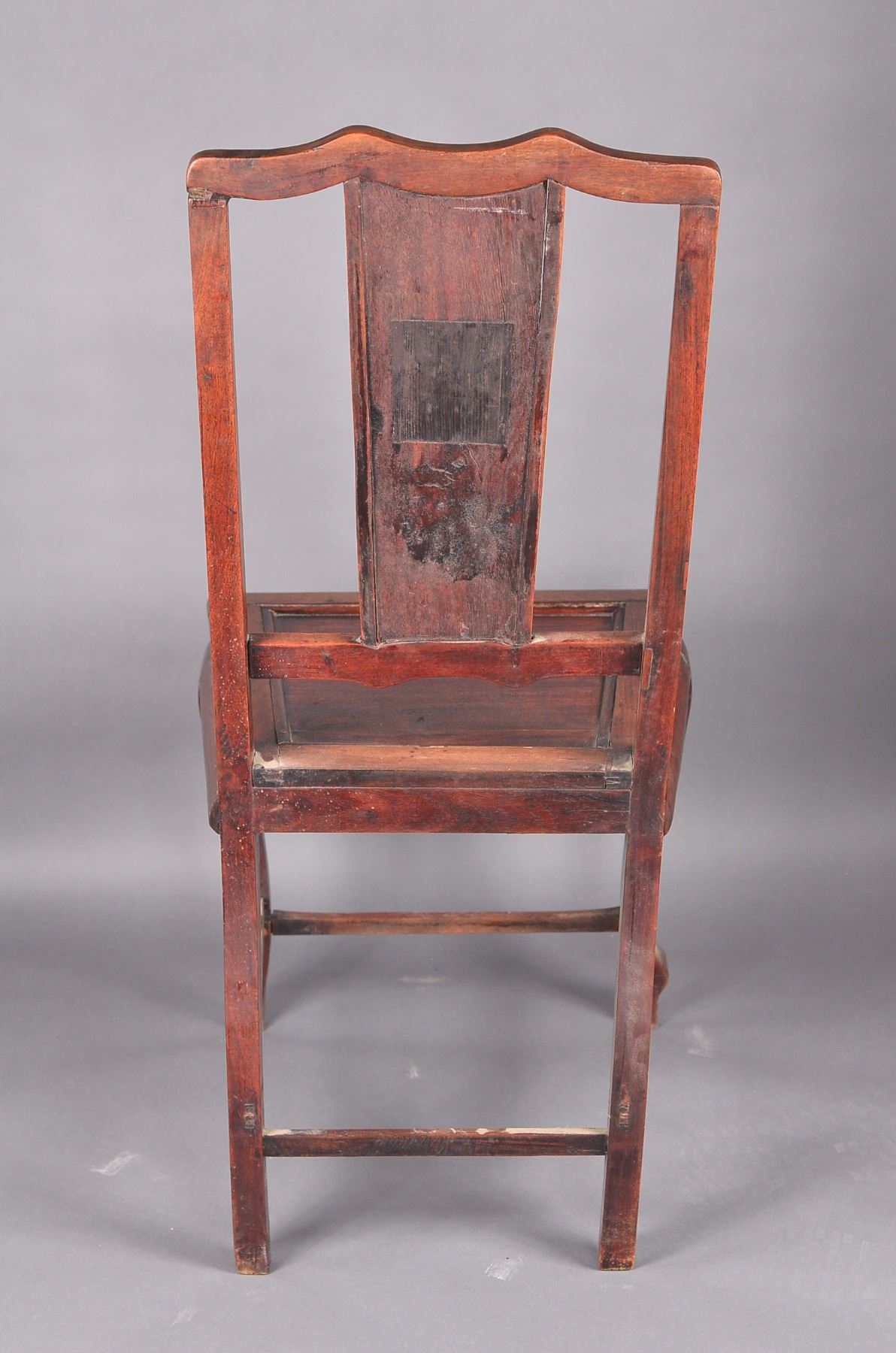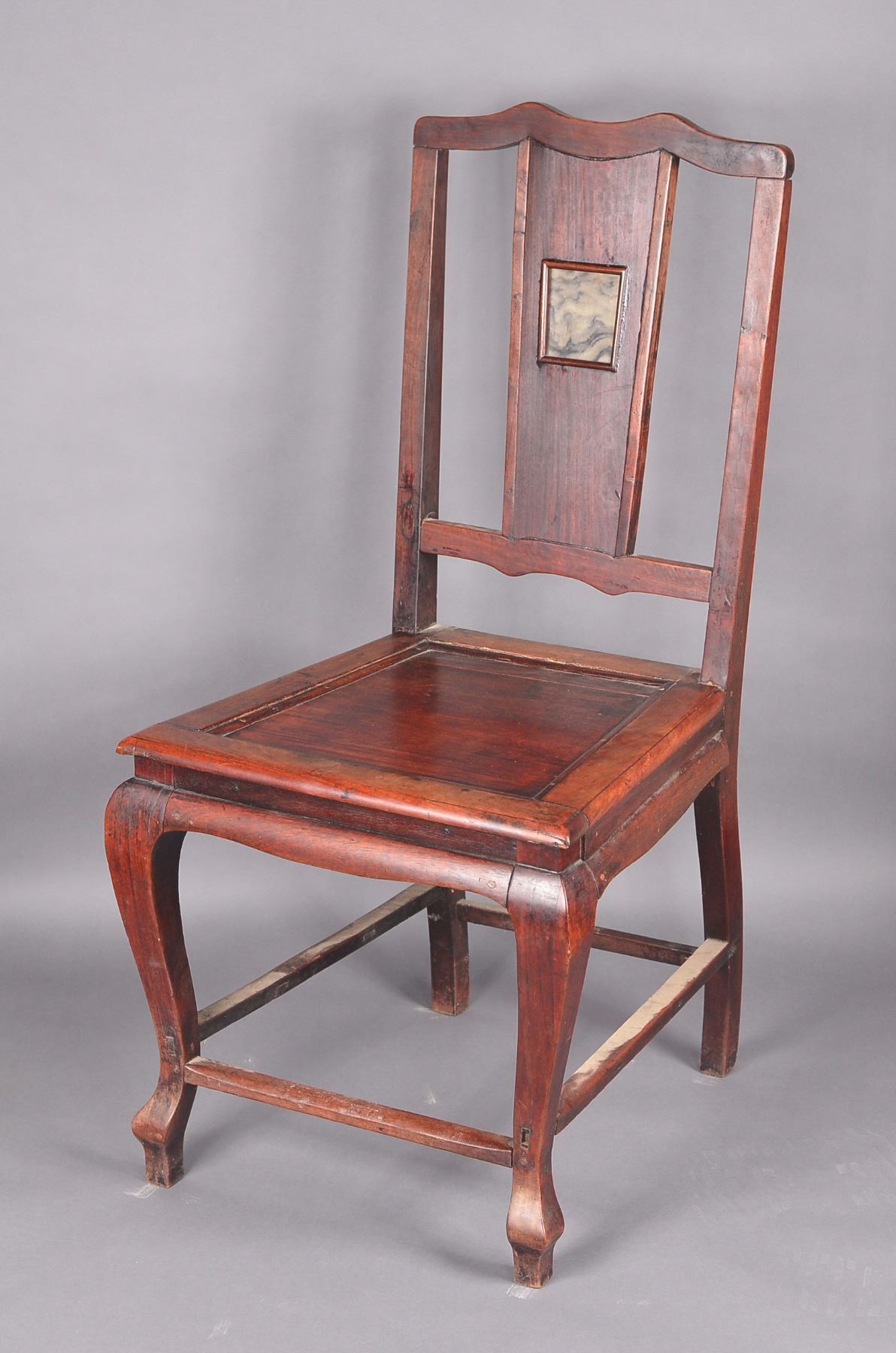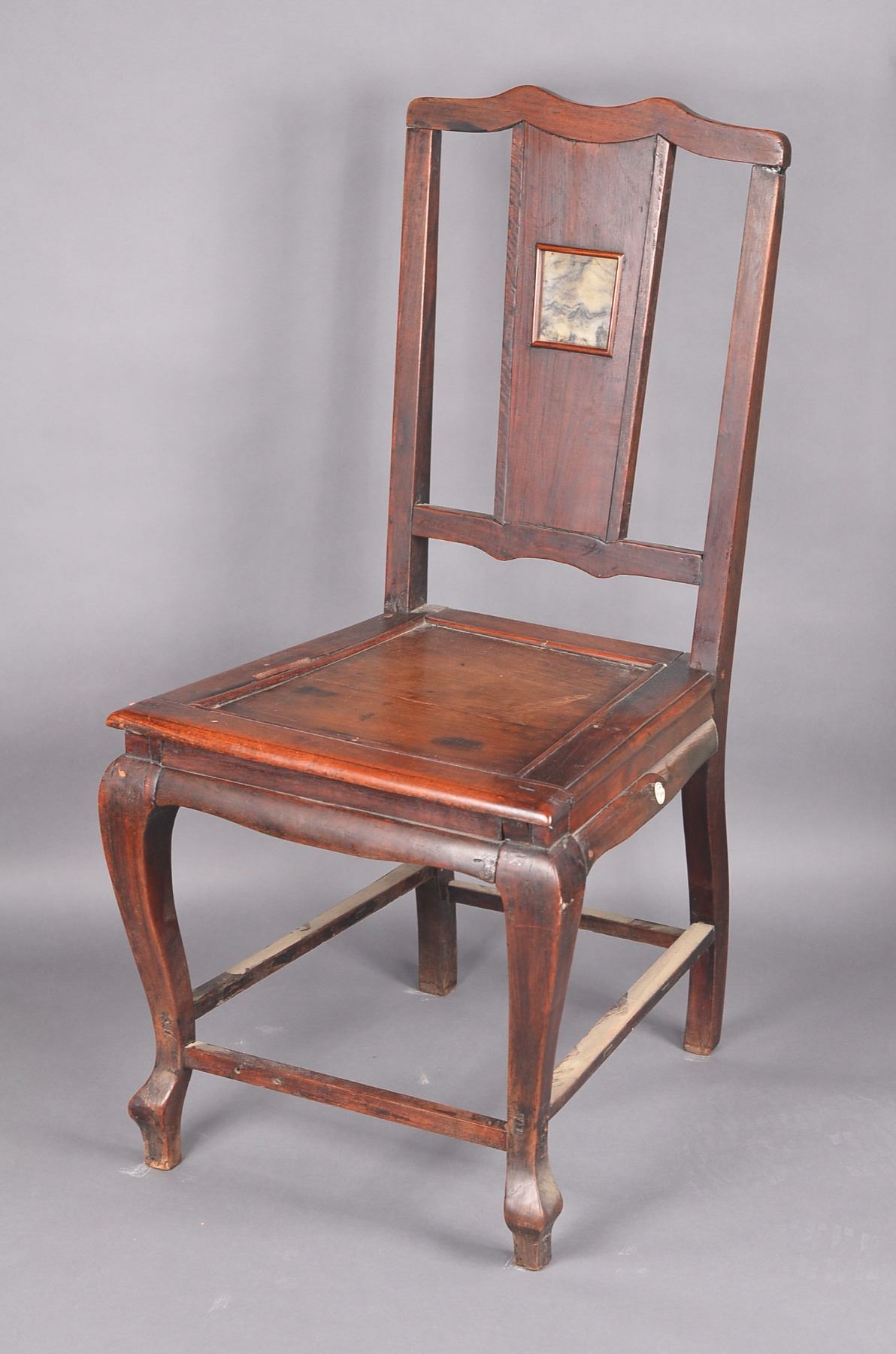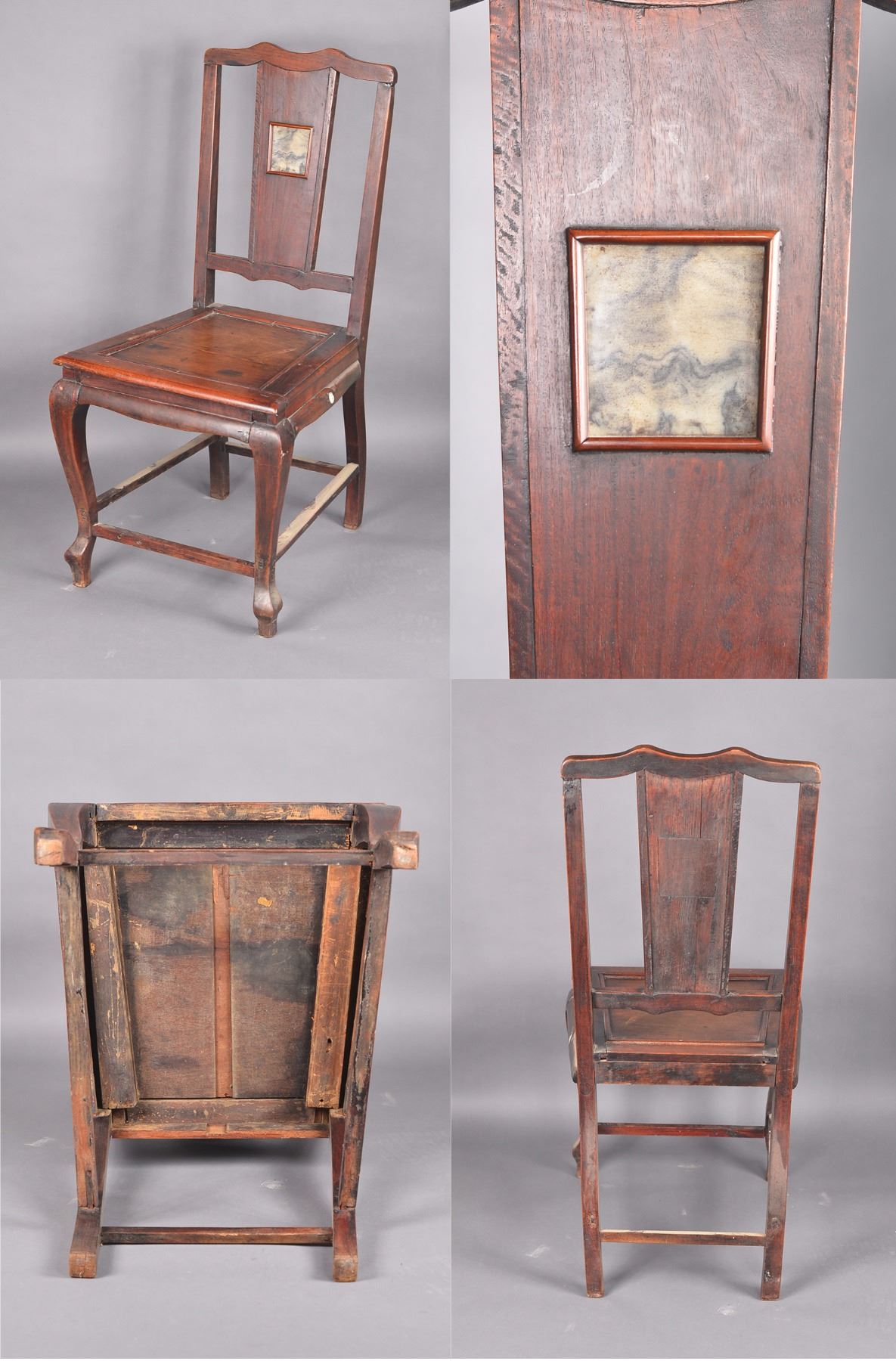 Set of four 18th Century Chinese carved rosewood chairs with marble dreamstone. L: 47 cm, W: 45 cm, H: 97 cm.