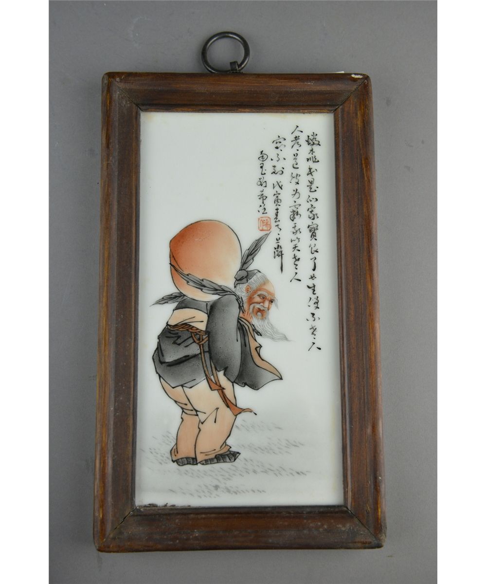 Set of four (4) framed Chinese porcelain plaques; featuring scholar figure; inscribed and signed with one seal; L: 24 cm, W: 12 cm