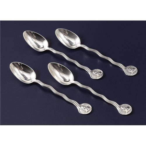 <B>A Set of Four American Silver Demi-Tasse Spoons</B></I><BR><BR>Gorham Manufacturing Co., Providence, Rhode Island<BR>1885<BR>Silver<BR>Marks: (lion-anchor-G), (Boar's head), <I>9</B></I><BR>3.88 inches long<BR>1.09 Troy ounces<BR><BR>With wave pattern handles and classical medallion to end.<BR><BR><b>Shipping:</b> Requires 3rd Party Shipping (<a target="_blank" href="http://www.heritageauctions.com/common/shipping.php">view shipping information</a>)