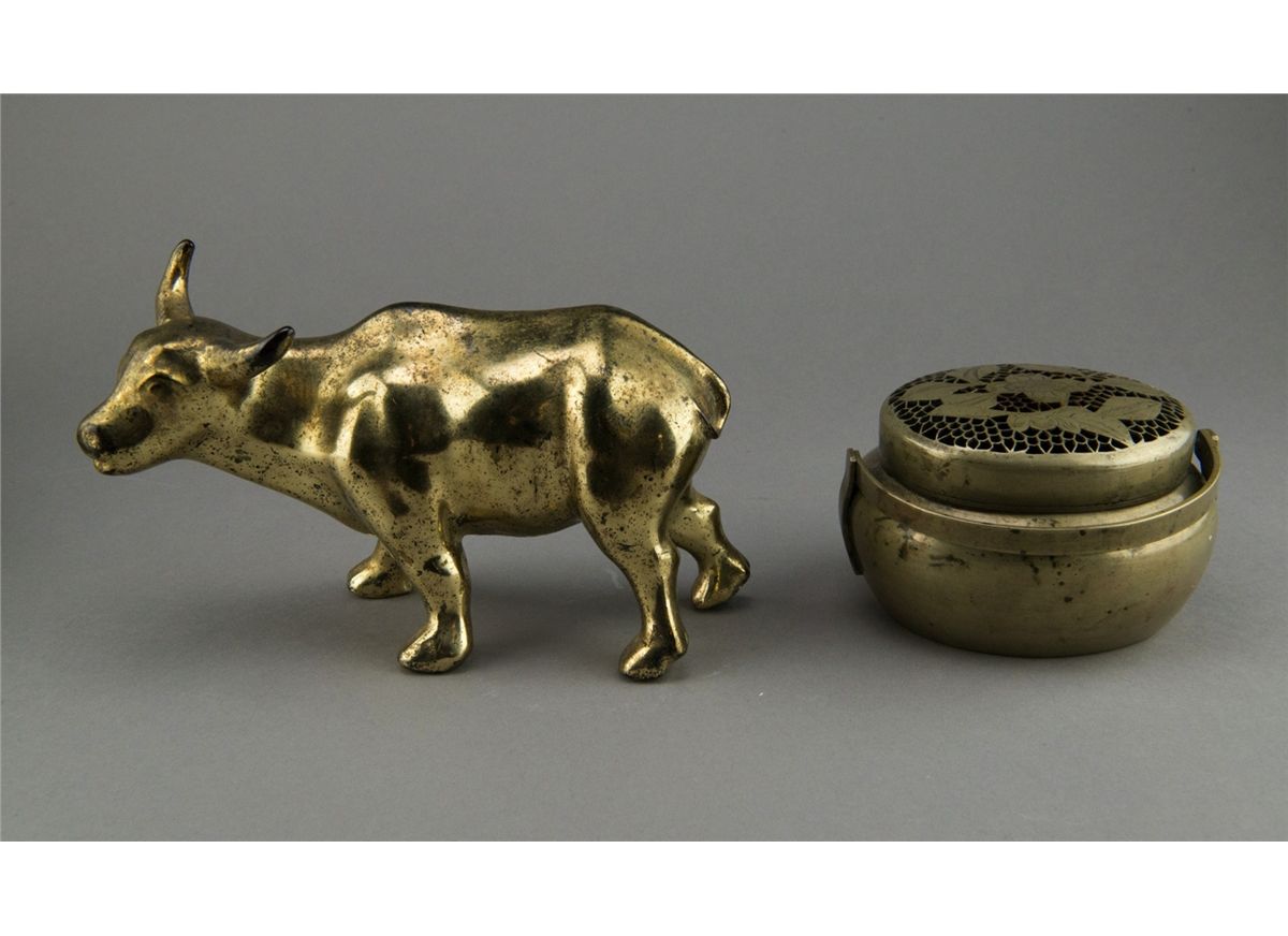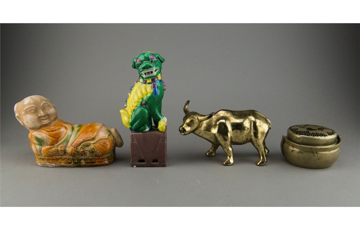 Group of four Chinese ceramics and bronzes; (Cow figure) H: 10 cm, L: 17 cm, 295 grams