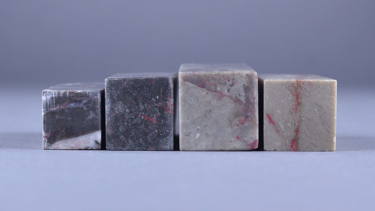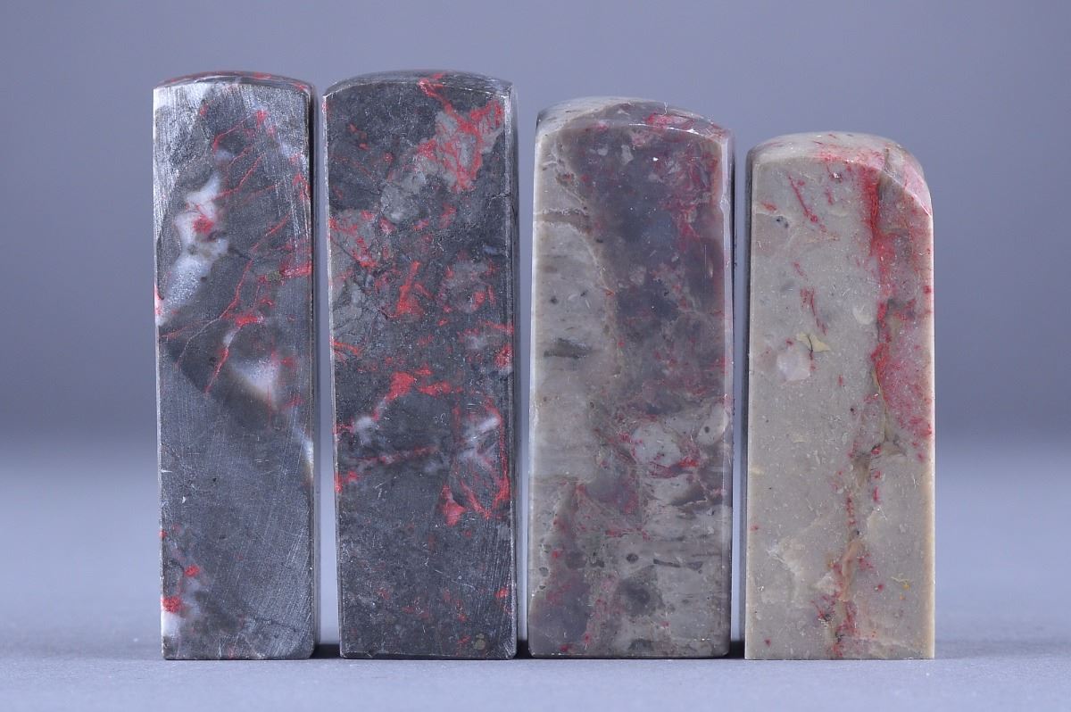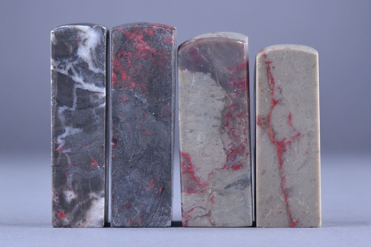 Set of four Chinese chicken bloodstone carved seal blocks; H: 7 cm, 121 grams (1); H: 7.5 cm, 104 grams (2); H: 6.5 cm, 89 grams (3); H: 7 cm, 72 grams (4)