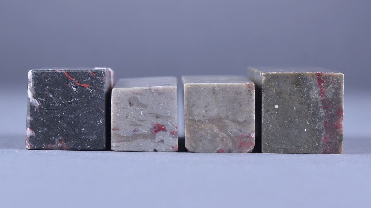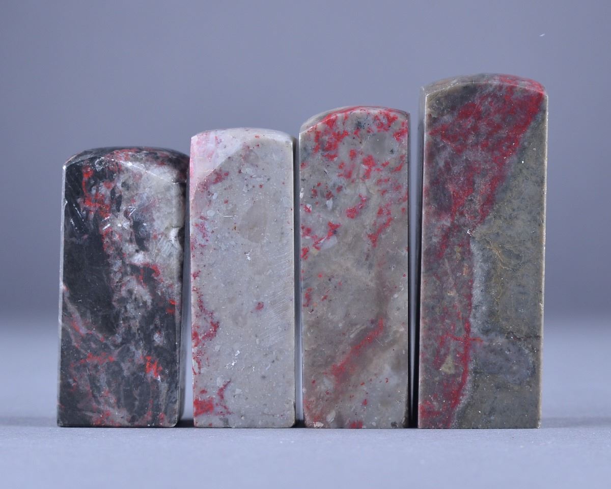 Set of four Chinese chicken bloodstone carved seal blocks; H: 7 cm, 113 grams (1); H: 6 cm, 68 grams (2); H: 5.5 cm, 94 grams (3); H: 6.5 cm, 81 grams (4)
