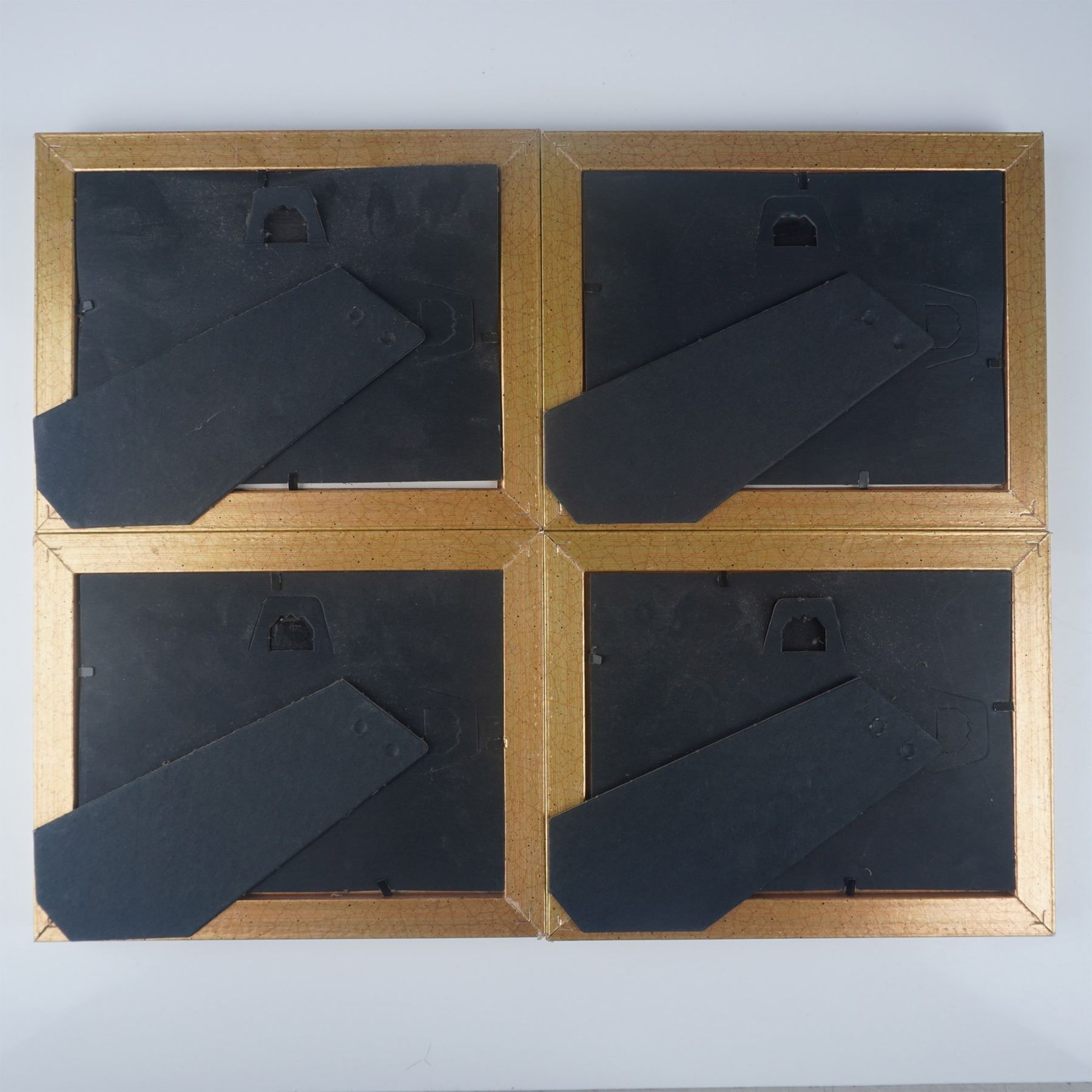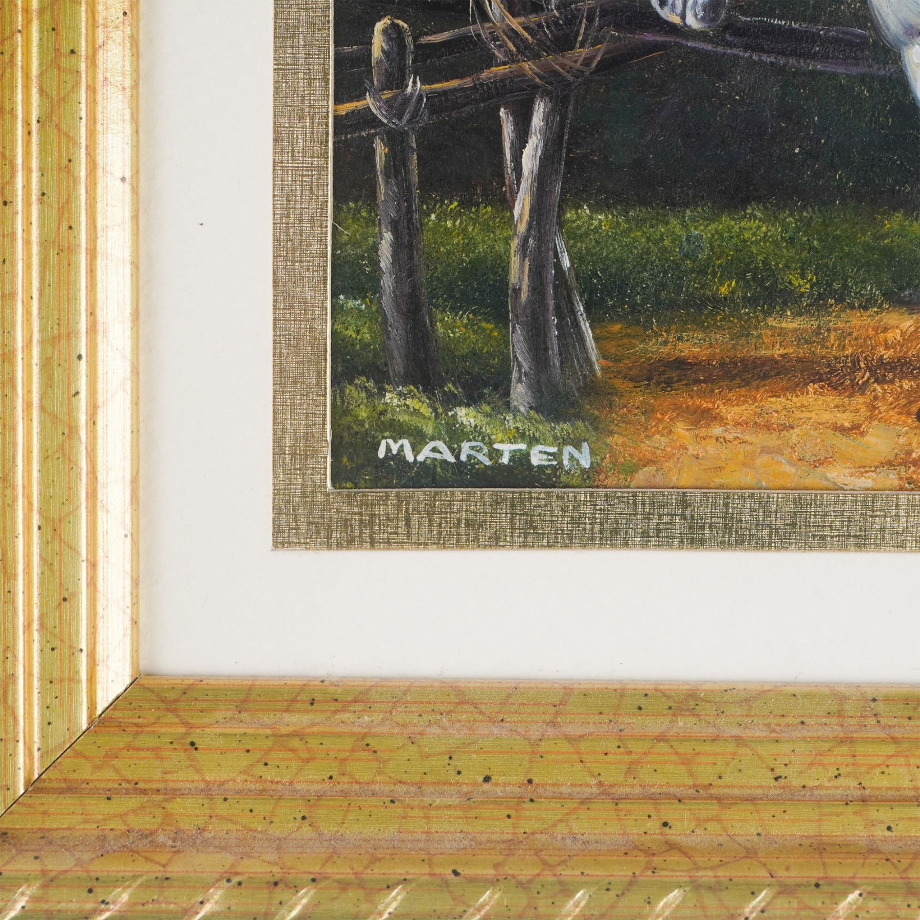 This lot features a set of four framed oil paintings, each capturing a delightful rustic animal scene with vivid detail. The collection includes a barnyard scene with a mother goat and her two kids accompanied by doves, a playful depiction of kittens signed by Harris, a serene portrayal of a white horse in a countryside setting signed by Marten, and a vibrant meadow scene with grazing cows. Each piece is elegantly framed in a gilded wooden frame with intricate accents, enhancing their charm and appeal.