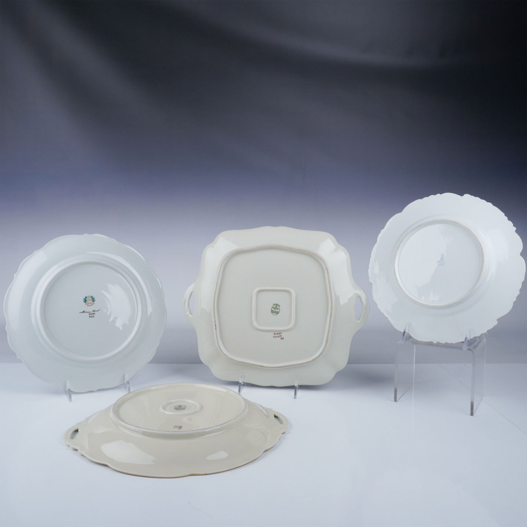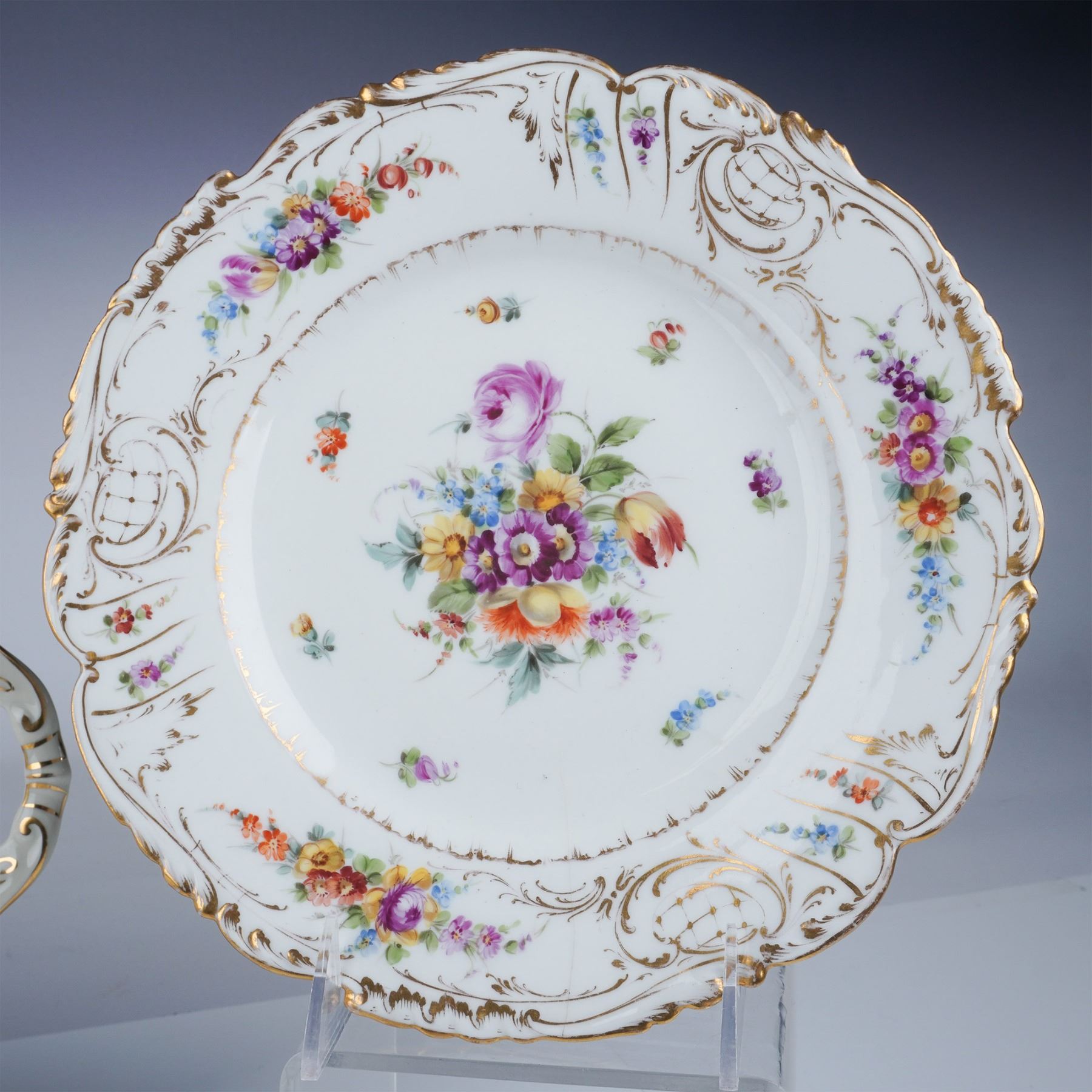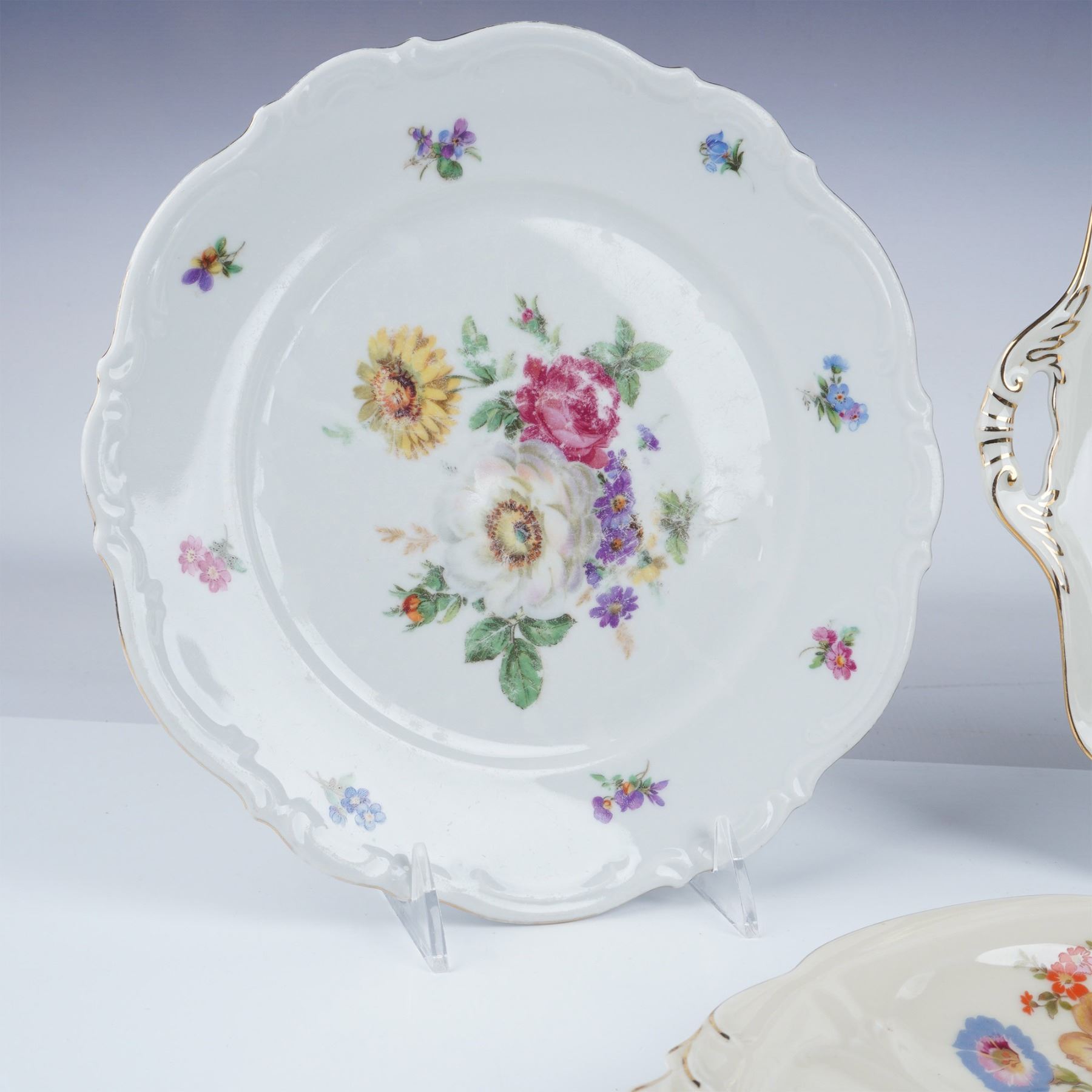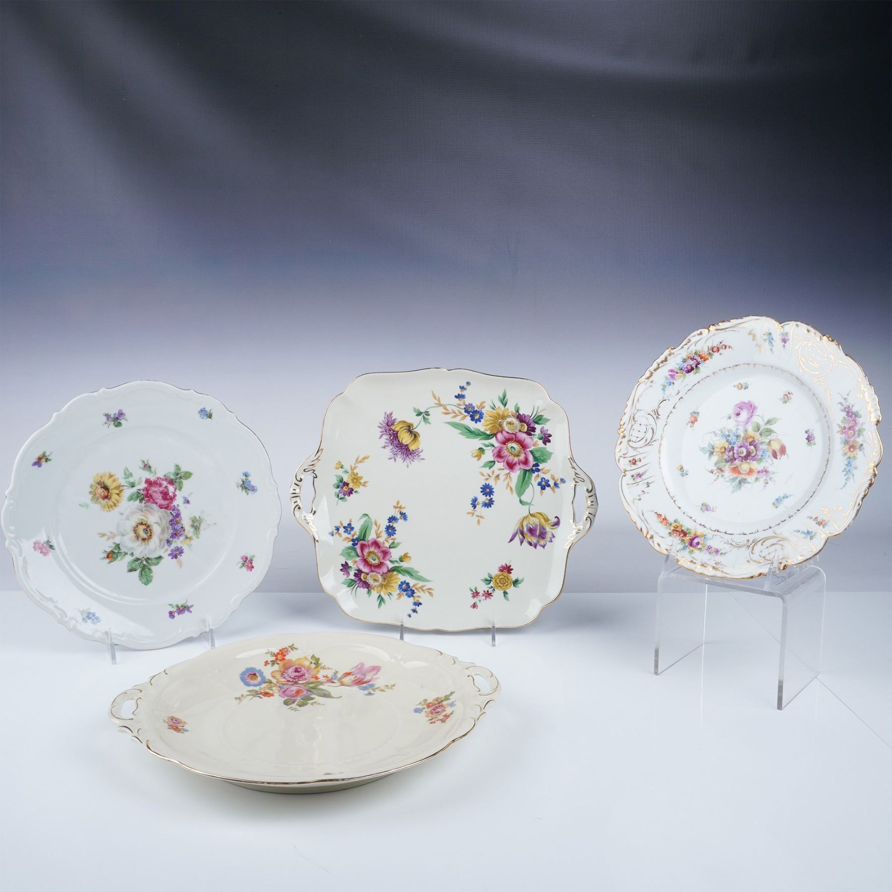 A set of four German porcelain plates featuring handpainted floral designs and gold accents. Includes pieces marked Mitterteich Bavaria in a Meissen Floral pattern, Kronach Bavaria, Hutschenreuther Hohenberg (1814-1939), Madeleine by Hutschenreuther and Dresden Richard Klemm. The largest plate measures 12.5"L. Perfect for collectors or elegant table settings.