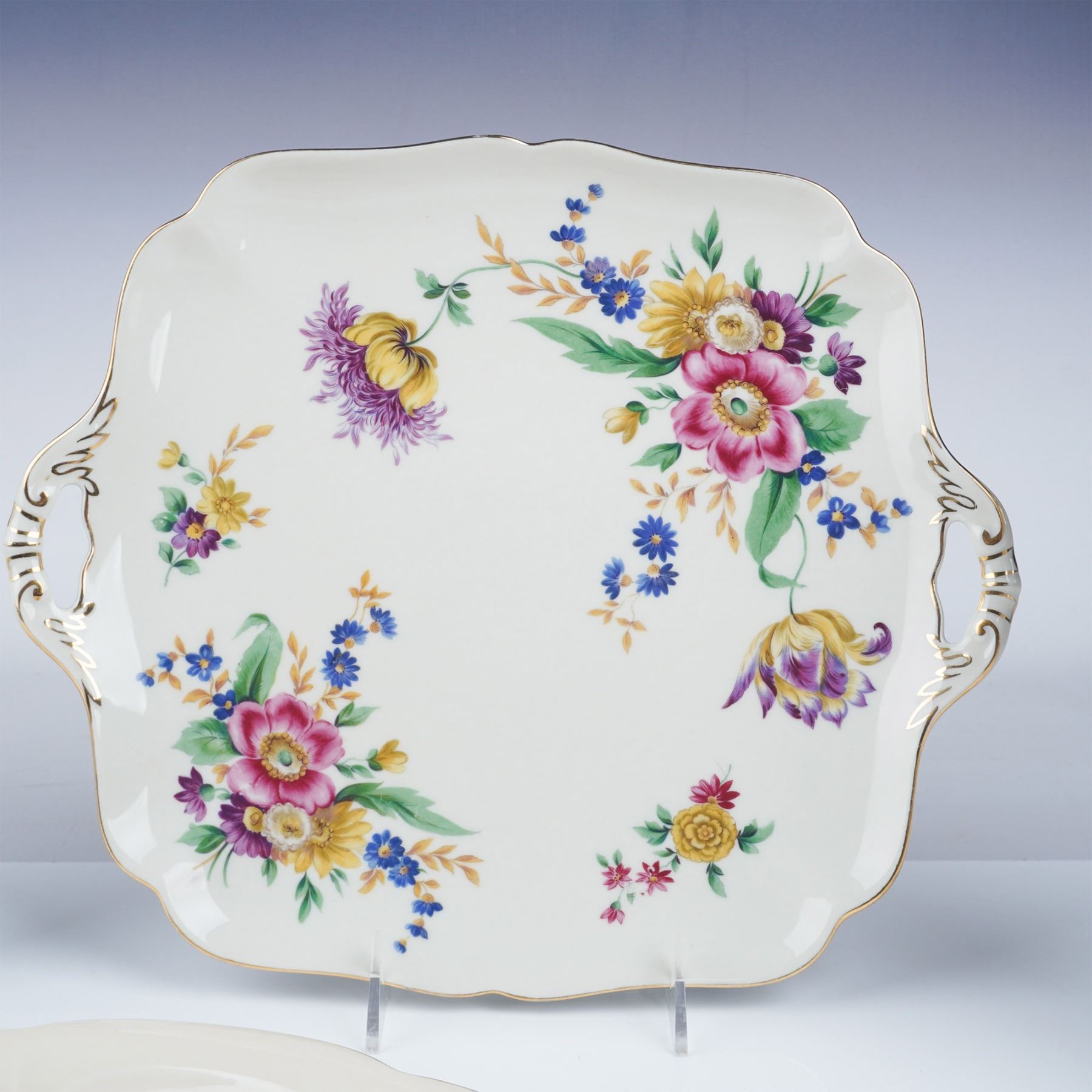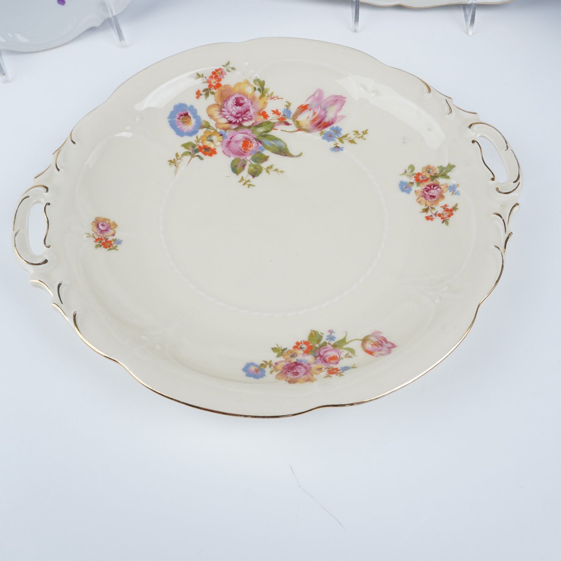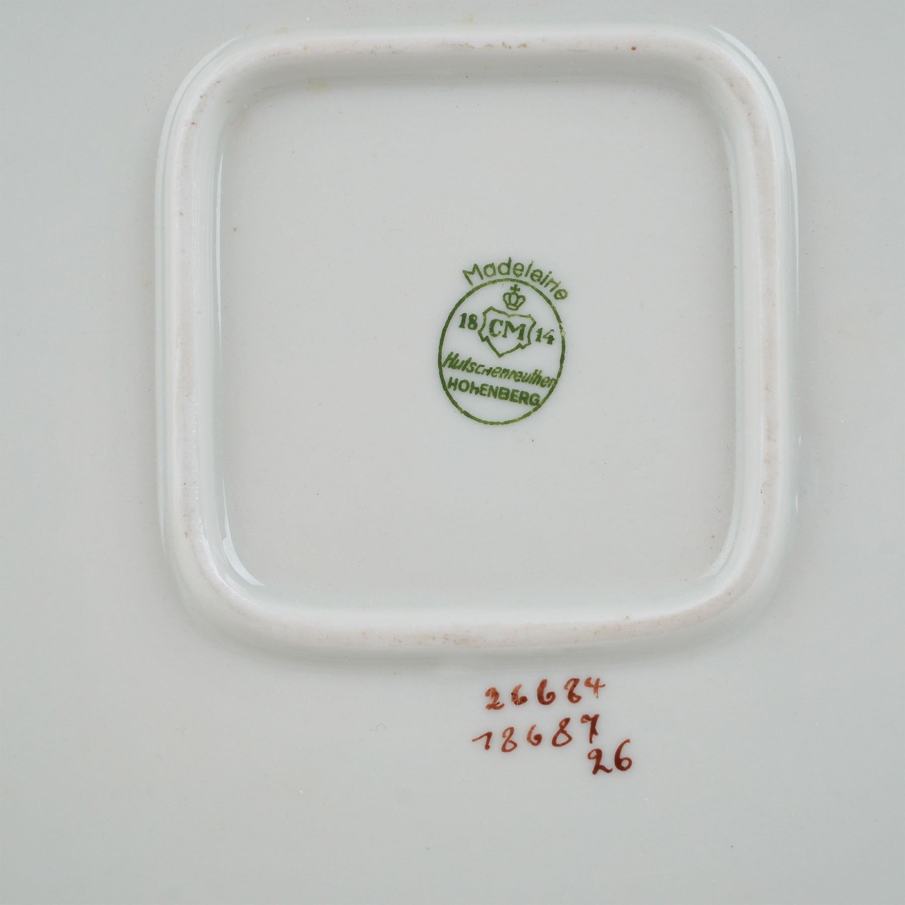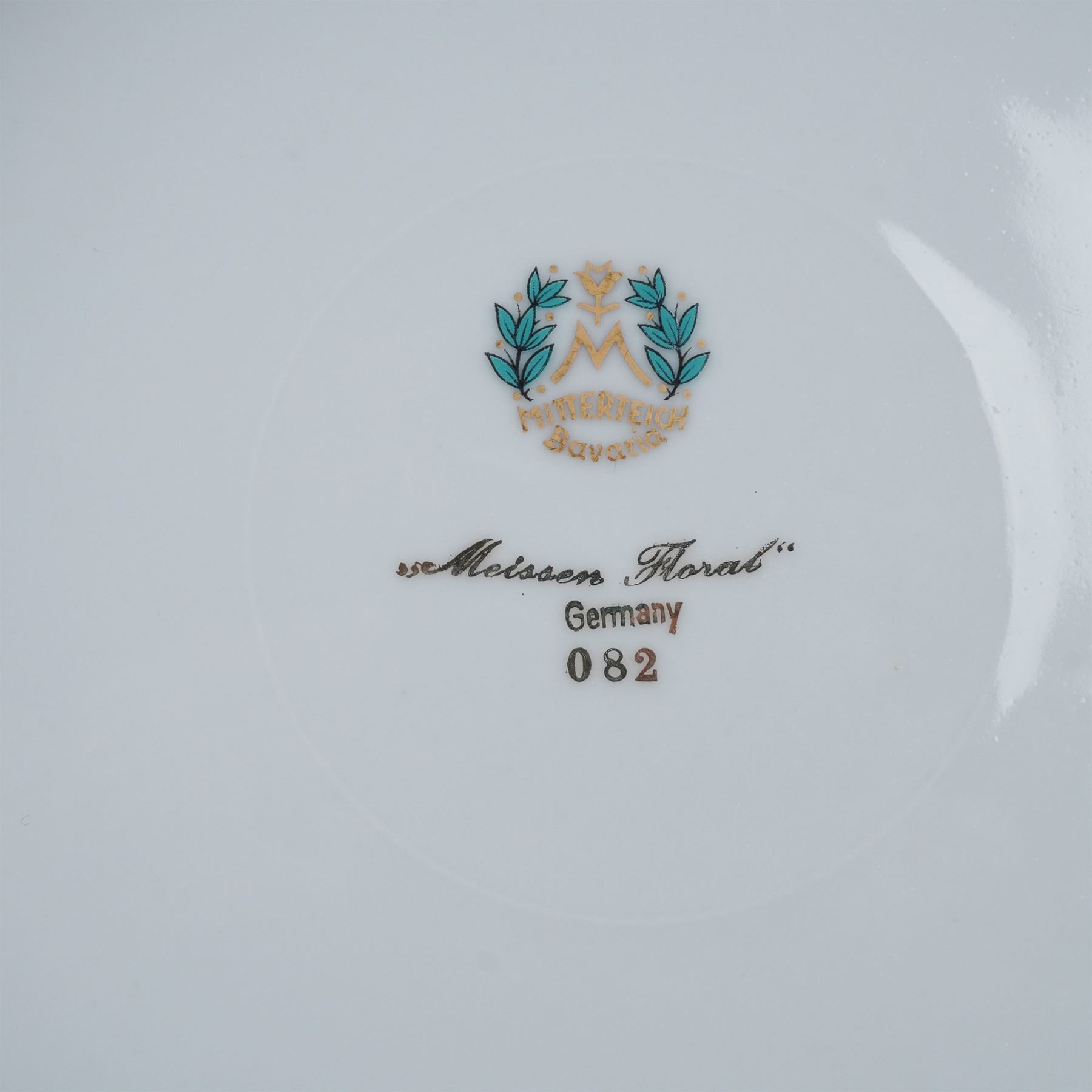 A set of four German porcelain plates featuring handpainted floral designs and gold accents. Includes pieces marked Mitterteich Bavaria in a Meissen Floral pattern, Kronach Bavaria, Hutschenreuther Hohenberg (1814-1939), Madeleine by Hutschenreuther and Dresden Richard Klemm. The largest plate measures 12.5"L. Perfect for collectors or elegant table settings.
