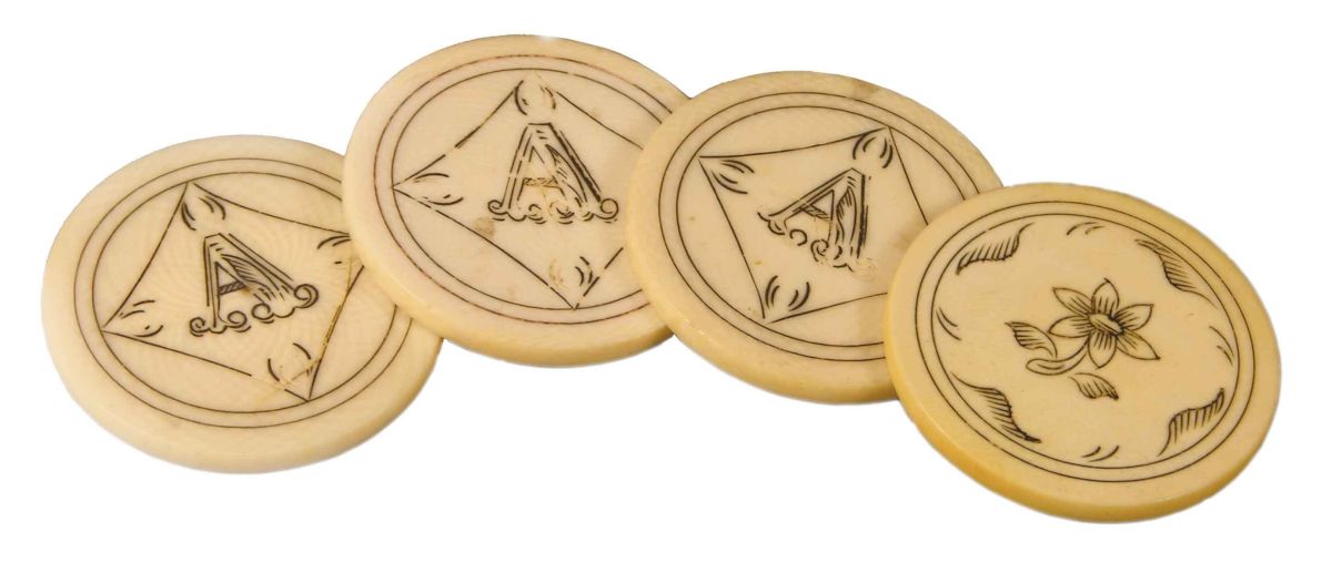 Set of Four Ivory Poker Chips, three with "A" and one with a flower. Very good used condition.