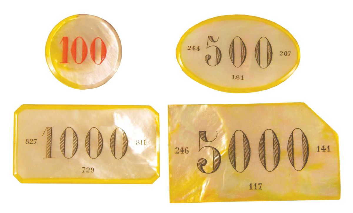 Set of Four Mother of Pearl Gambling Markers. $100, $500, $1000 and $5000 increments. Near mint condition.