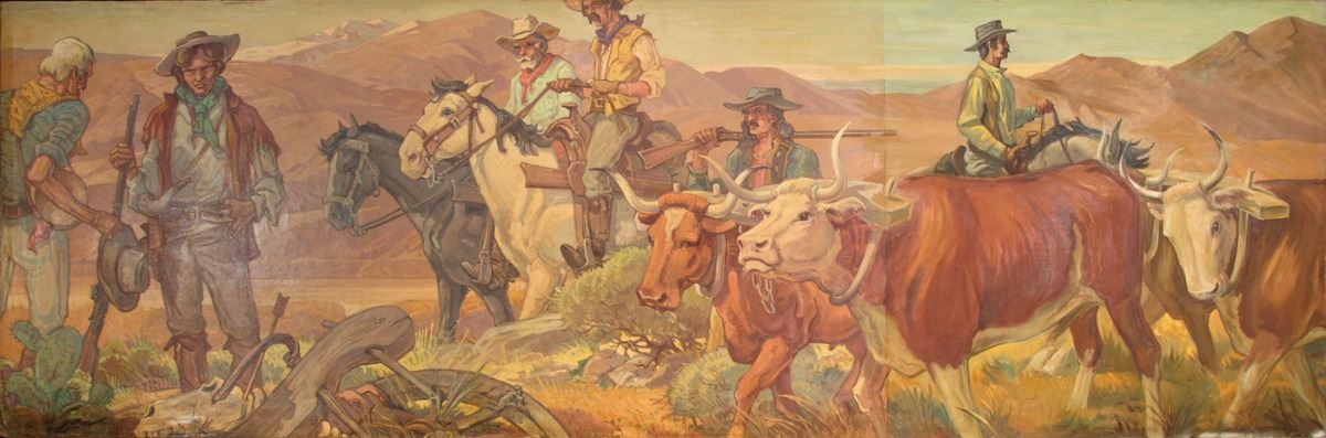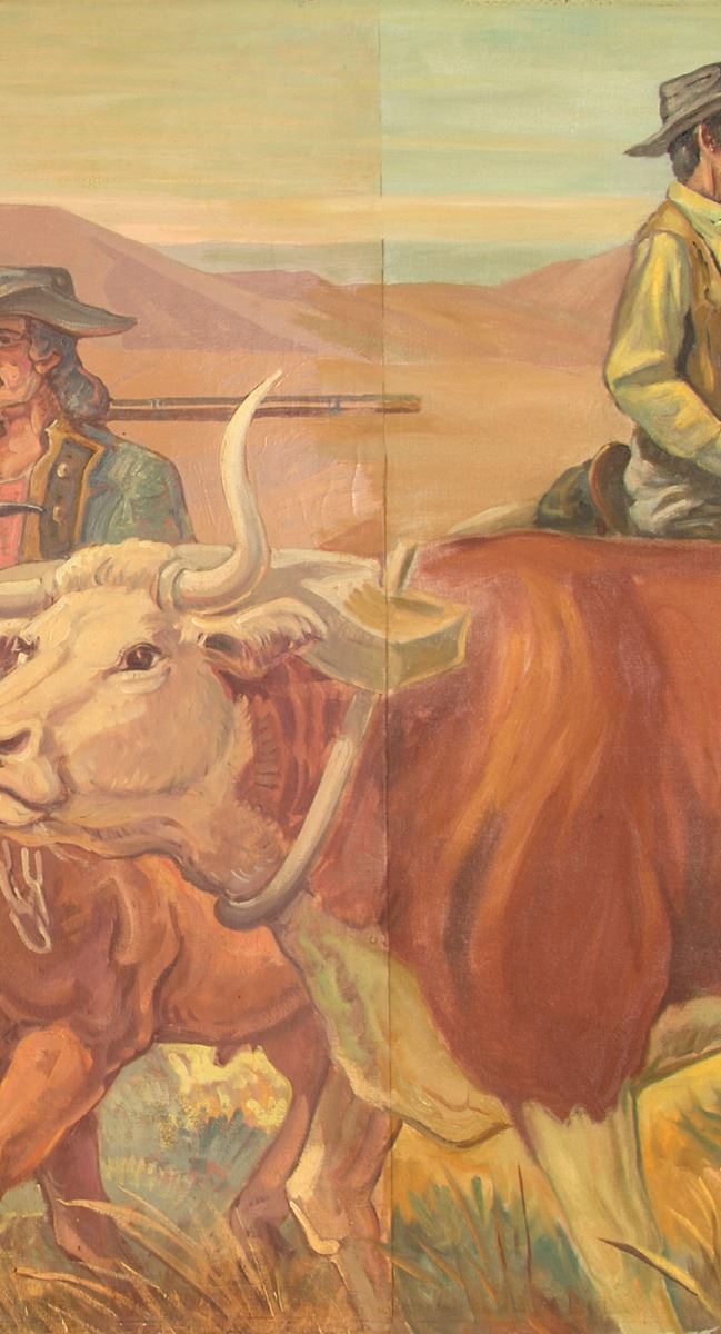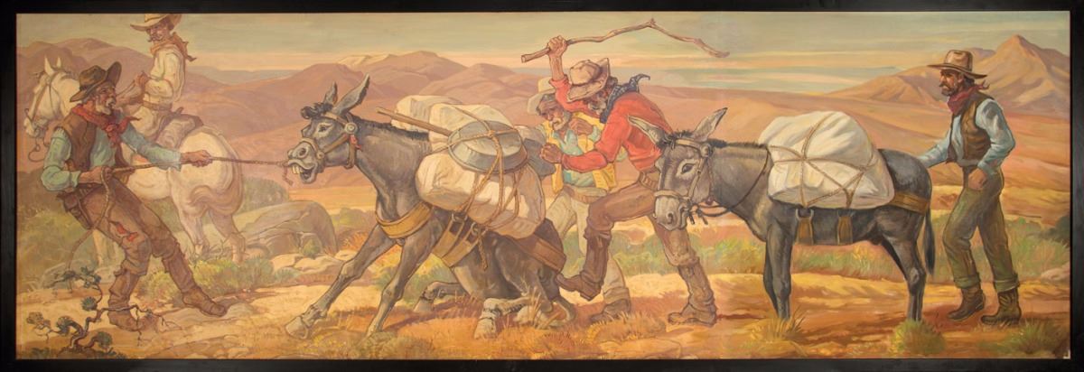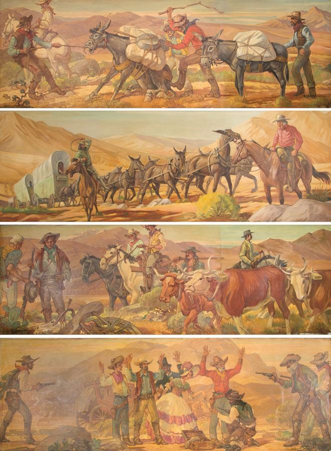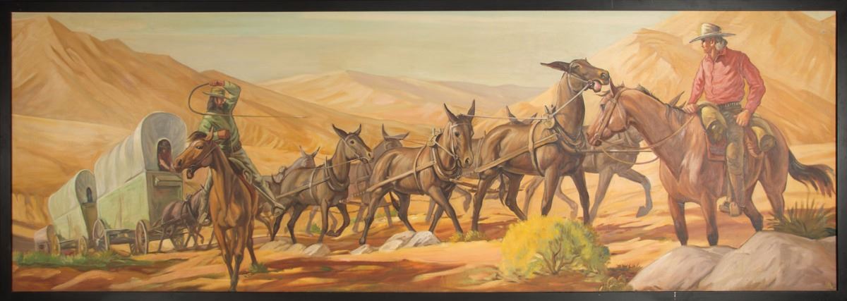 Hand-painted large murals from the walls of Binion’s former "The Westerner" casino in Las Vegas, Nevada. The set of 4 murals are painted in the WPA style, and depict various scenes of the American Frontier West: miners with misbehaving mules, Conestoga wagons on the prairie, pioneers with oxen, and of course, a stagecoach robbery. They work very well together or could be used separately and still make a great statement. They are unsigned, though appear to have possibly been painted by two different artists. All four are oil on canvas, mounted to board. Four feet high and twelve feet wide, each measures 48” x 144 1/4". Two are framed to 146 3/8" x 50 1/4"; the other two are unframed.