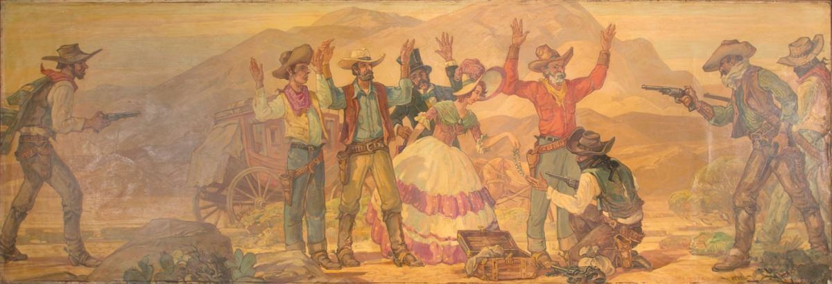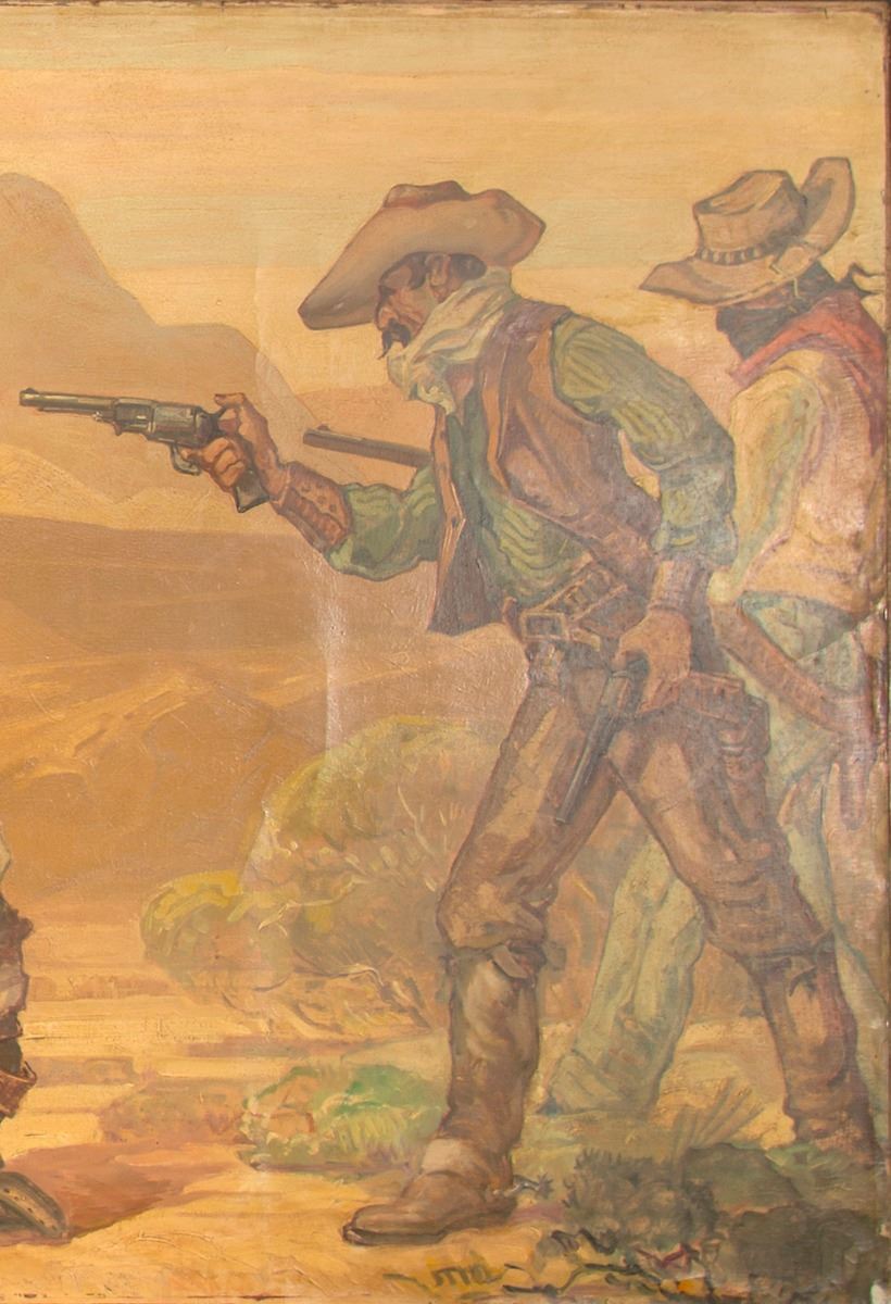 **After further study we feel these historic mural paintings were executed by 2 fine artists who did the drawing and finished the main figures, the negative space was filled by a team of several artists as is normal with fine large works. The murals were left in place in the public area of the casino and survived 2 remodels, during the 3rd redo in the 1960’s the murals were removed and eventually sold to the current owners.