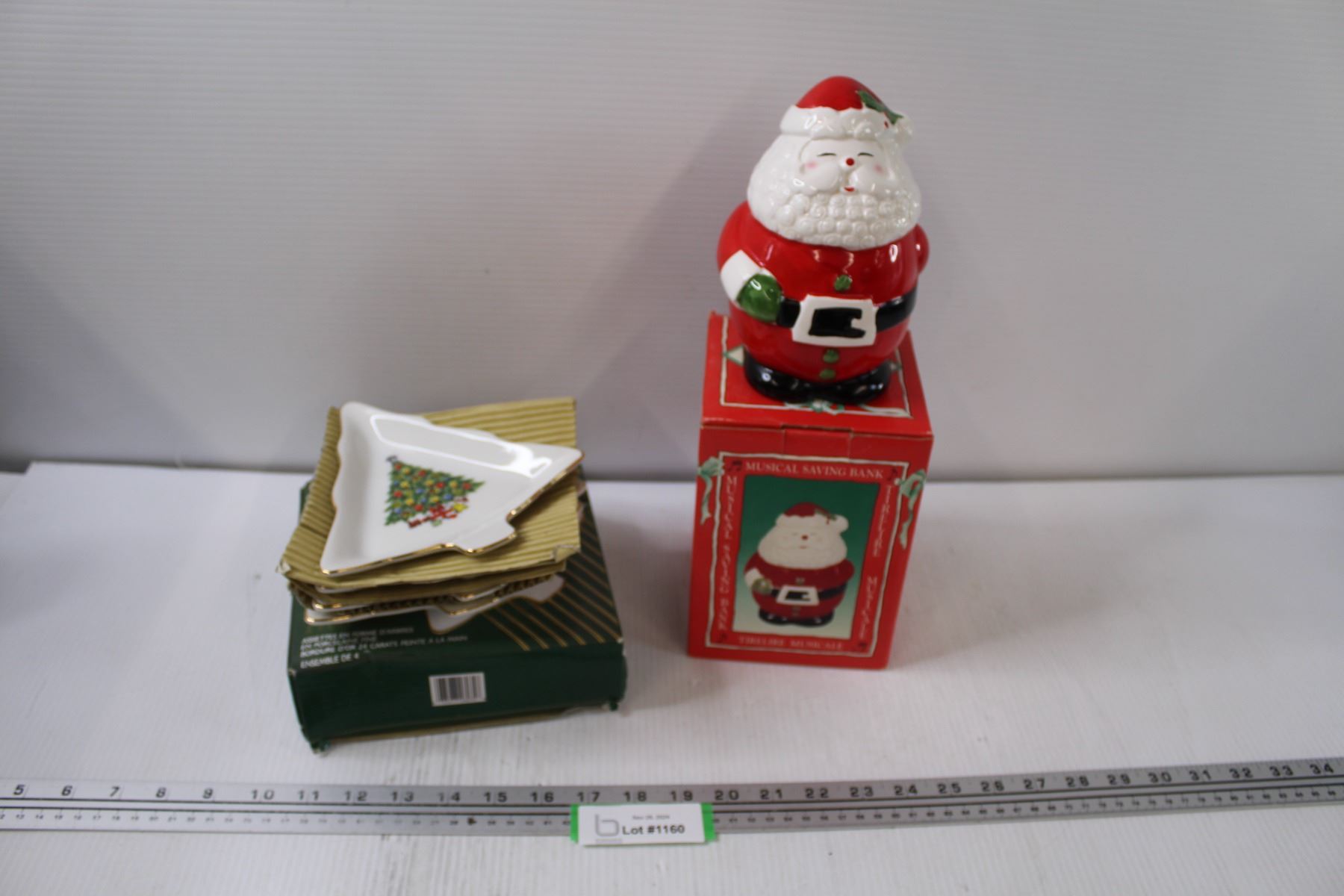Set of Four Porcelain Tree-Shaped Dishes, Santa Musical Saving Bank