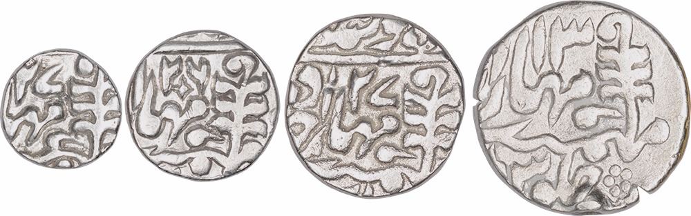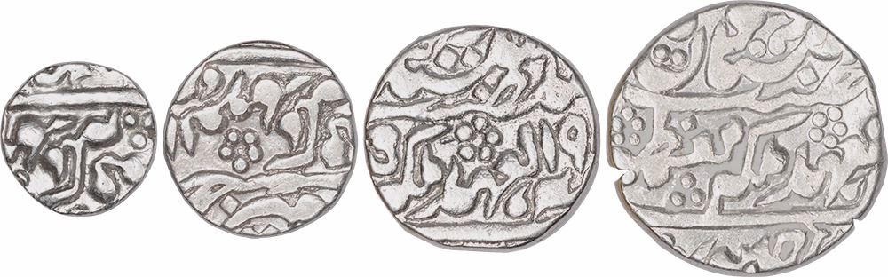 Jaipur State, Madho Singh II, Sawai JaipurMint, Silver 1/8, 1/4, 1/2 Rupee,27, 26, 27, 13 RY,With the name ofVictoria, Obv:ba ahd malika-e-muazzam sultanat-e-inglistan,Rev:ruler's name, zarb jhar mark,11.30g, 5.39g, 2.79g, 1.31g 21mm, 18mm, 15mm, 12mm,(KM # 137, 139, 142 145),about very fine.