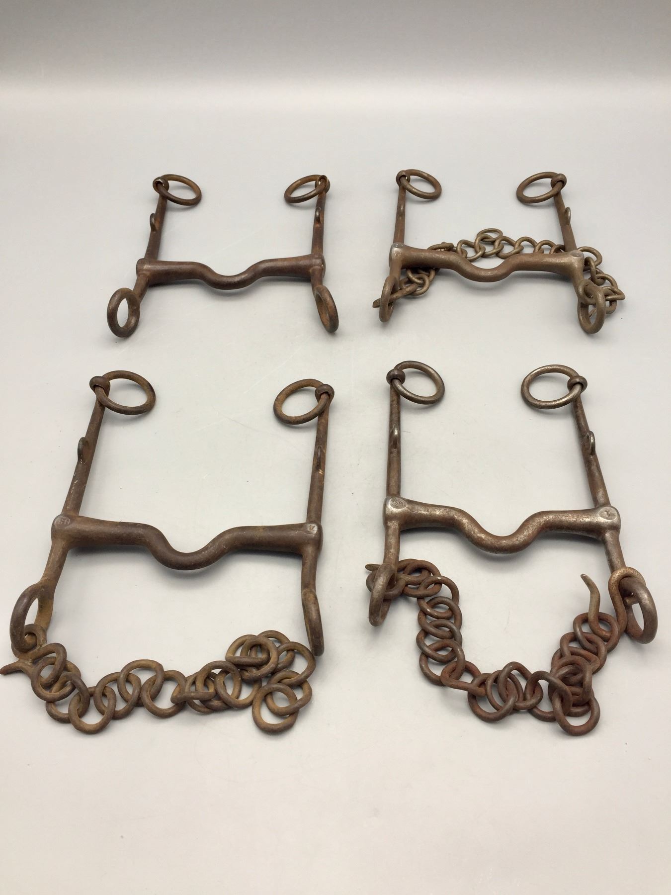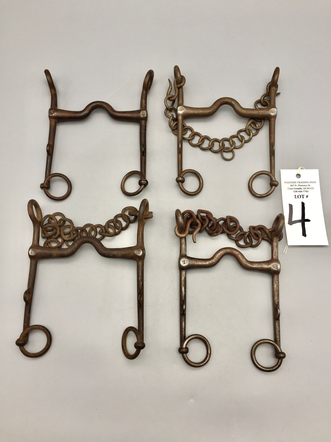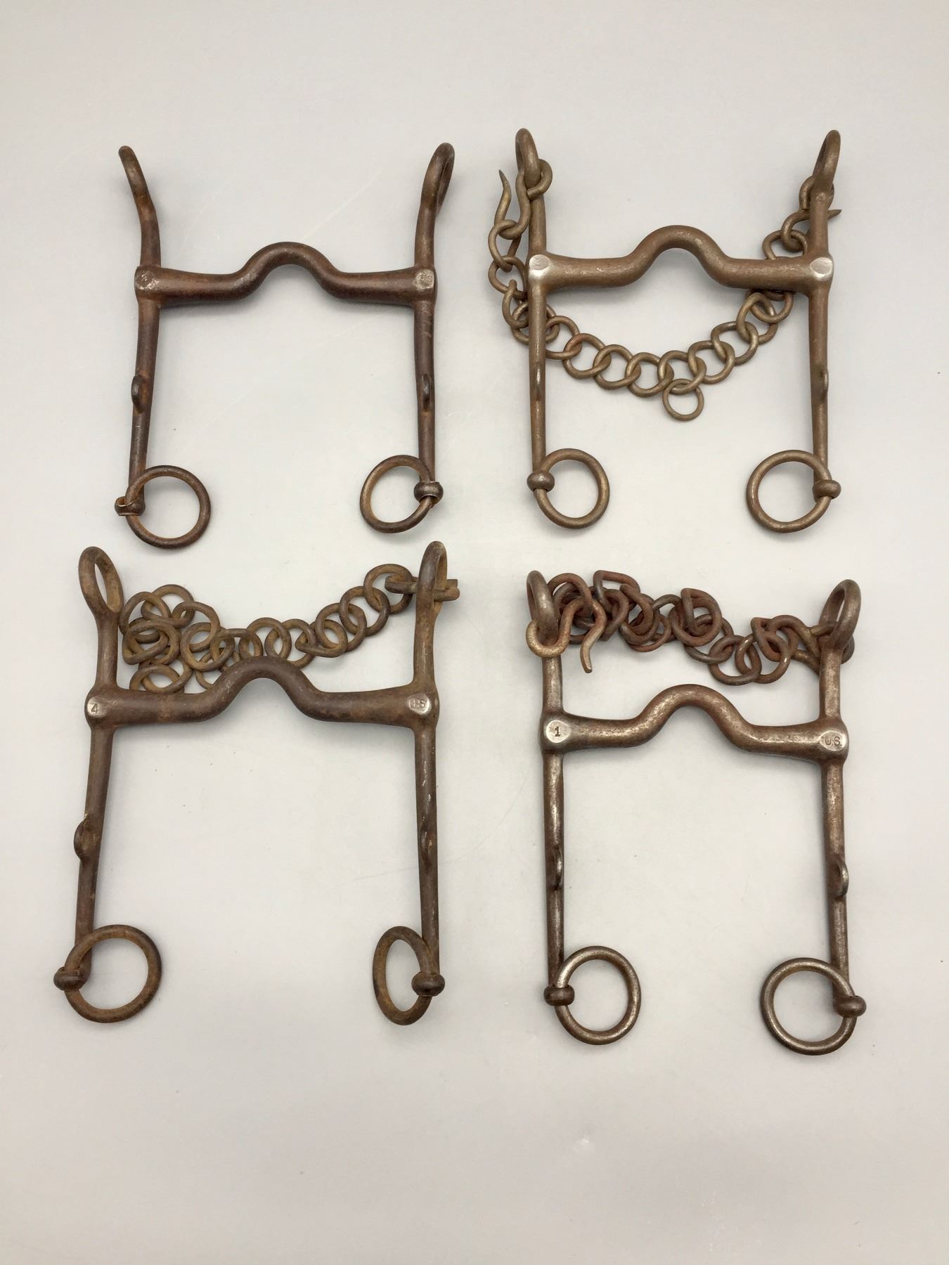 Description: Featured for sale in this lot is four US Calvary bits. These bits include Numbers 1, 2, 3, and 4 (all 4 sizes). Maker: Unknown. Approx. Age: Circa early 1900s vintage. Size: Varies from mouth 4-3/4” , shank is 7” long to mouth 4-7/8”, shank is 7” long. Condition: Good for their age, normal wear expected. Please look closely at the pictures - they are an important part of our description. Shipping: There will be a $5 handling / packaging fee for shipping this lot. The actual cost of postage will be added on top of that.