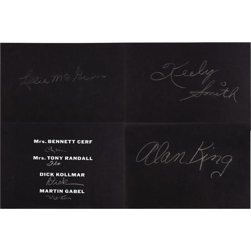<B>Set of Four "What's My Line?" Guest Cards Signed by Alan King and Others.</B></I> Set of four 26" x 18" black cards from the show signed in white chalk by Alan King, Lillie McGuire, Kelly Smith, and Phyllis Cerf, Flo Randall, Dick Kolmar, and Martin Gabel. In Very Fine to Excellent condition with some mild smearing.<BR><BR><b>Shipping:</b> Flat Material, Large (<a target="_blank" href="http://www.heritageauctions.com/common/shipping.php">view shipping information</a>)