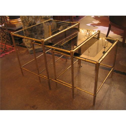 <table width="100%" border="0" cellspacing="0" cellpadding="4"><tr><td><em> </em></td></tr><tr> <td width="100%"> Set of 1940s French Bagues style brass nesting tables with original bordered smoked mercury glass tops from Nice. </td></tr><tr> <td> </td></tr><tr> <td>Reference #: BB4</td></tr><tr><td>Condition:excellent</td></tr><tr><td>Year:1940</td></tr><tr><td>Country:France</td></tr><tr><td>Height:18.25</td></tr><tr><td>Depth:15.25</td></tr><tr><td>Width:20.5</td></tr><tr><td>Title:Set of French Bagues Style Nesting Tables</td></tr><tr><td>Style:Bagues</td></tr><tr><td>Materials:brass, smoked mercury glass</td></tr><tr><td>Location:Austin, TX</td></tr></table>