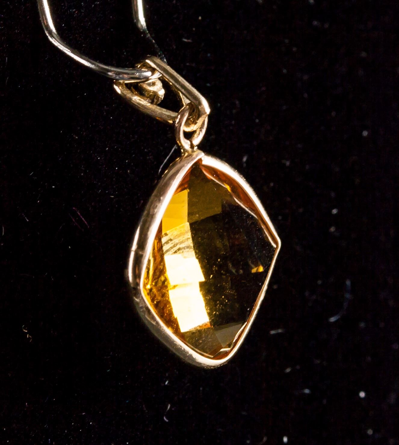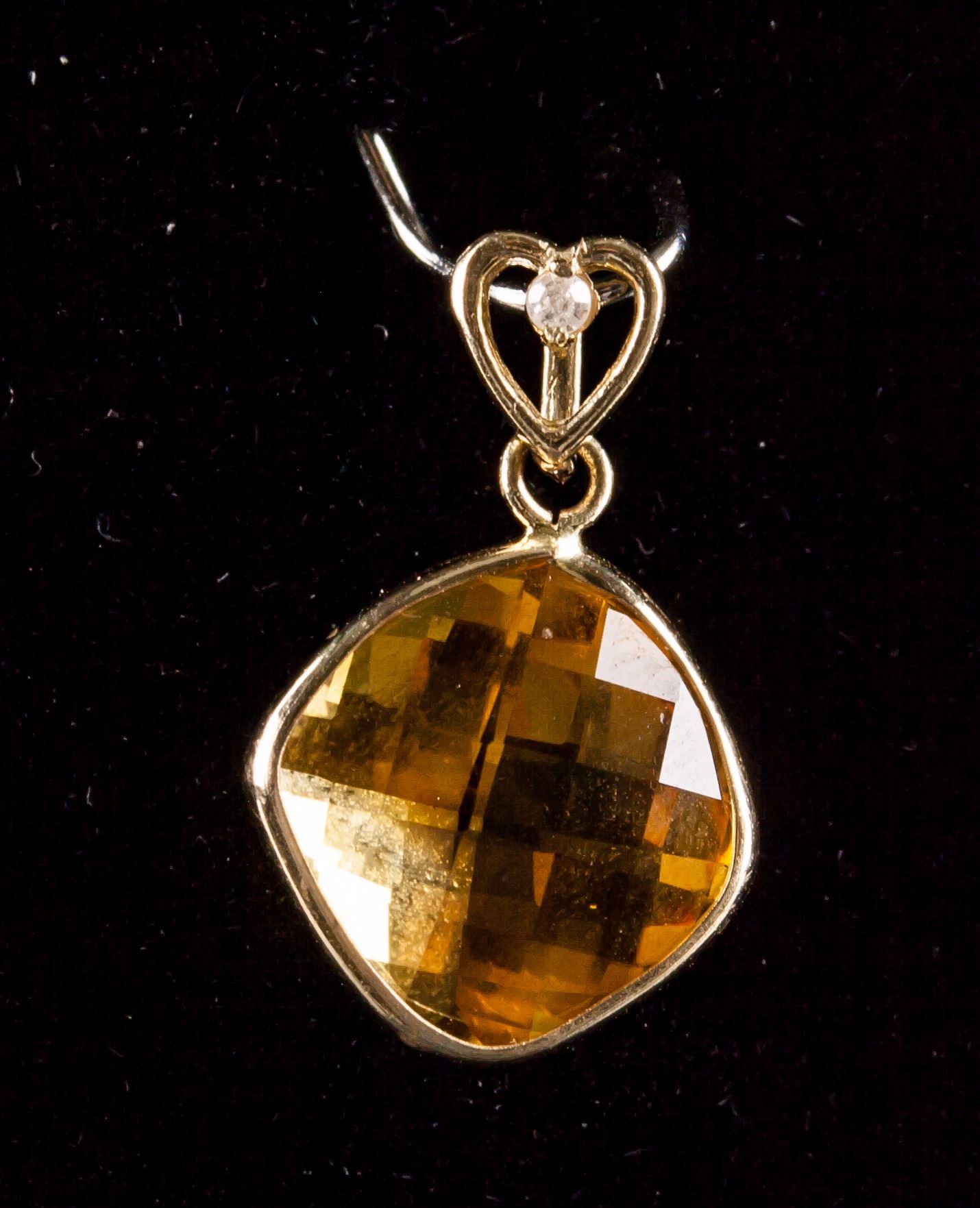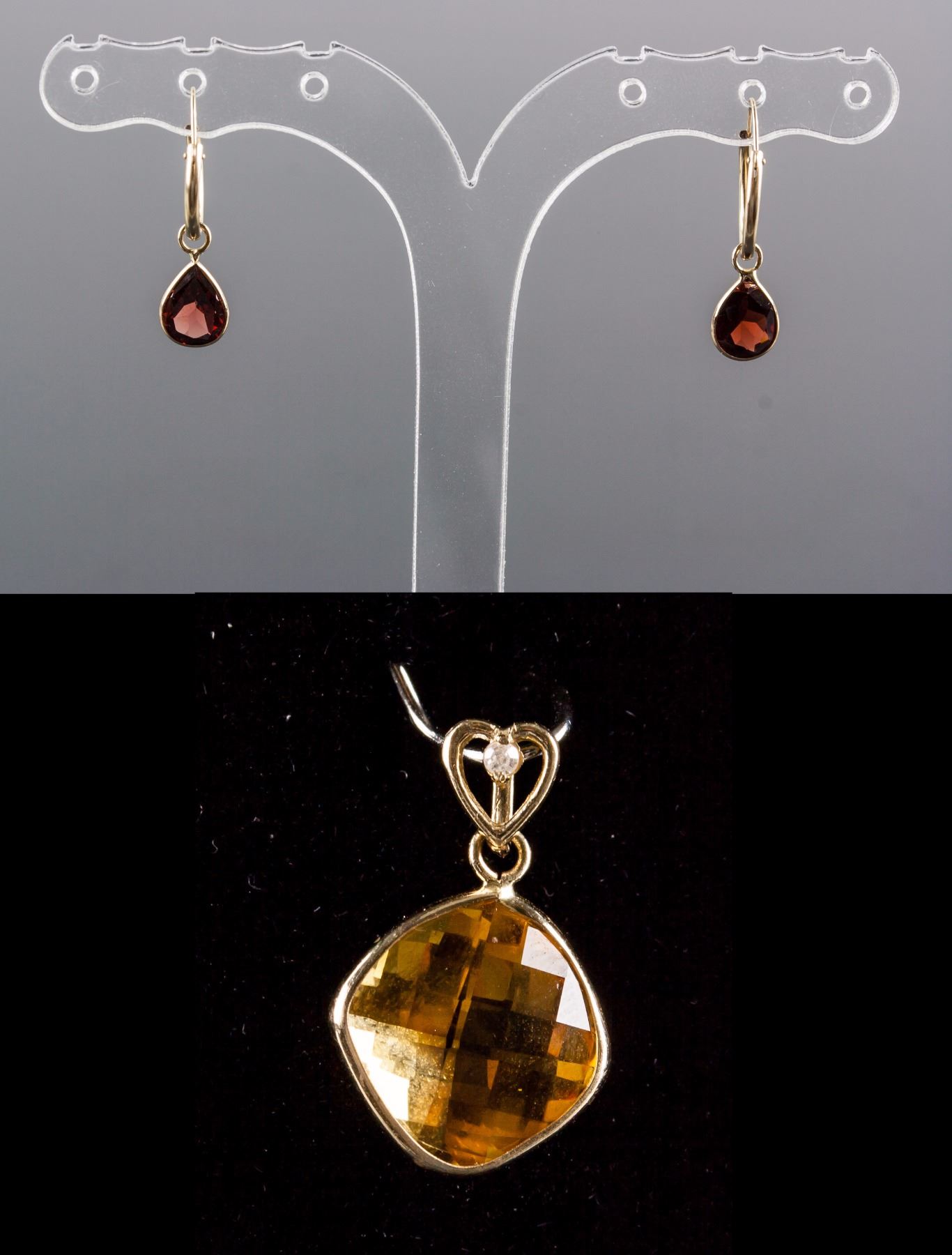Stamped 14k yellow gold earrings; set with 2.35ct pear shaped pinkish red garnet; certified replacement value $450; 0.83 grams; Stamped 14k yellow gold pendant; set with 2.50ct square cut yellow citrine with 0.01ct diamond bail; certified replacement value $598; 0.80 grams
