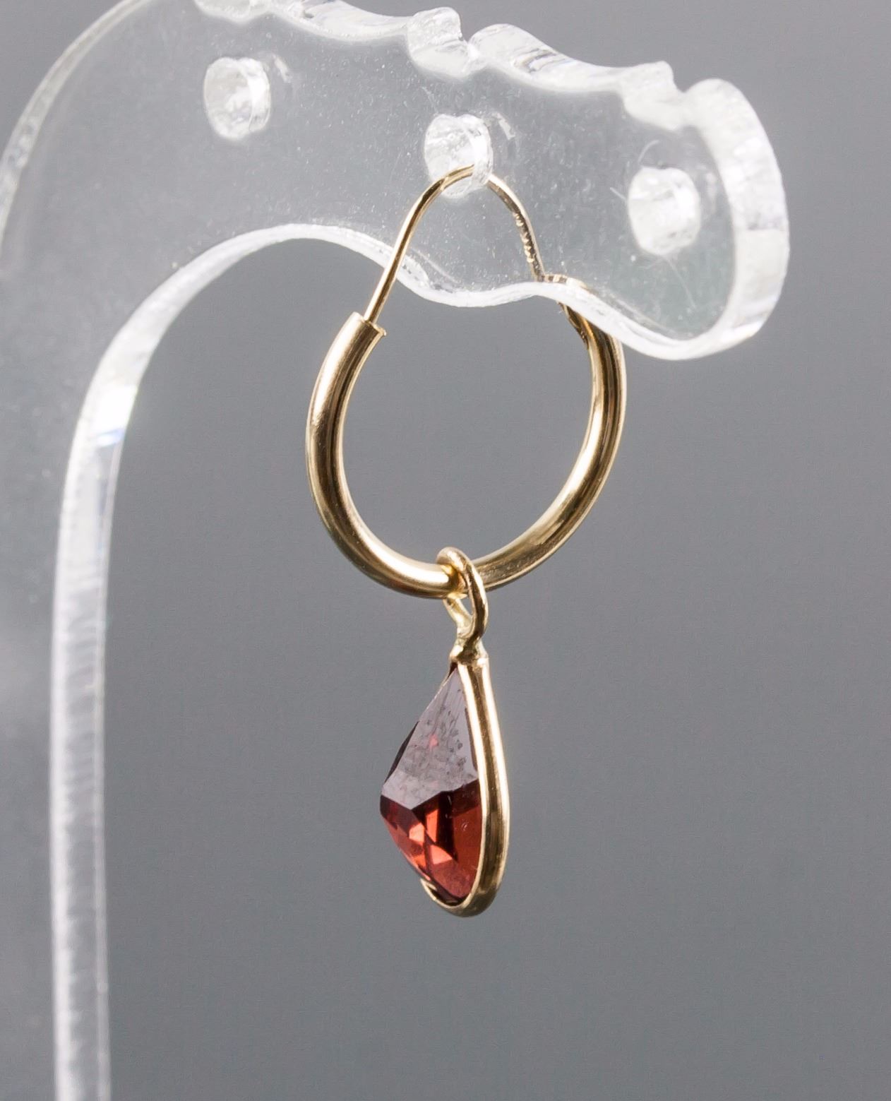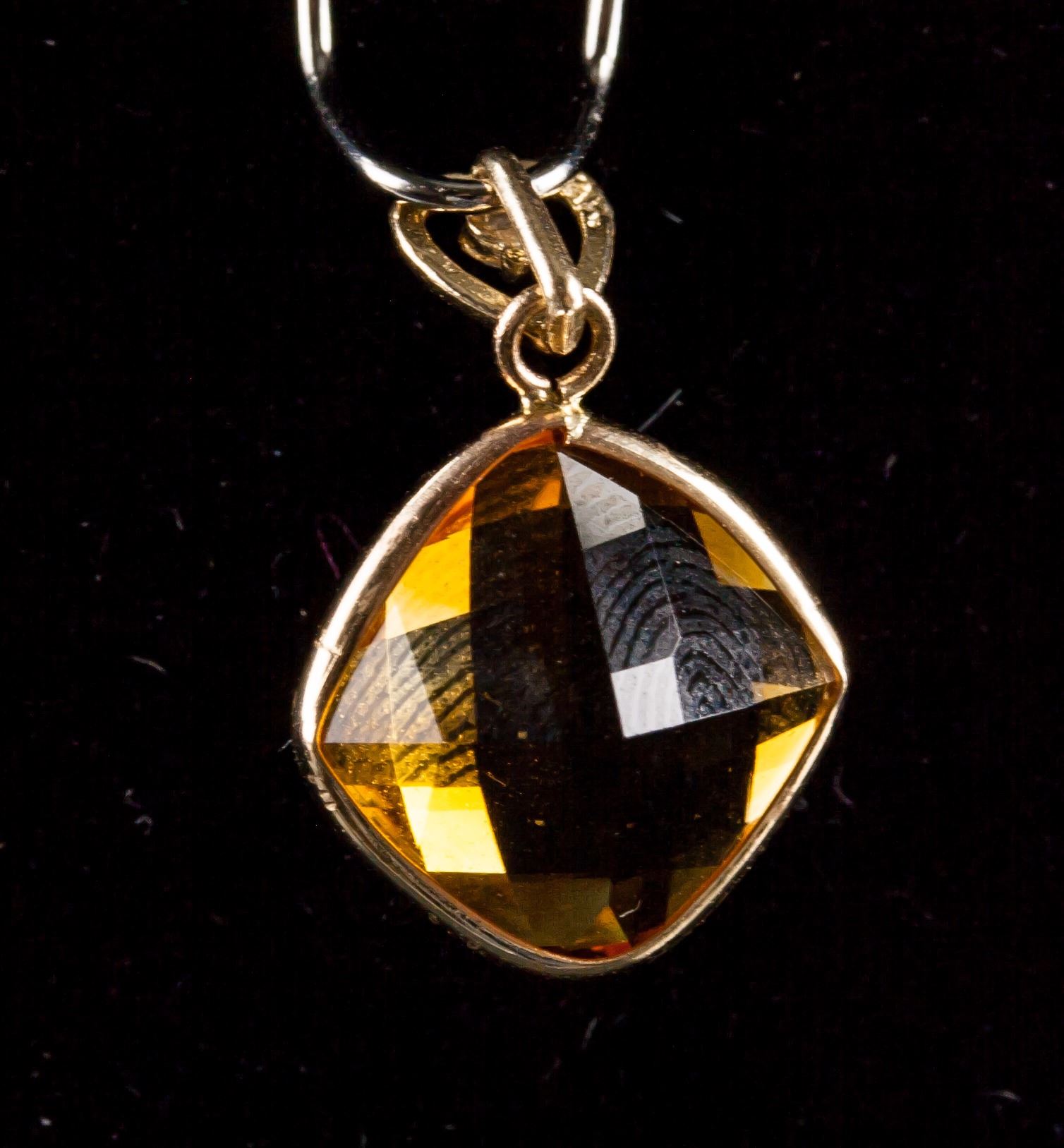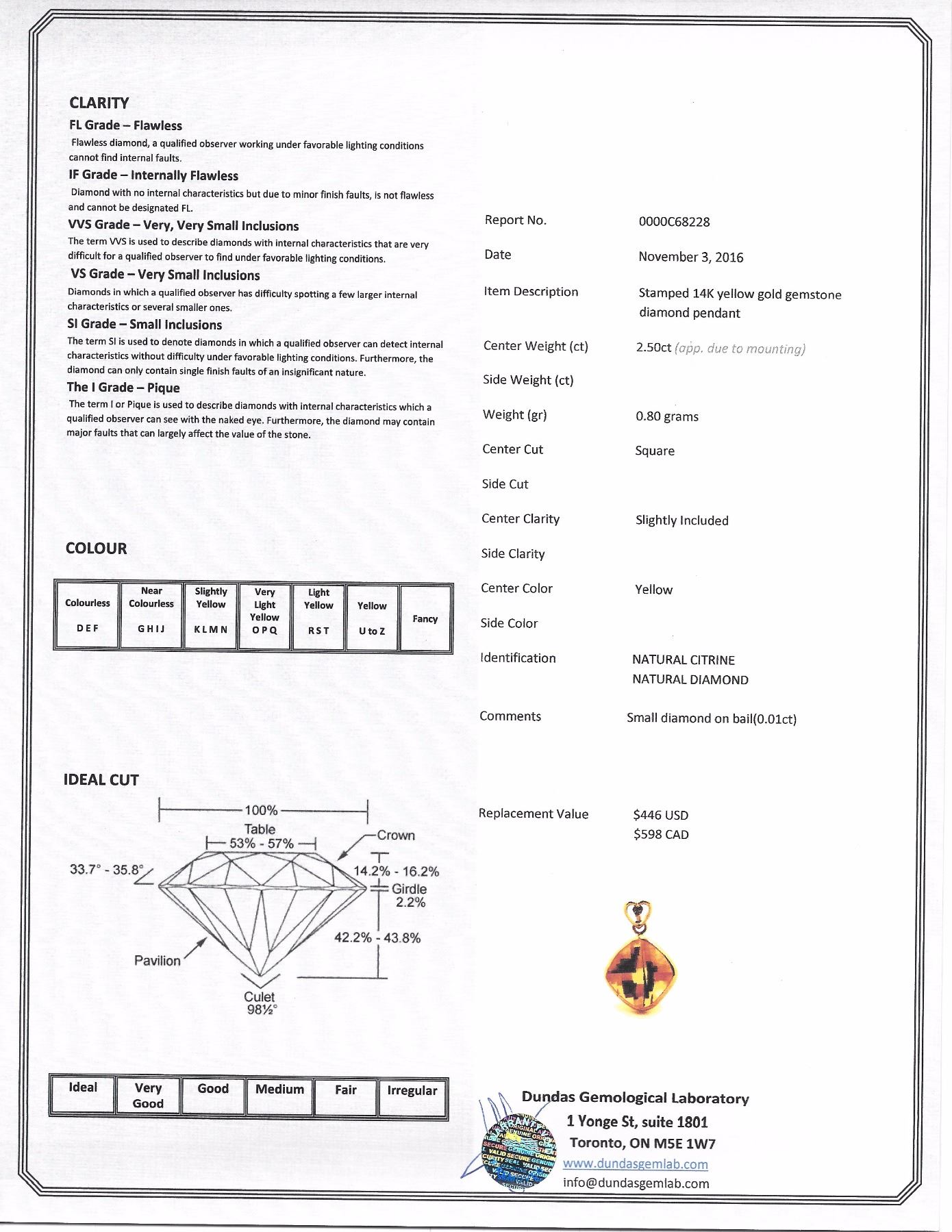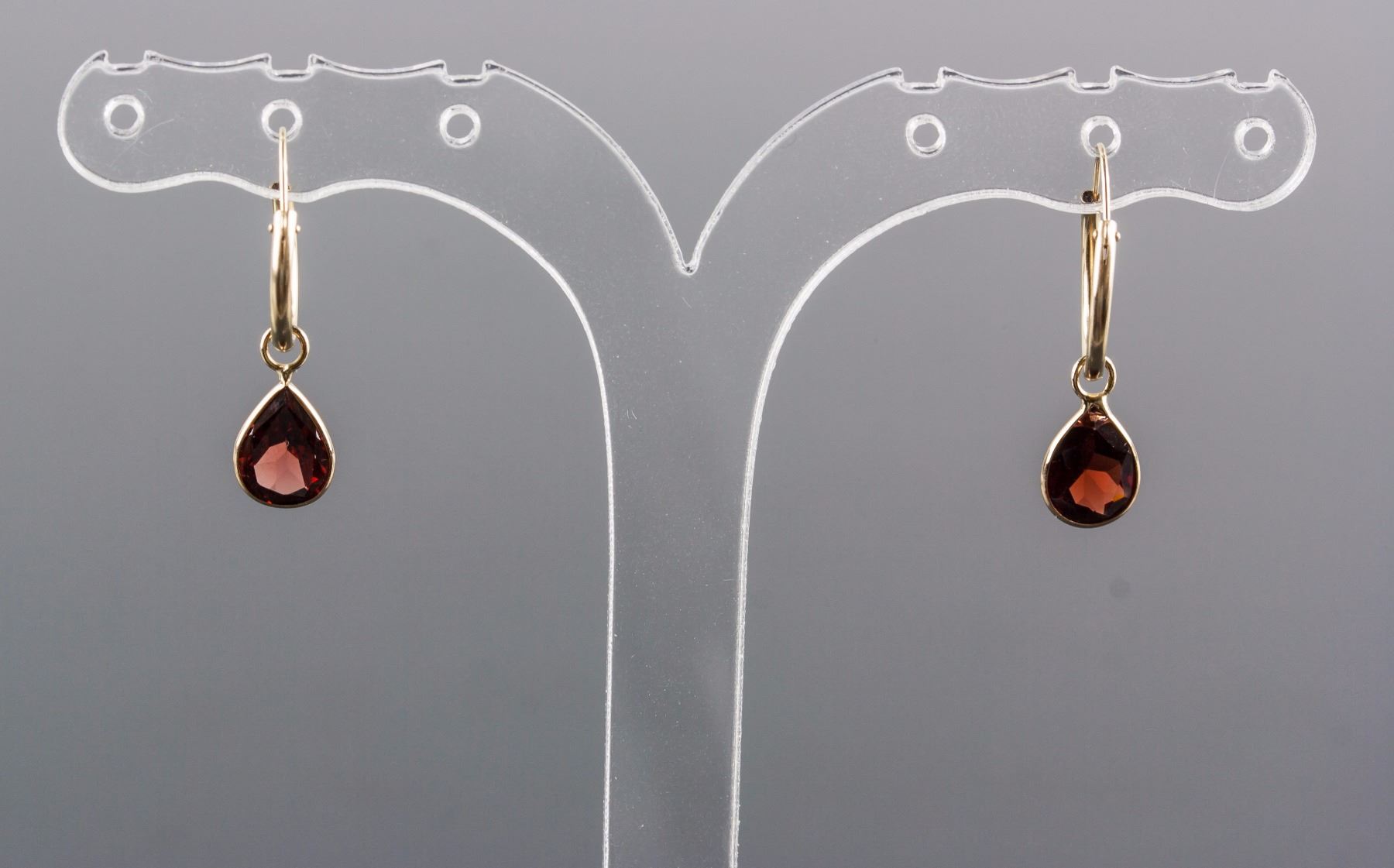 Stamped 14k yellow gold earrings; set with 2.35ct pear shaped pinkish red garnet; certified replacement value $450; 0.83 grams; Stamped 14k yellow gold pendant; set with 2.50ct square cut yellow citrine with 0.01ct diamond bail; certified replacement value $598; 0.80 grams