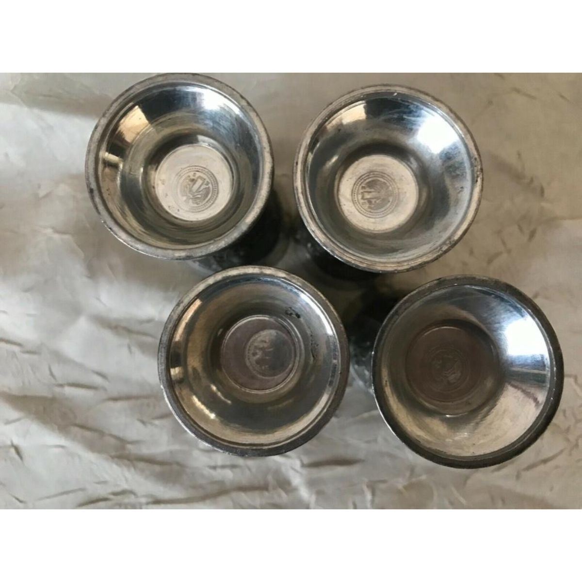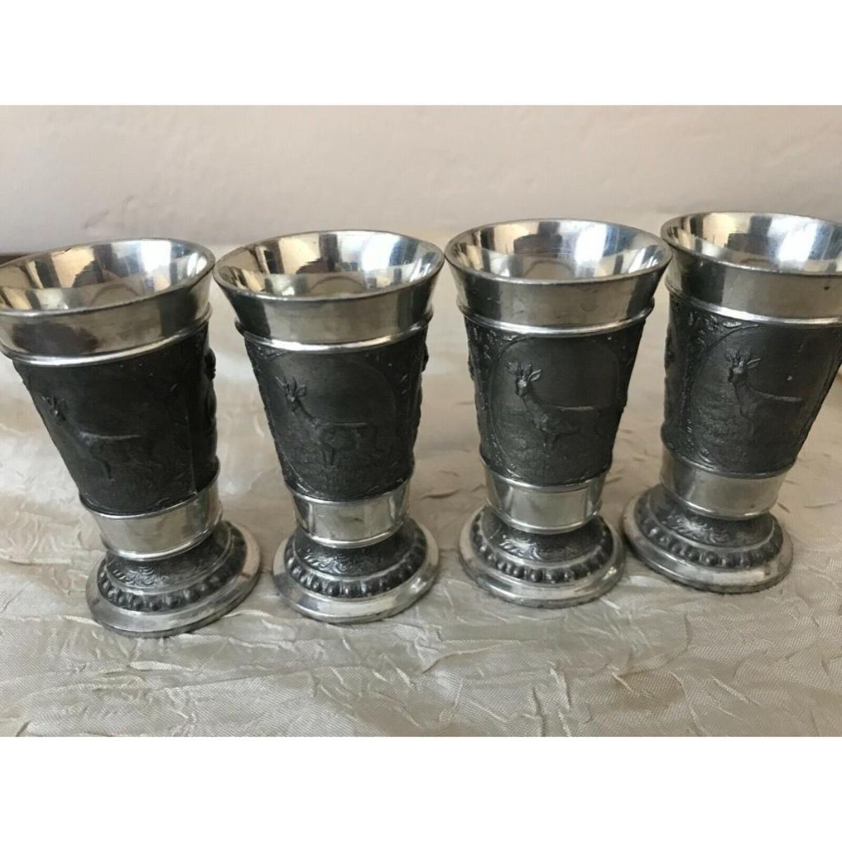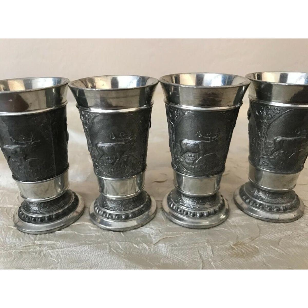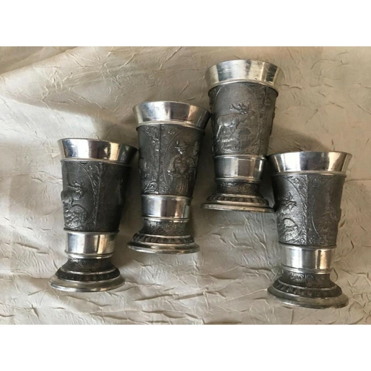 Set of four small & delicate German pewter goblets, liqueur shot glasses, with hunting scenes, buck, deer, hunter with wife in repousse. Stamped on the bottom with hallmark - ( crowned angel  & letters E S ) for Gnadental Zinn Eduard Scholl & Co. KG Michelfeld, Baden Wurttemberg, Deutschland. 2 3/4" H X 1 1/2" D Â
