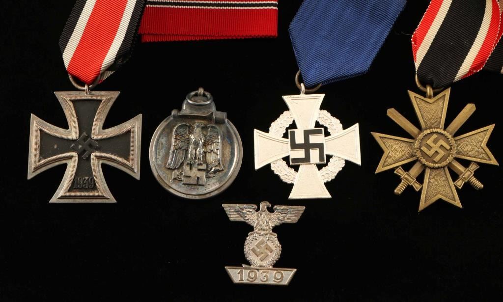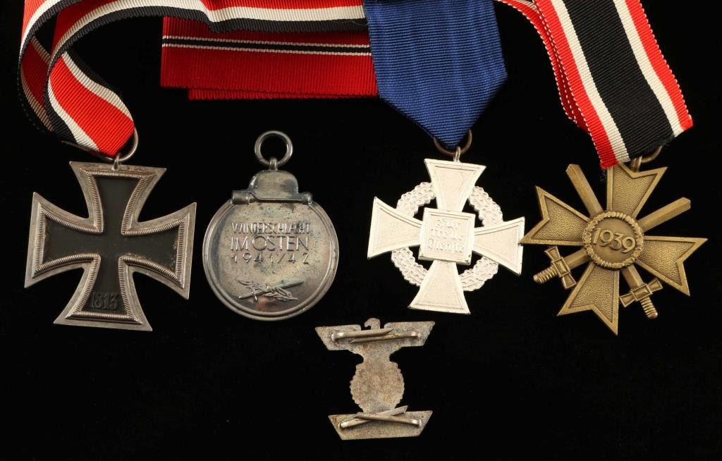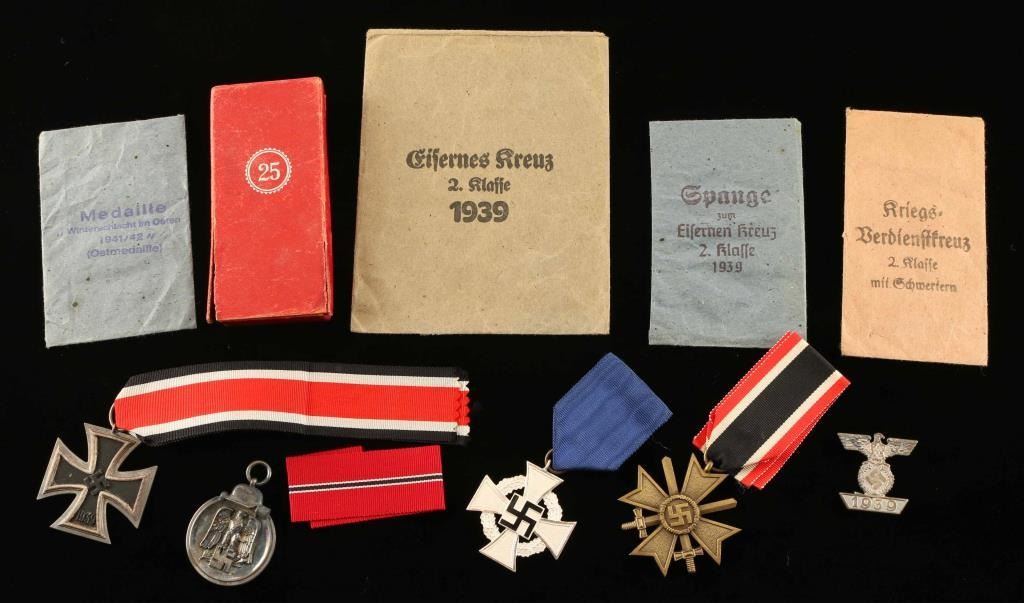 with issue envelopes, Iron Cross Second Class, Russian Front metal, War Merit Cross with swords, Spange Iron Cross Second Class, 25 Year Civil Service Award.